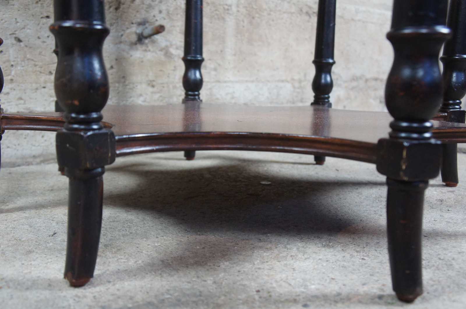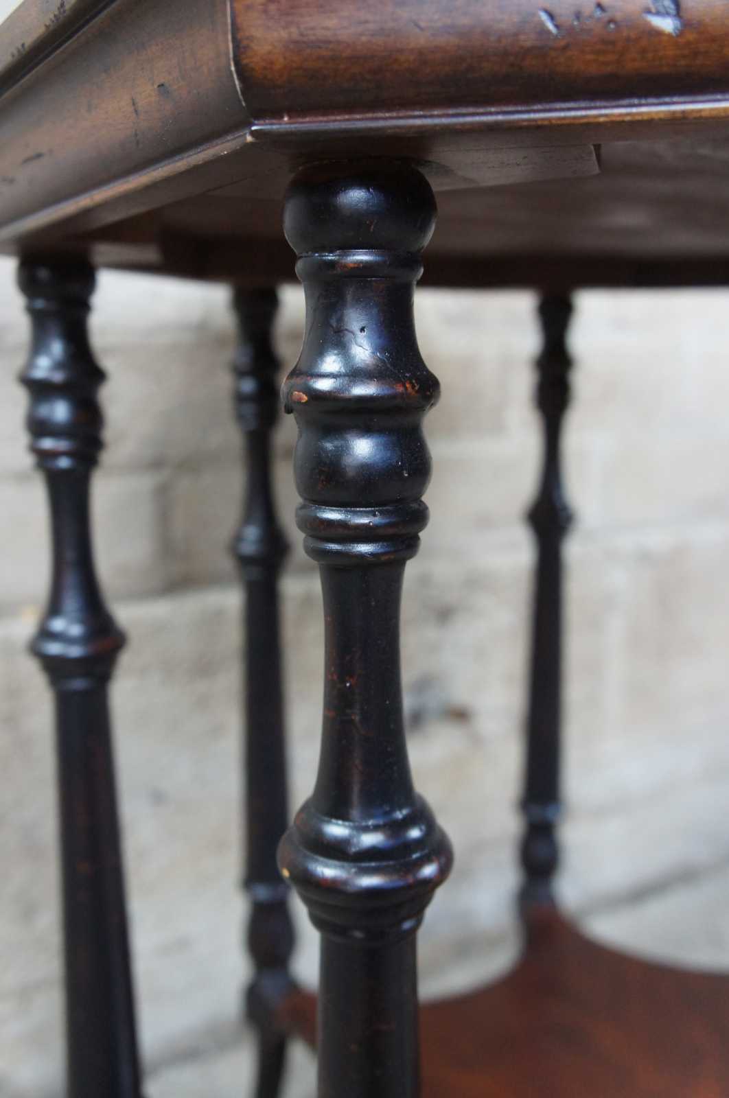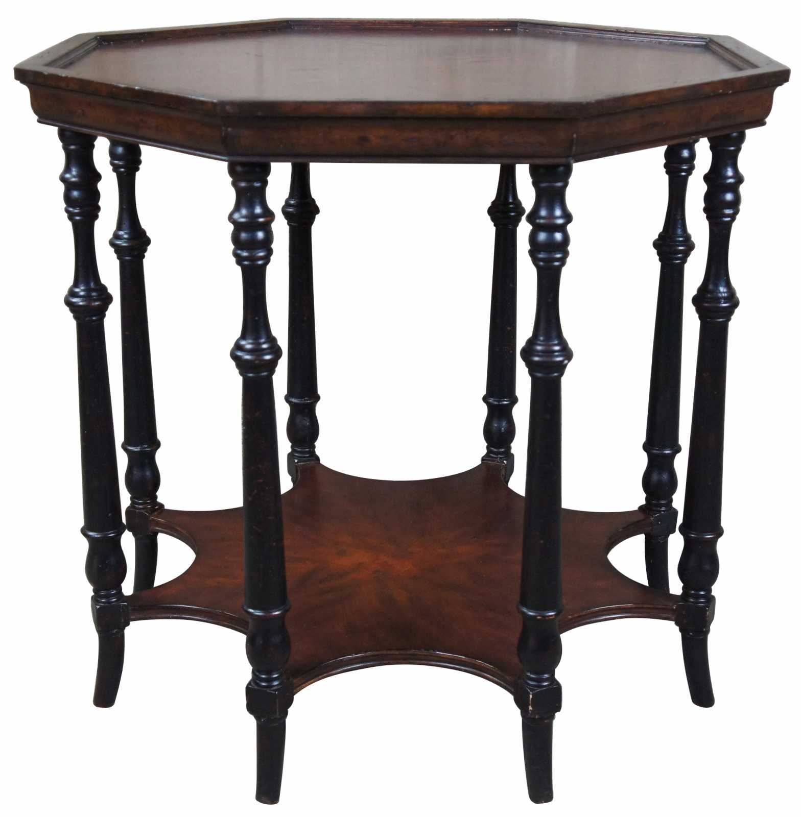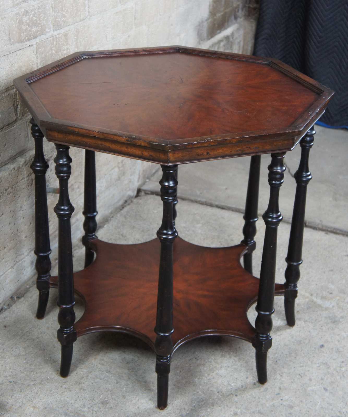 Late 20th century Theodore Alexander two tiered table. Features a matchbook veneered inset top over eight ebonized legs and lower spider web shaped shelf.
