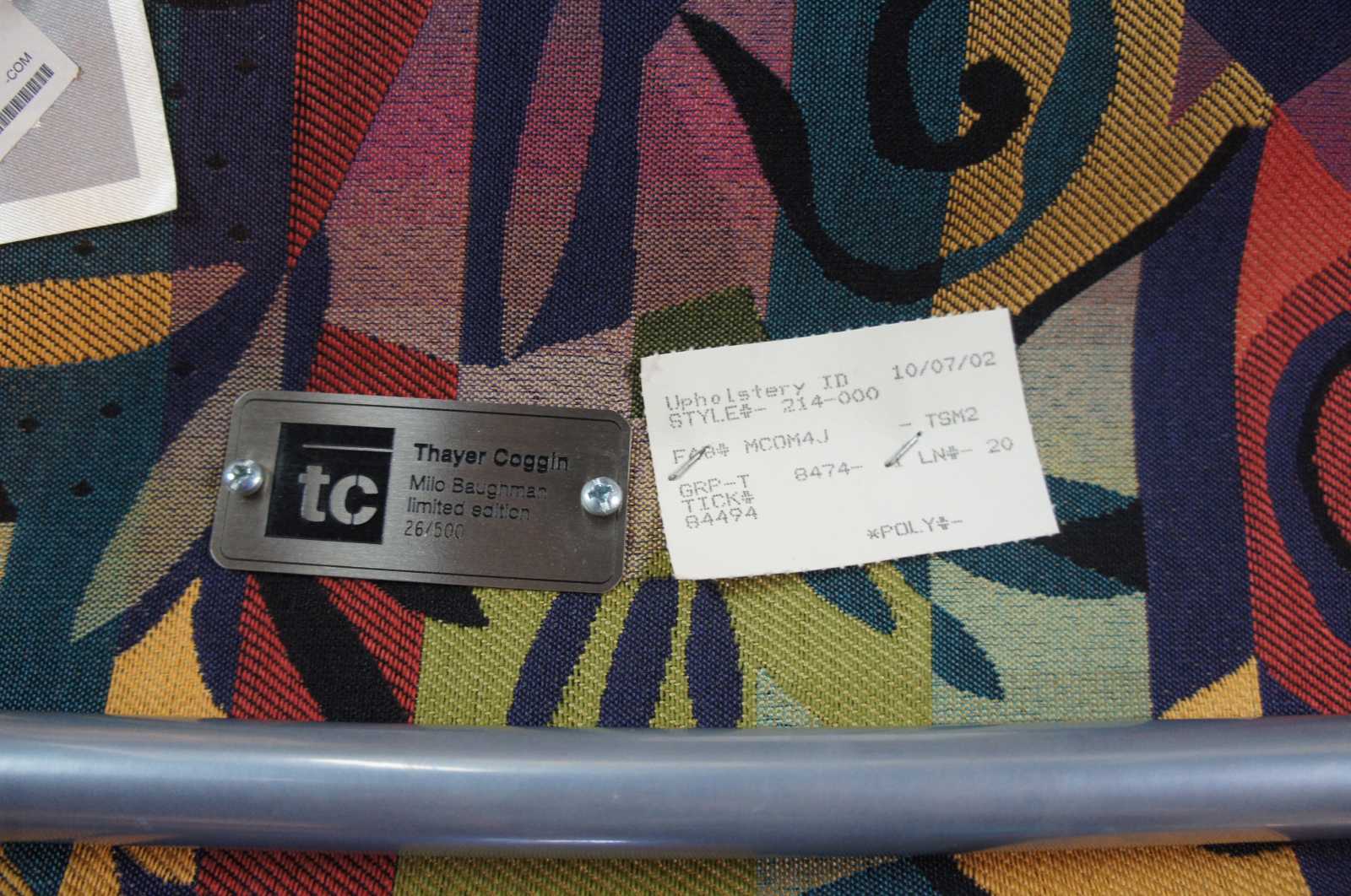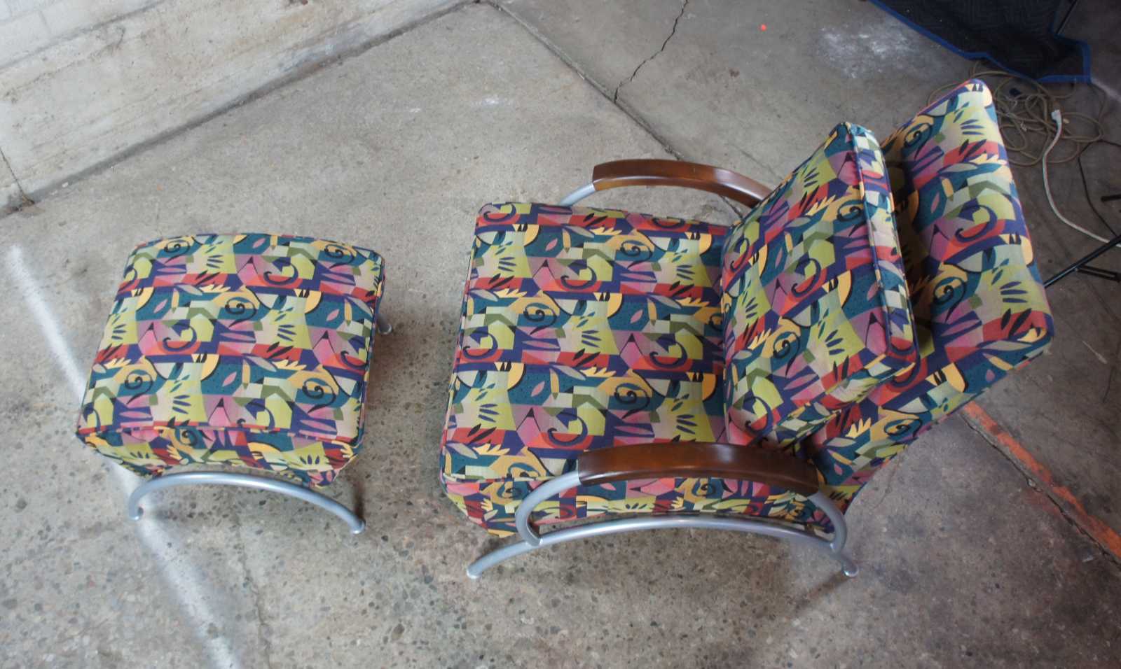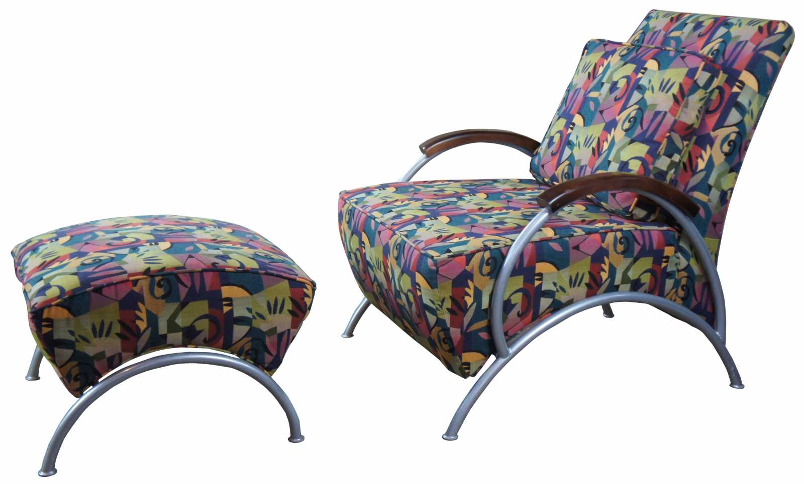 Pair of 2002 Milo Baughman for Thayer Coggin retro club or lounge chairs with ottomans. Features a sculptural frame with wooden arm rests and multi colored exotic fabric. Includes matching lumbar pillows and throw pillows. Labeled limited edition number 26 and 27 of 500 produced. Finished with brushed stainless steel frames and woo arm accents.