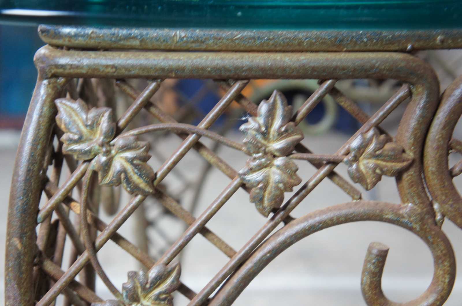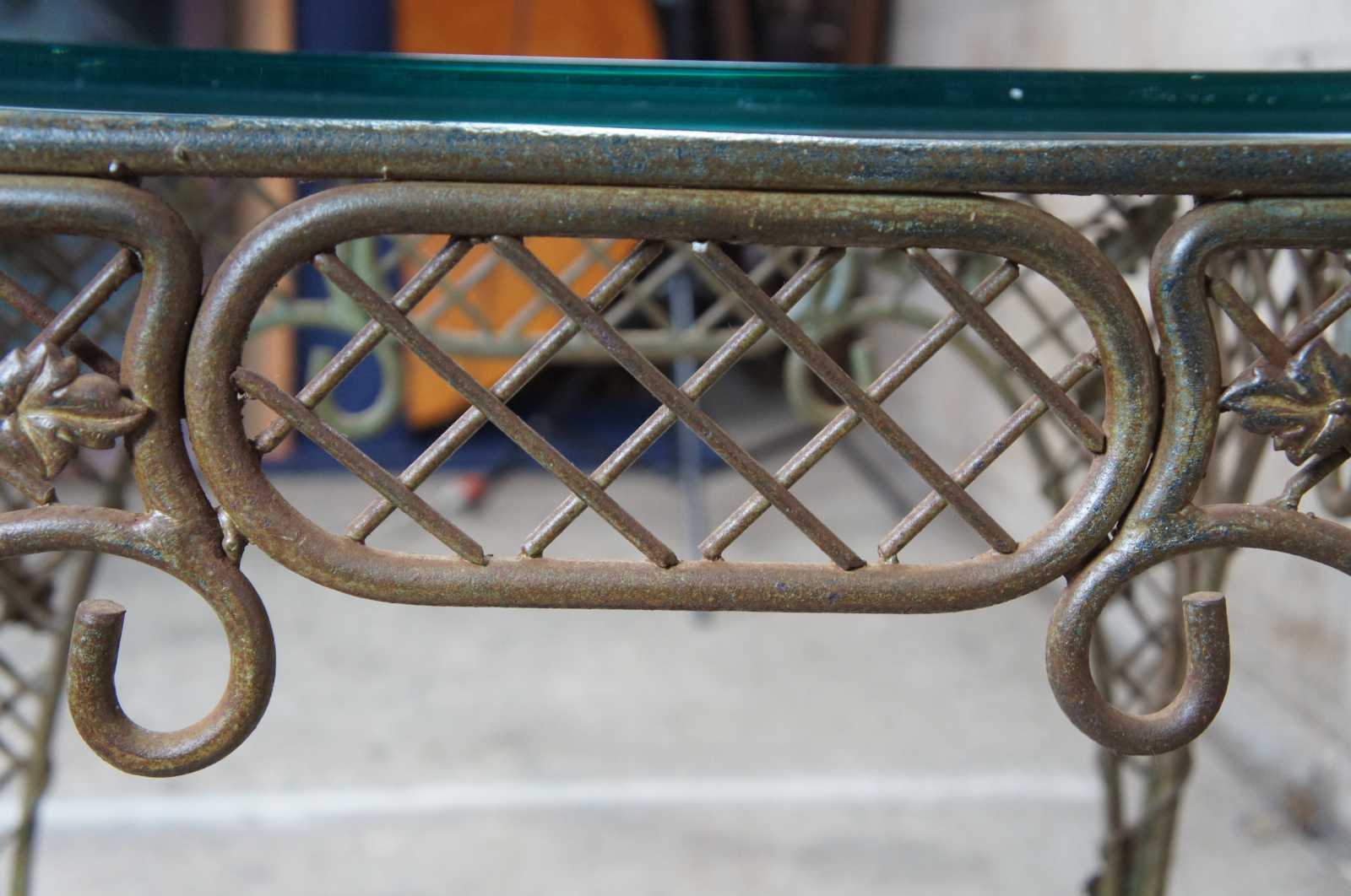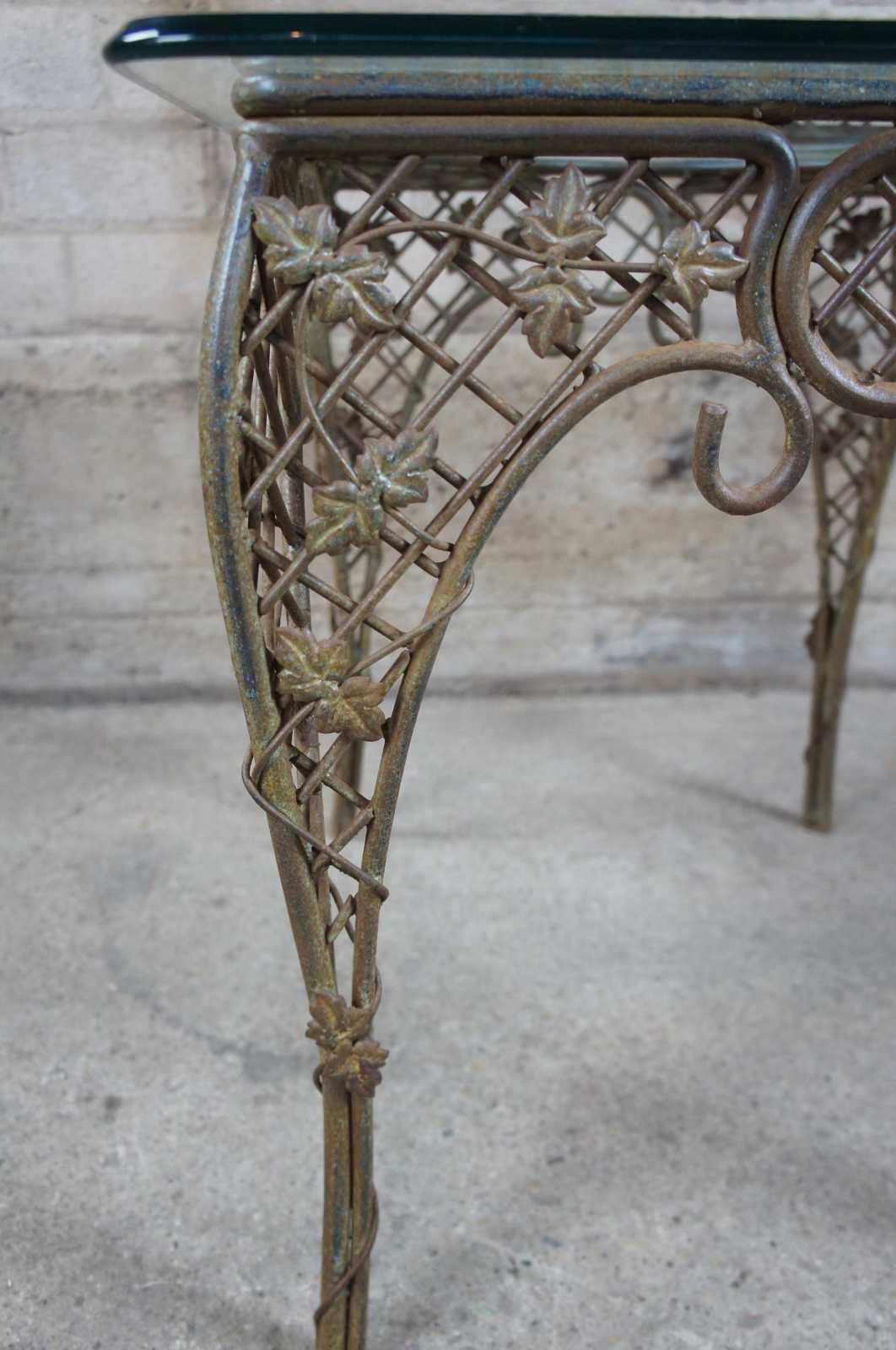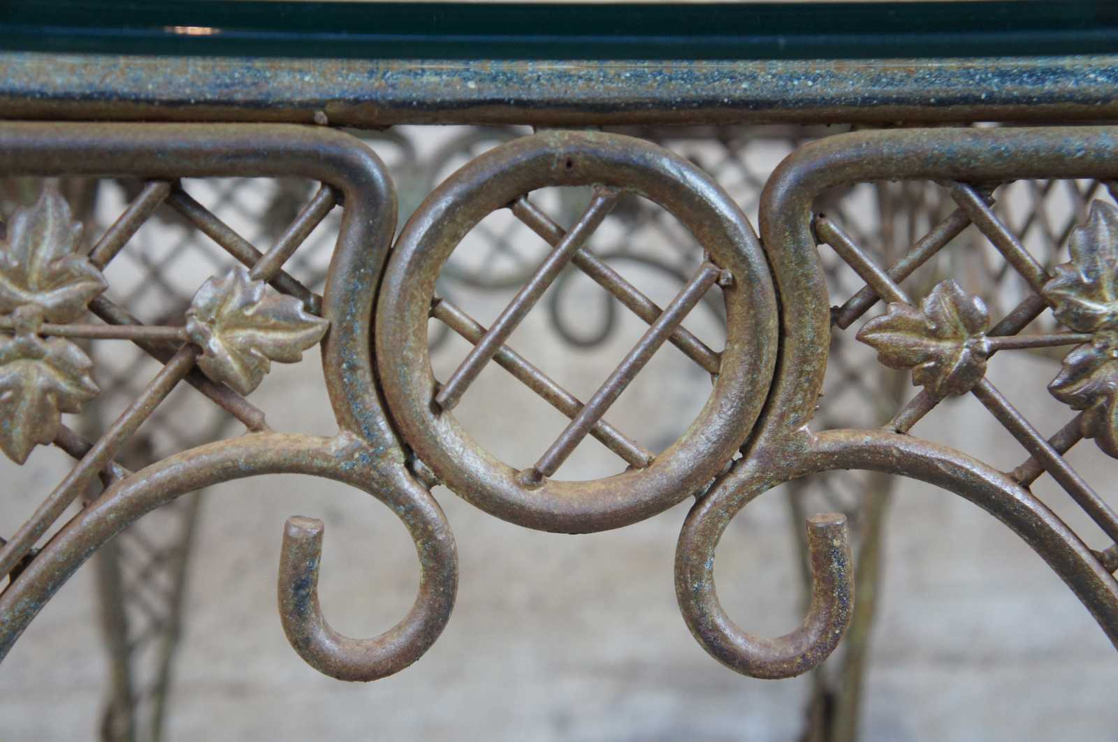 Heavy wrought iron French outdoor parlor table. Features a lattice network with maple leaves and scrolled accents and glass top.