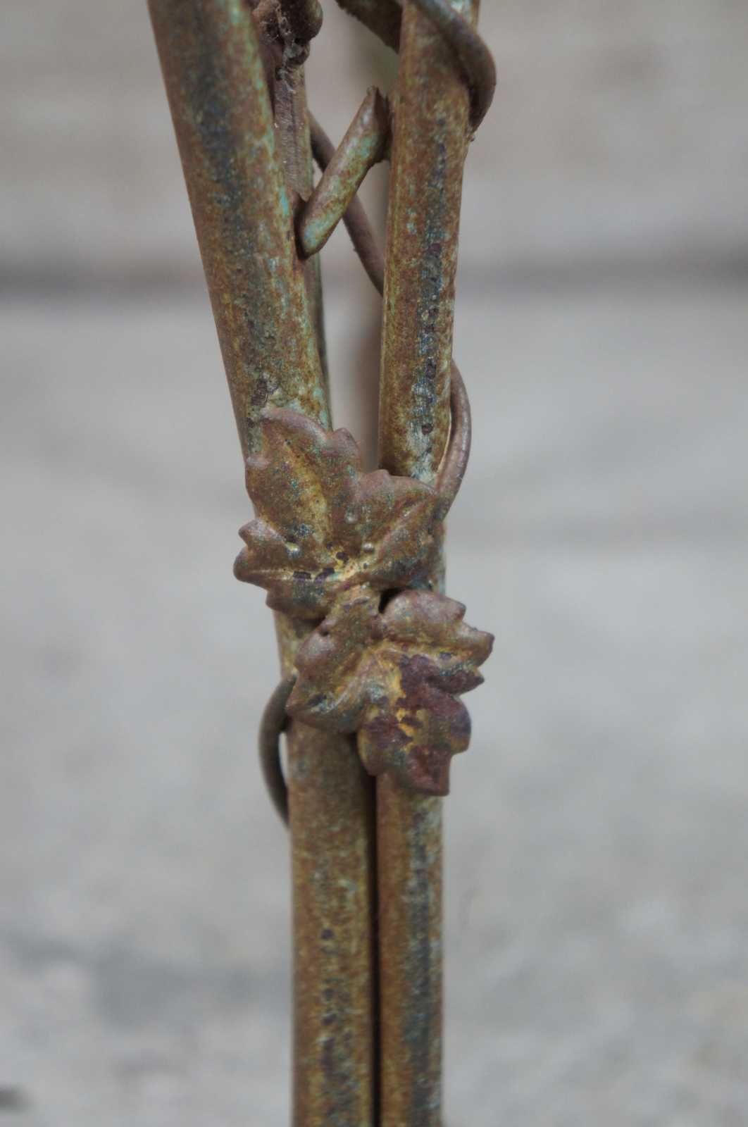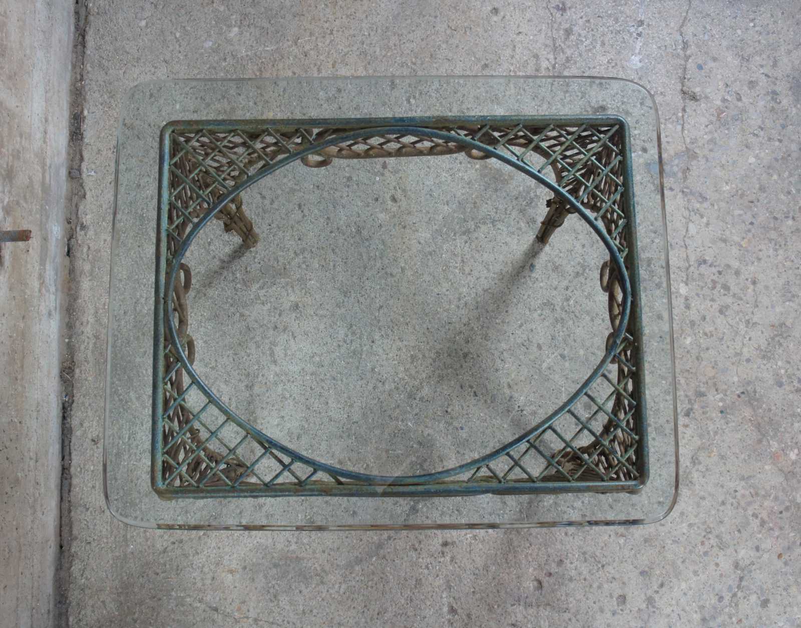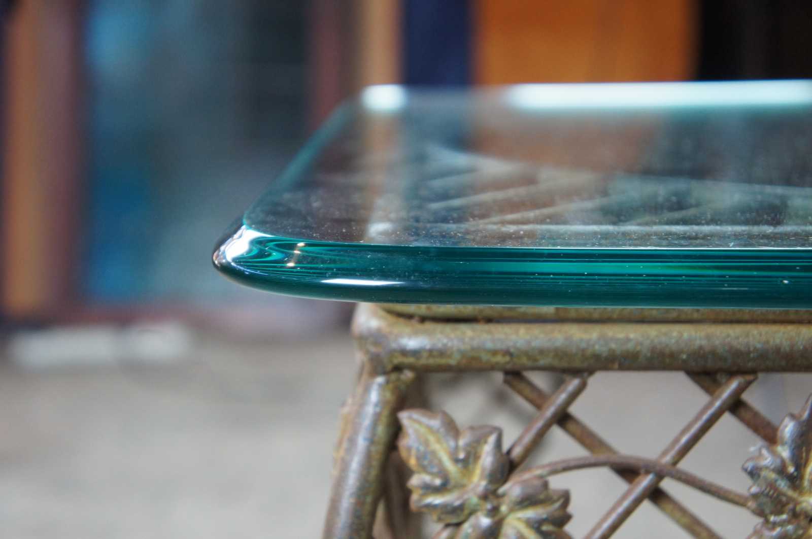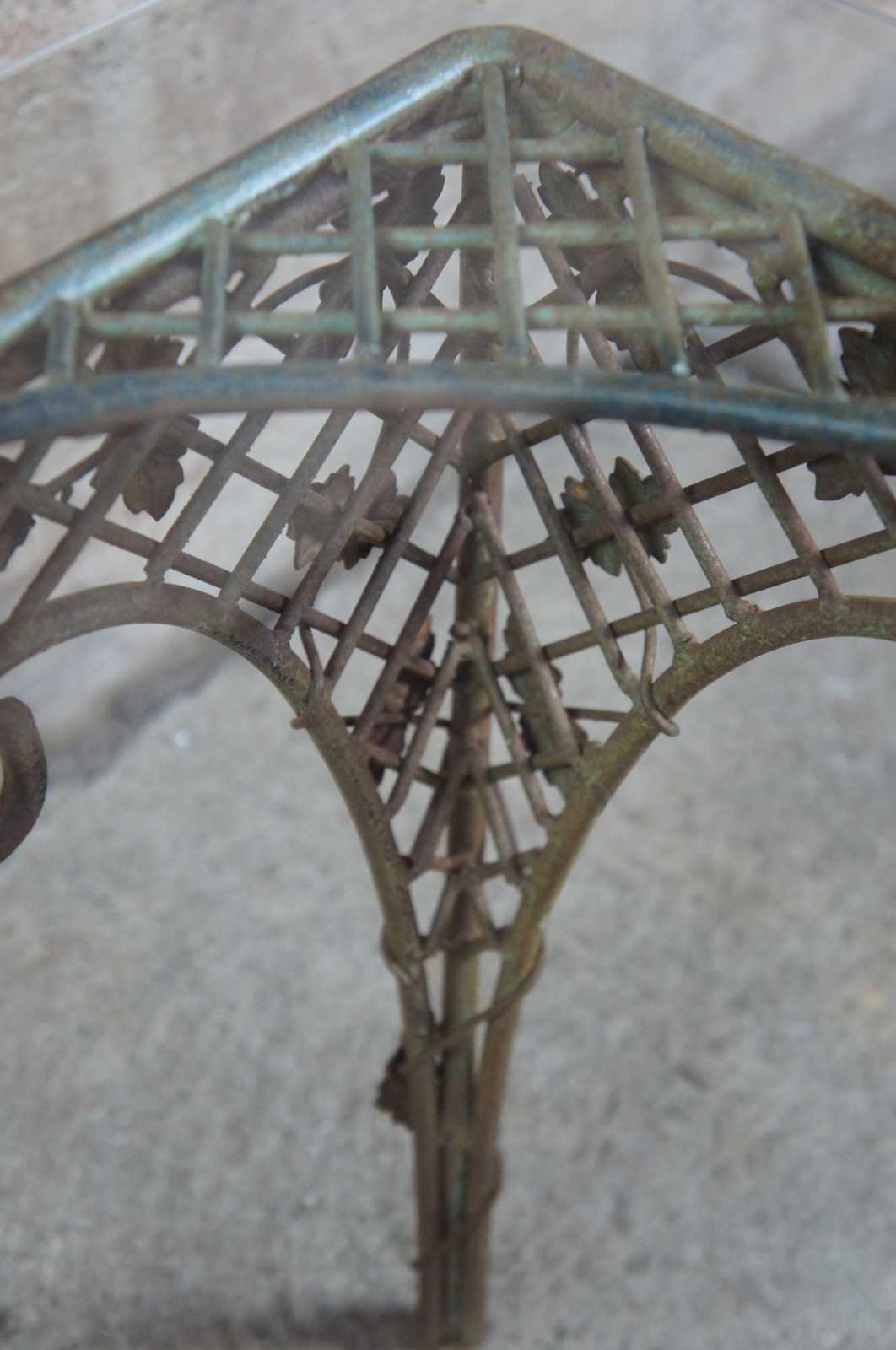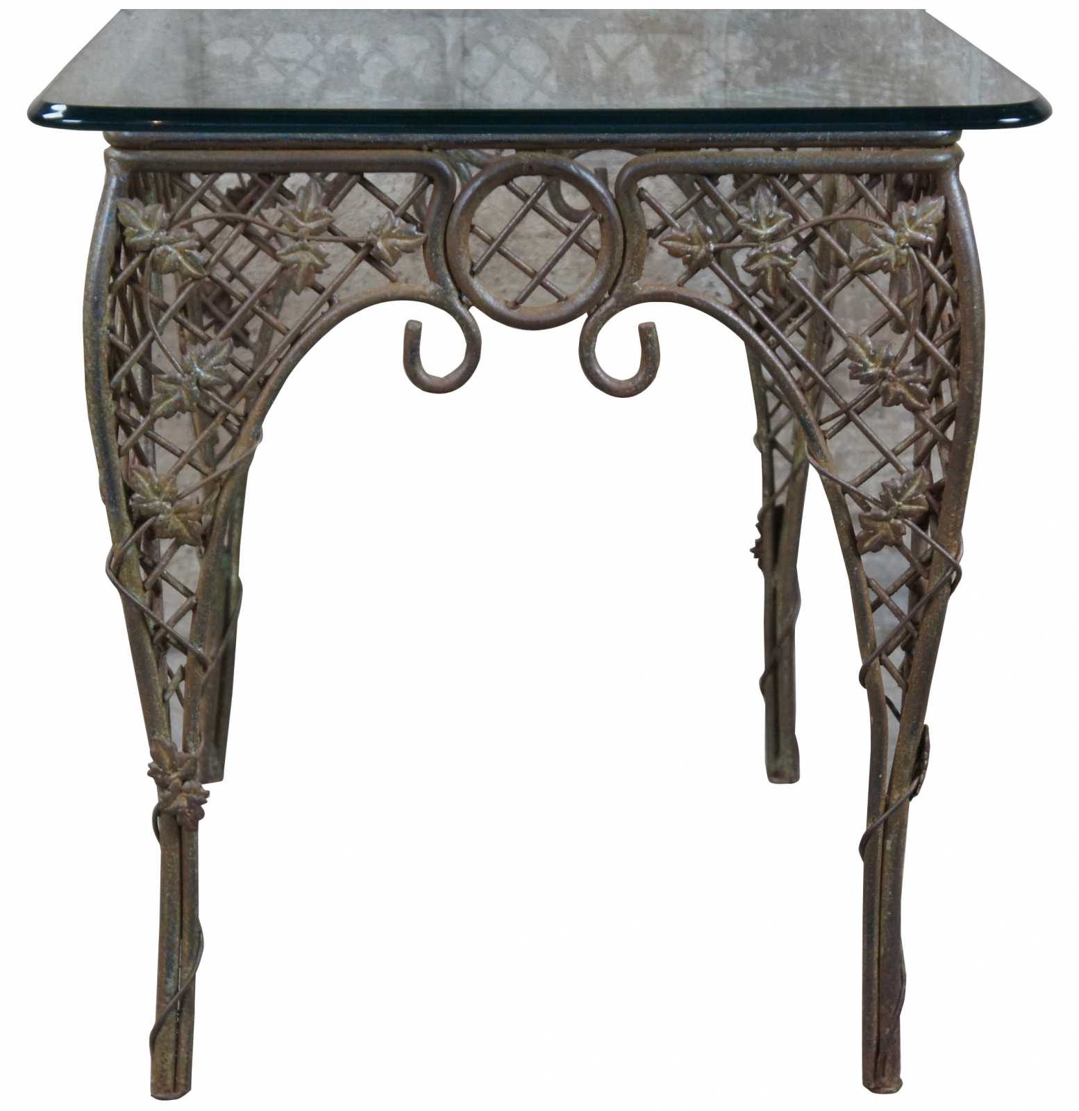 Heavy wrought iron French outdoor parlor table. Features a lattice network with maple leaves and scrolled accents and glass top.