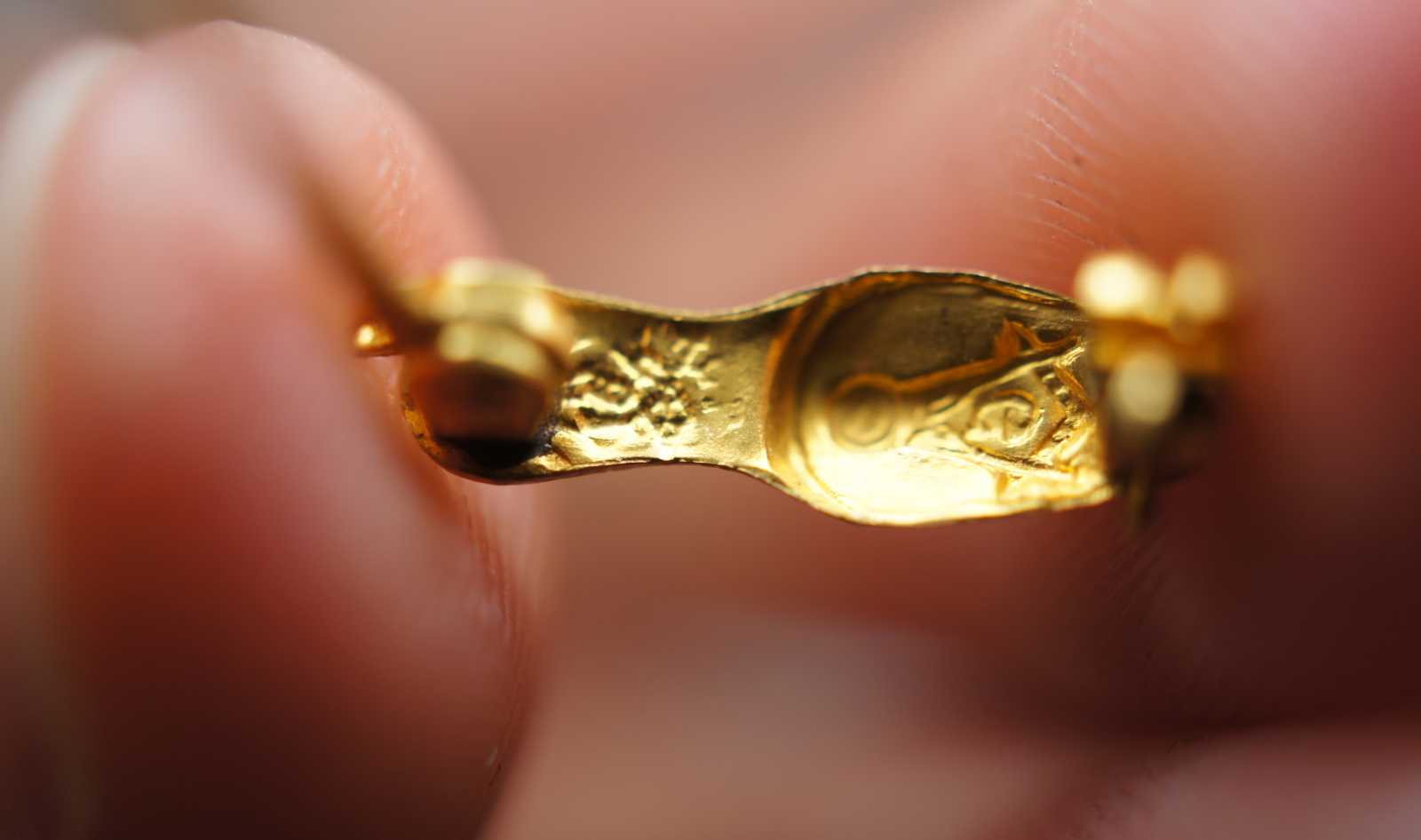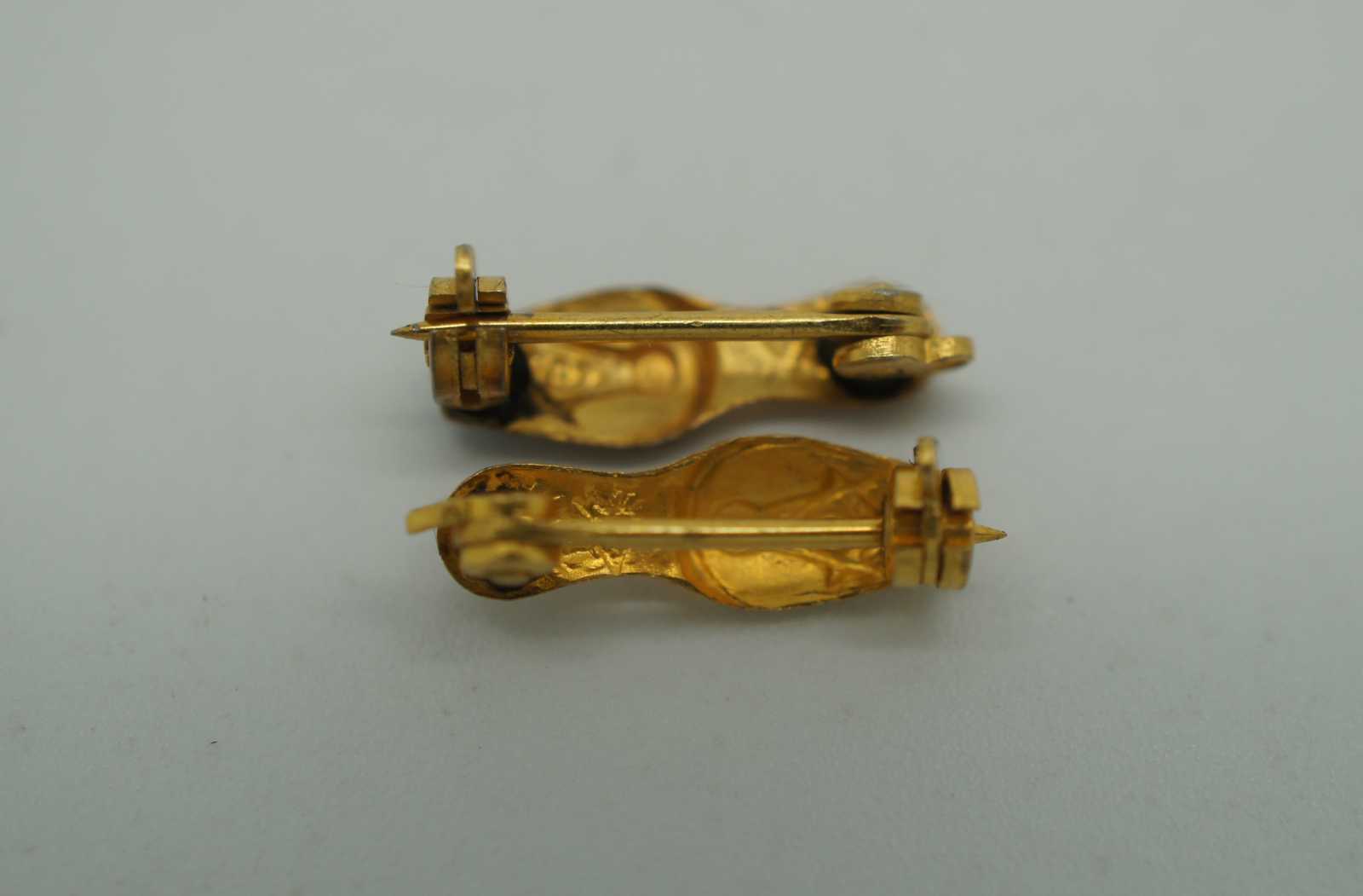 Pair of vintage 10k yellow gold straight back Scottish Rite/Freemason/Masonic lapel pins featuring blue enamel around the traditional compass and ruler with the letter G and engraved All Seeing Eye.