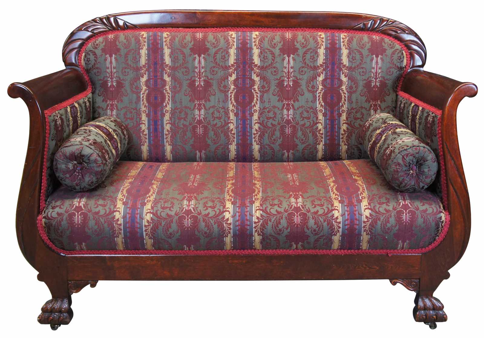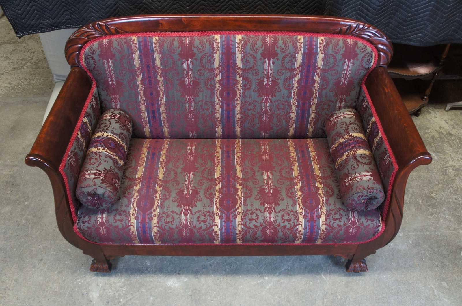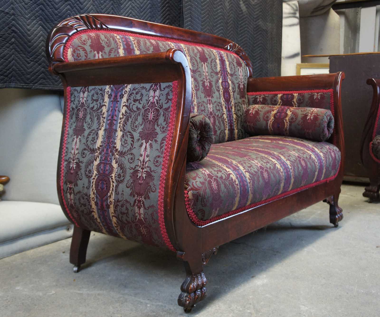 Featured is a two piece parlor set. Made from Mahogany with American Empire styling. Includes a harpe shape with high flared arms, carved back, and paw feet. Upholstered in a traditional French fabric with reds, blues, greens and gold accents. Includes two bolster pillows and one round side pillow. Metal plate label along the back base.