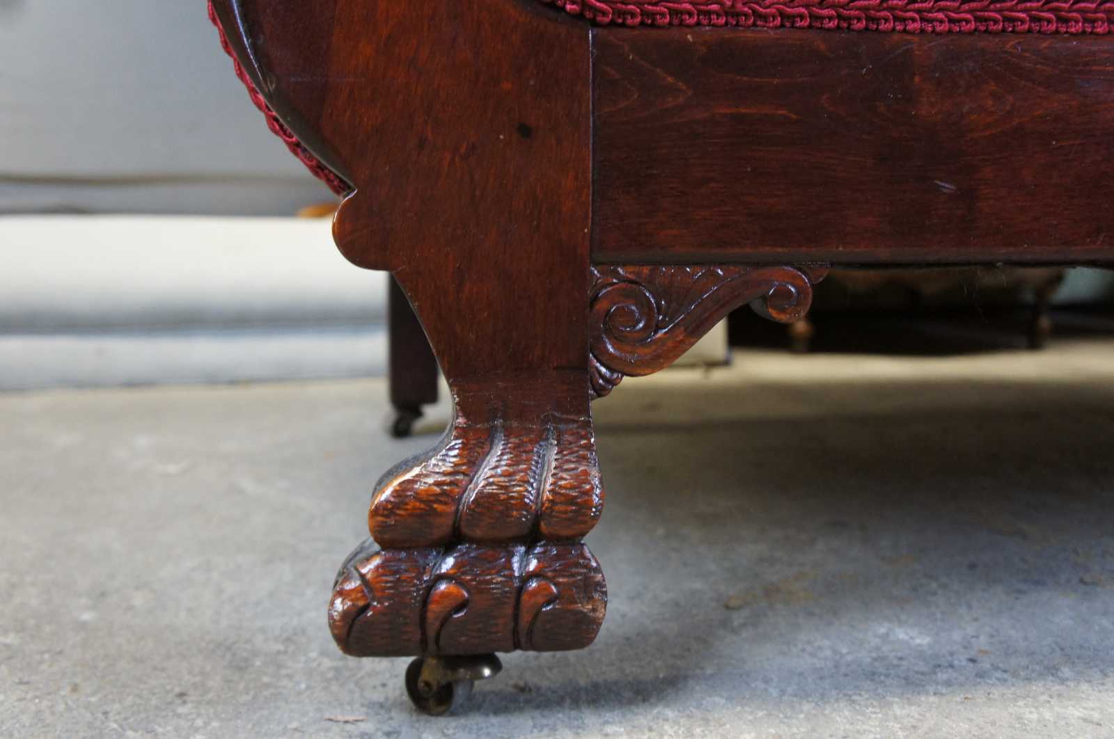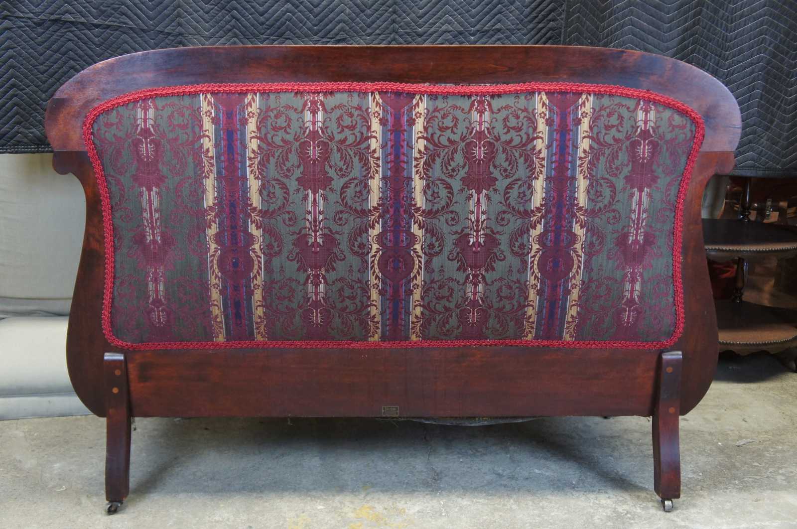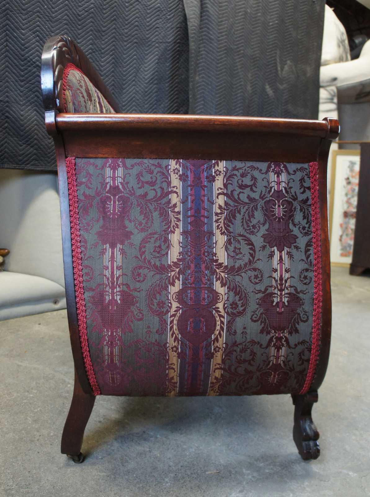 Featured is a two piece parlor set. Made from Mahogany with American Empire styling. Includes a harpe shape with high flared arms, carved back, and paw feet. Upholstered in a traditional French fabric with reds, blues, greens and gold accents. Includes two bolster pillows and one round side pillow. Metal plate label along the back base.