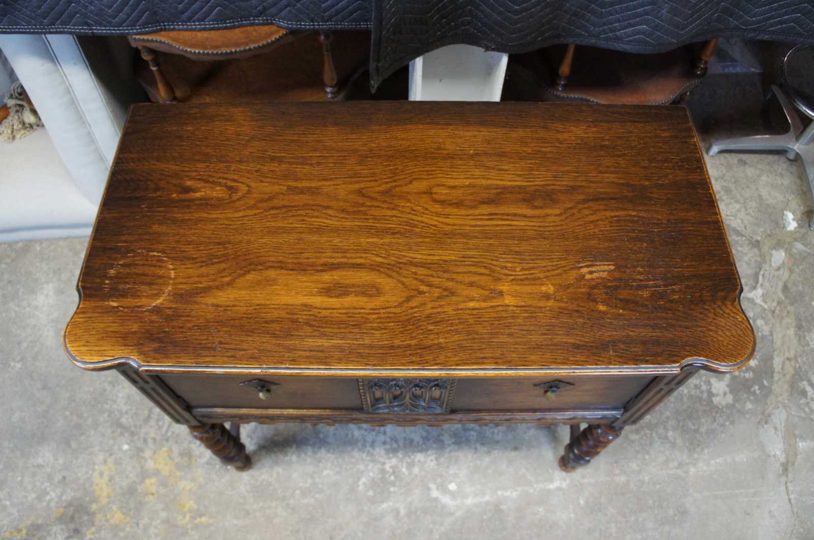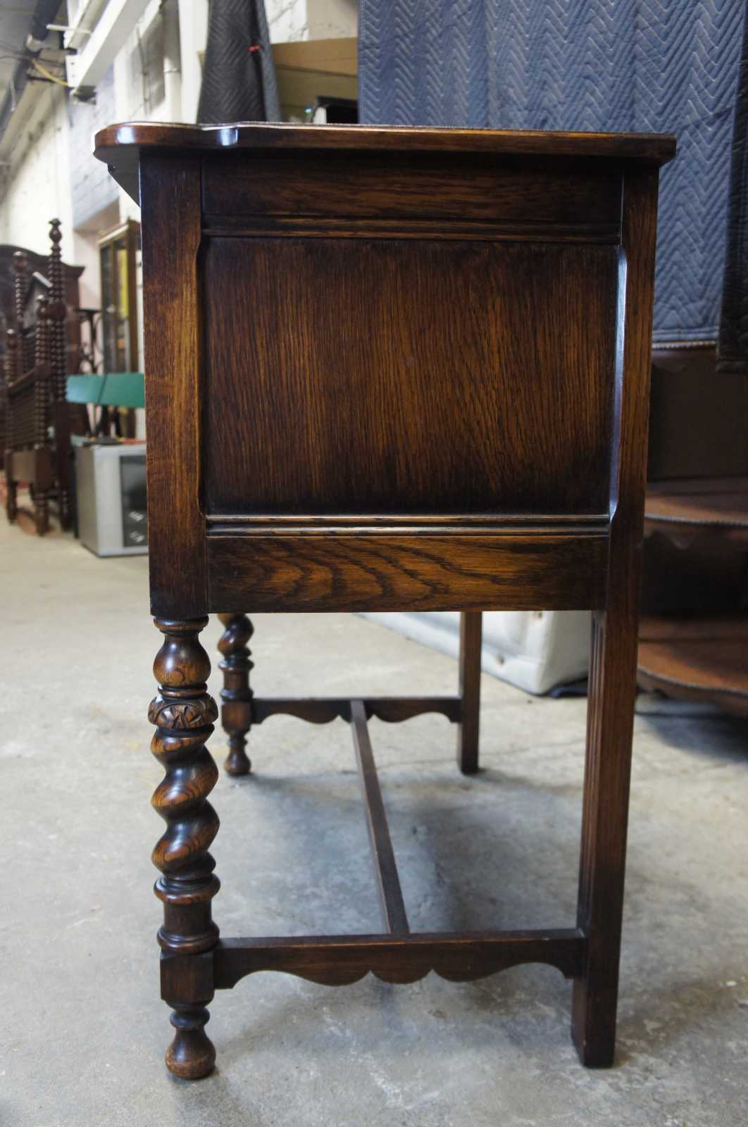 Early 20th century Jacobean or Spanish Revival buffet or altar cabinet. Made from oak with raised carvings between two cabinet doors. The cabinet is supported by four legs with barley twisted accents and a trestle base.