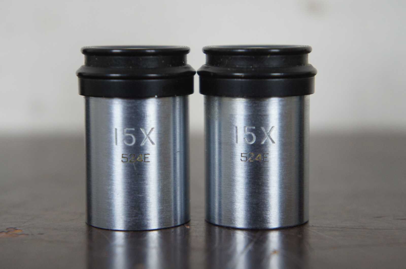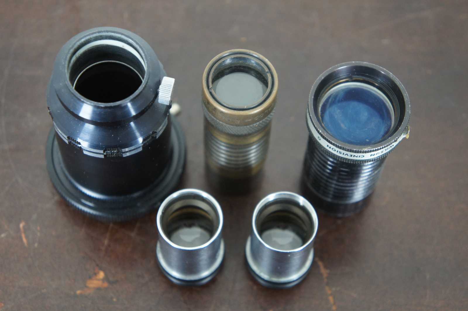 Vintage Kalt T-Mount Microscope Adapter for film camera with original box and four assorted microscope lenses – two unbranded 15x, 524E; one Graf Optical Co, 2 Inch Front; and one Buhl Optical Co, Wilson Cinevision G, 16mm f 2.0.