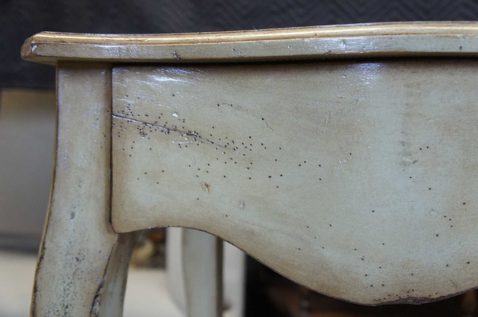 20th century reproduction of a French Oxbow console table. Features a painted oak finish with distressing, inset leather top and large drawer with lock and key. The table is supported by four long cabriole legs.