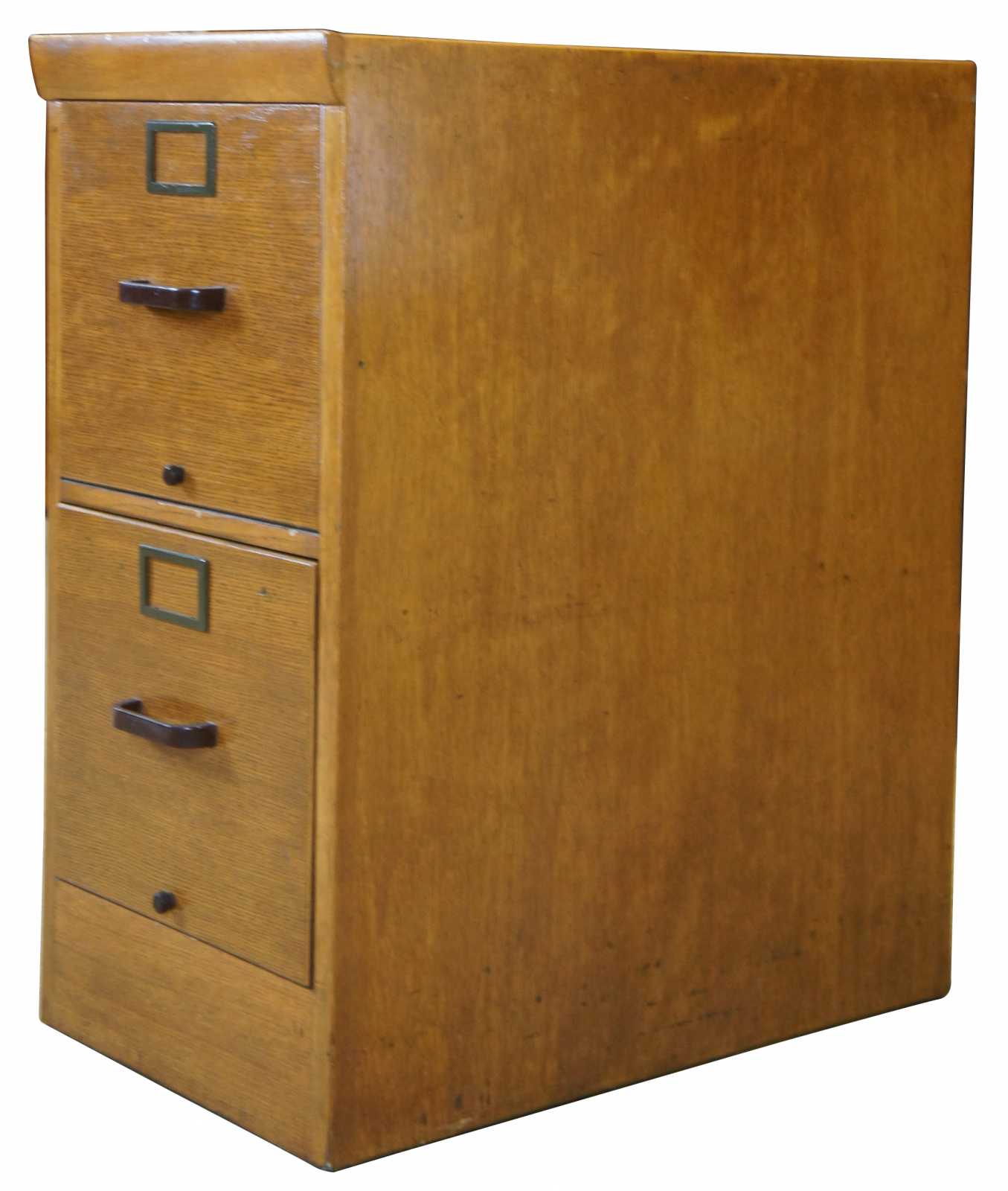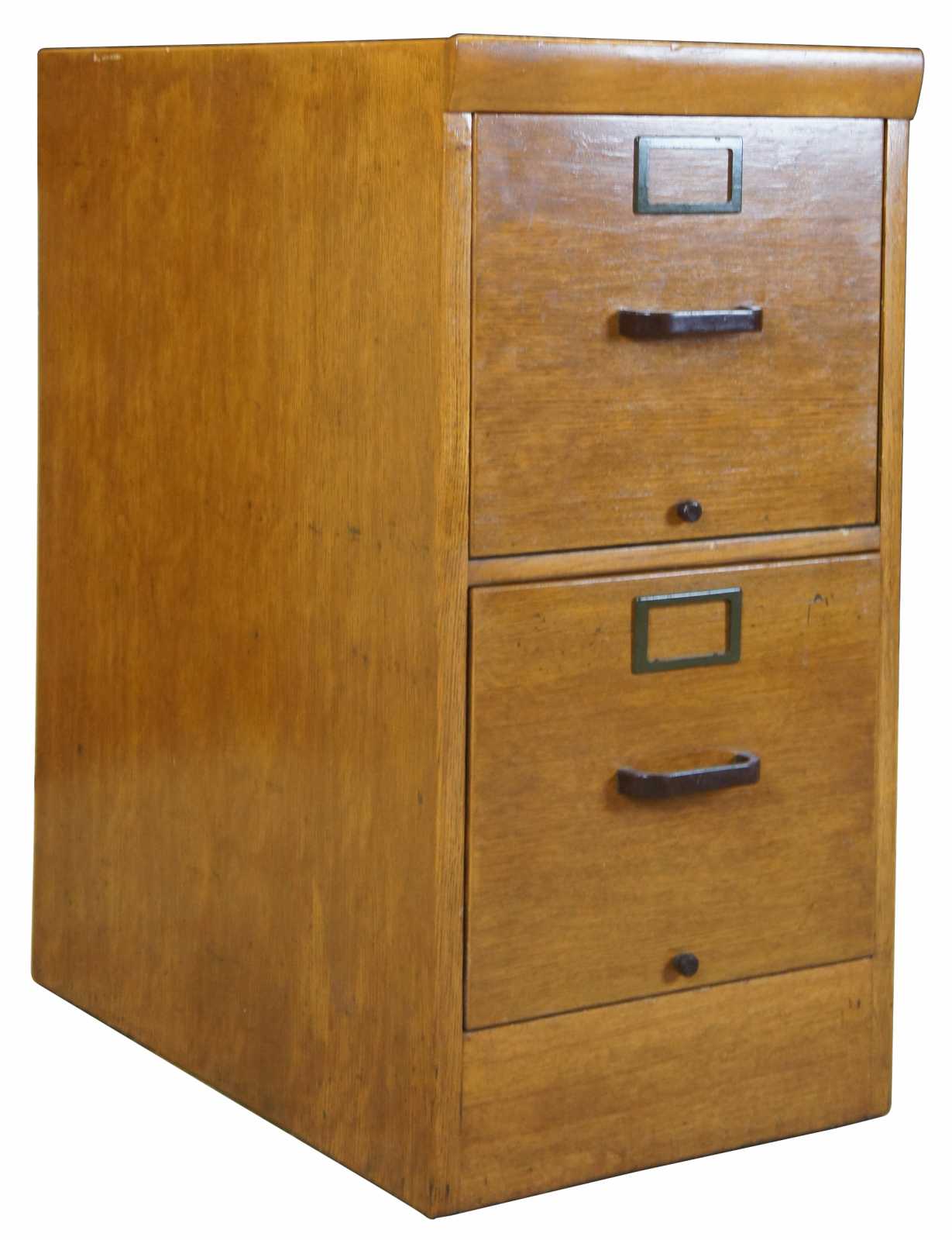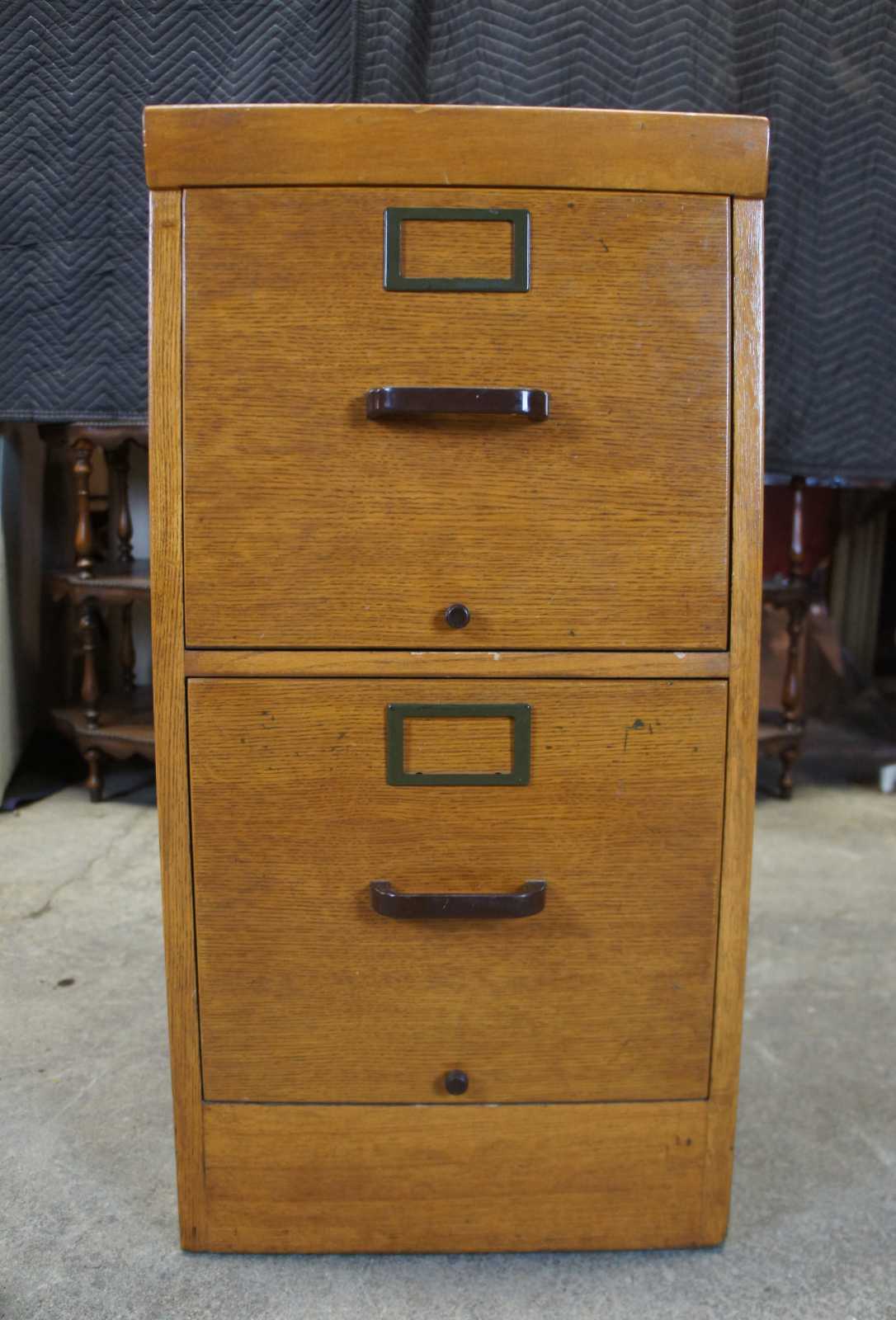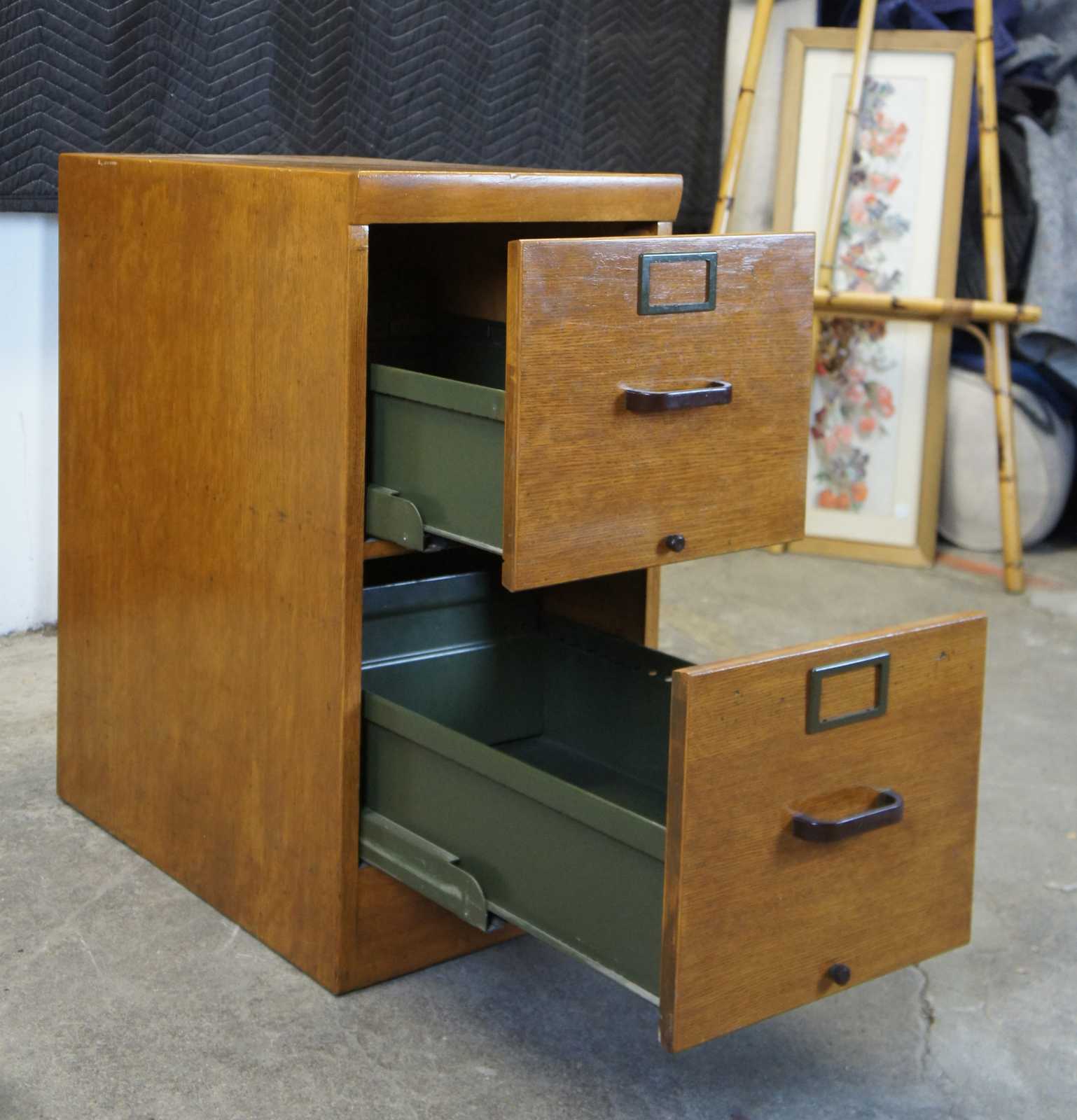 Circa 1940s oak file cabinet. Features two large drawers and metal interior.