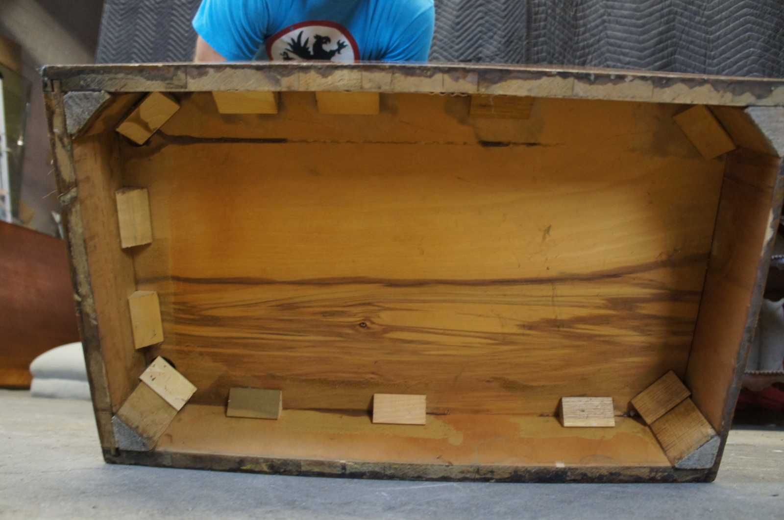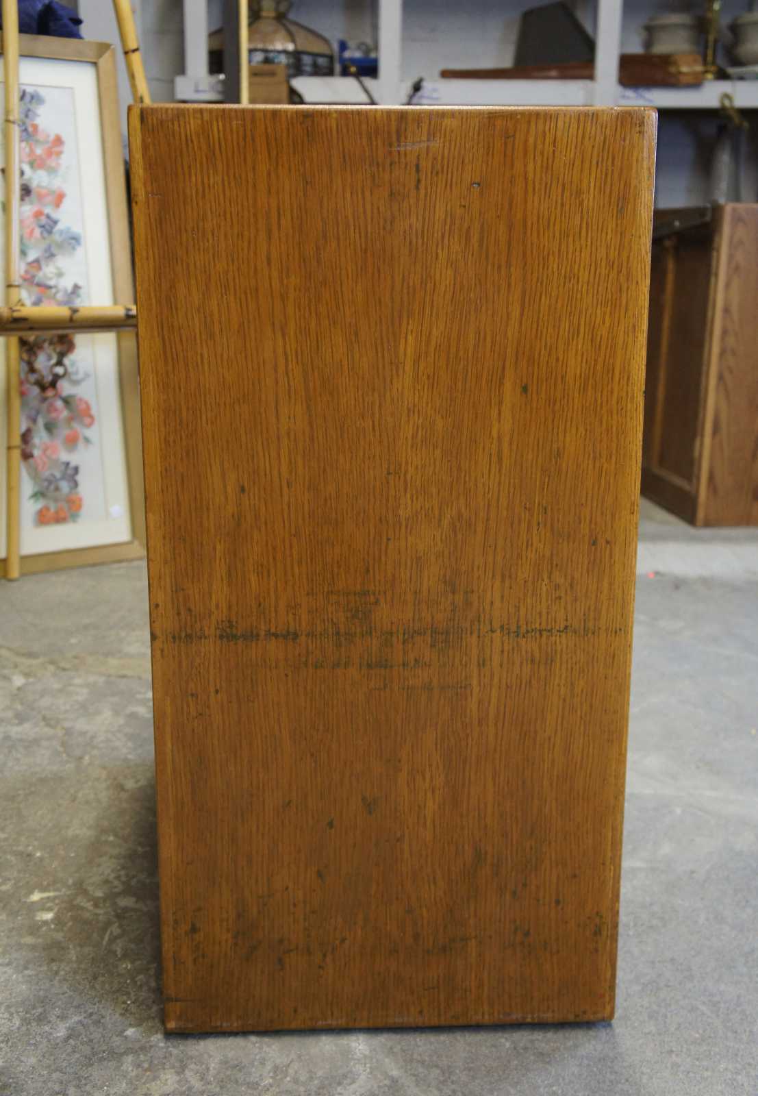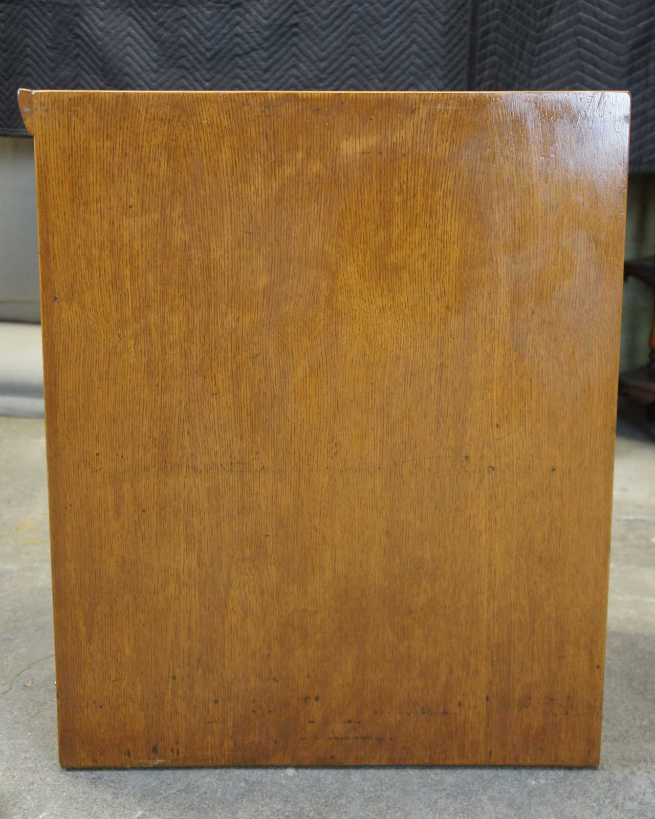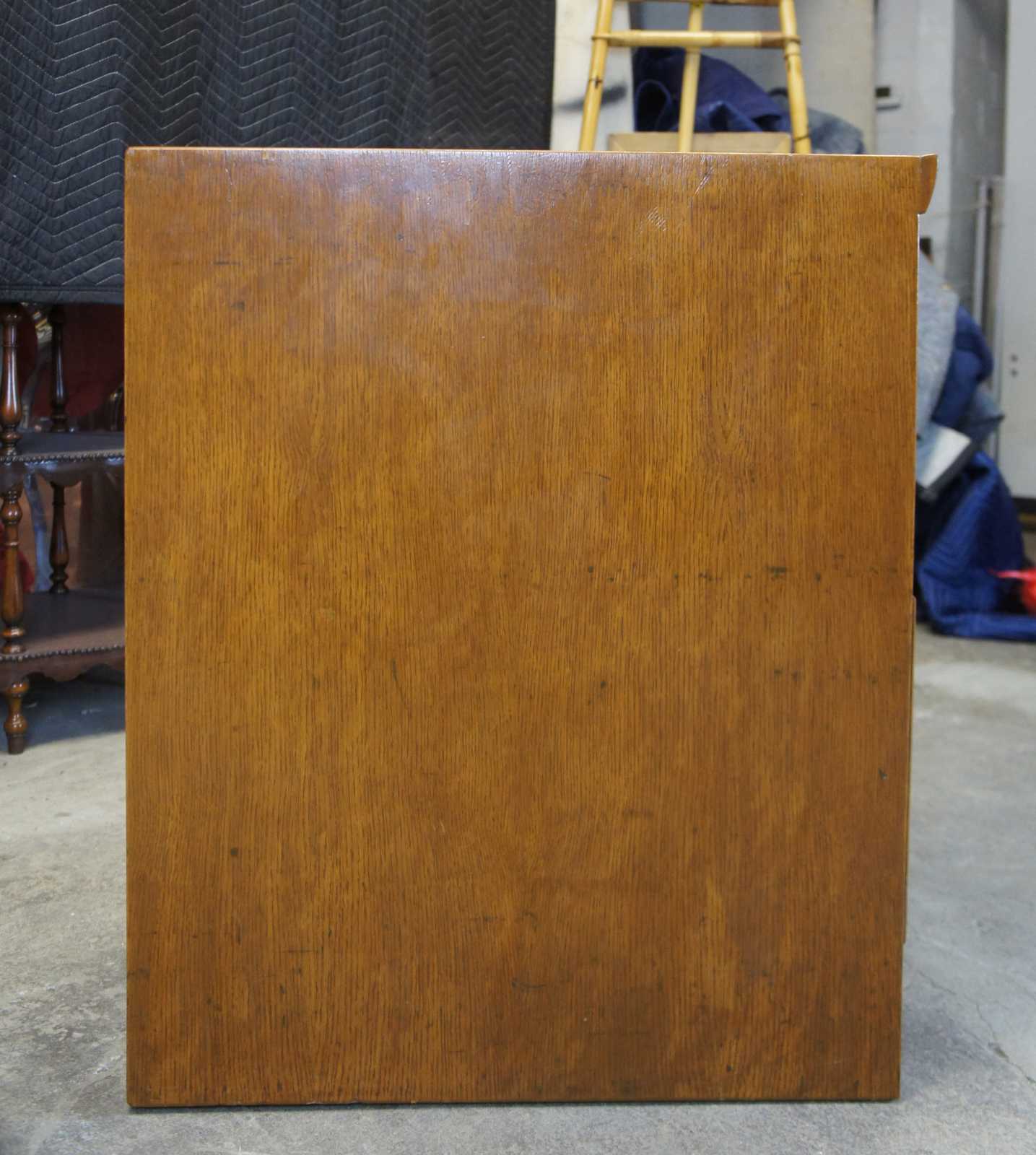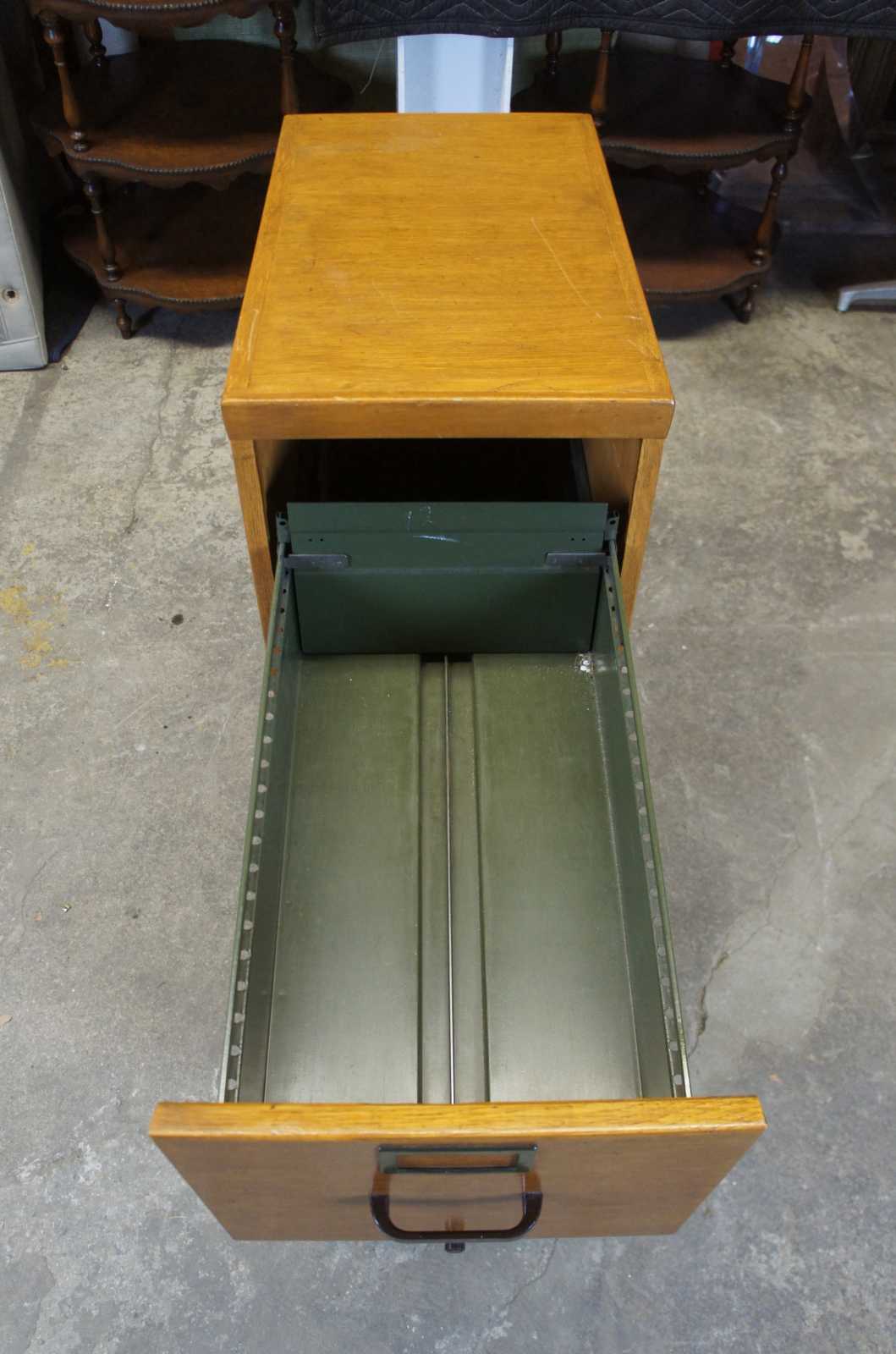 Circa 1940s oak file cabinet. Features two large drawers and metal interior.