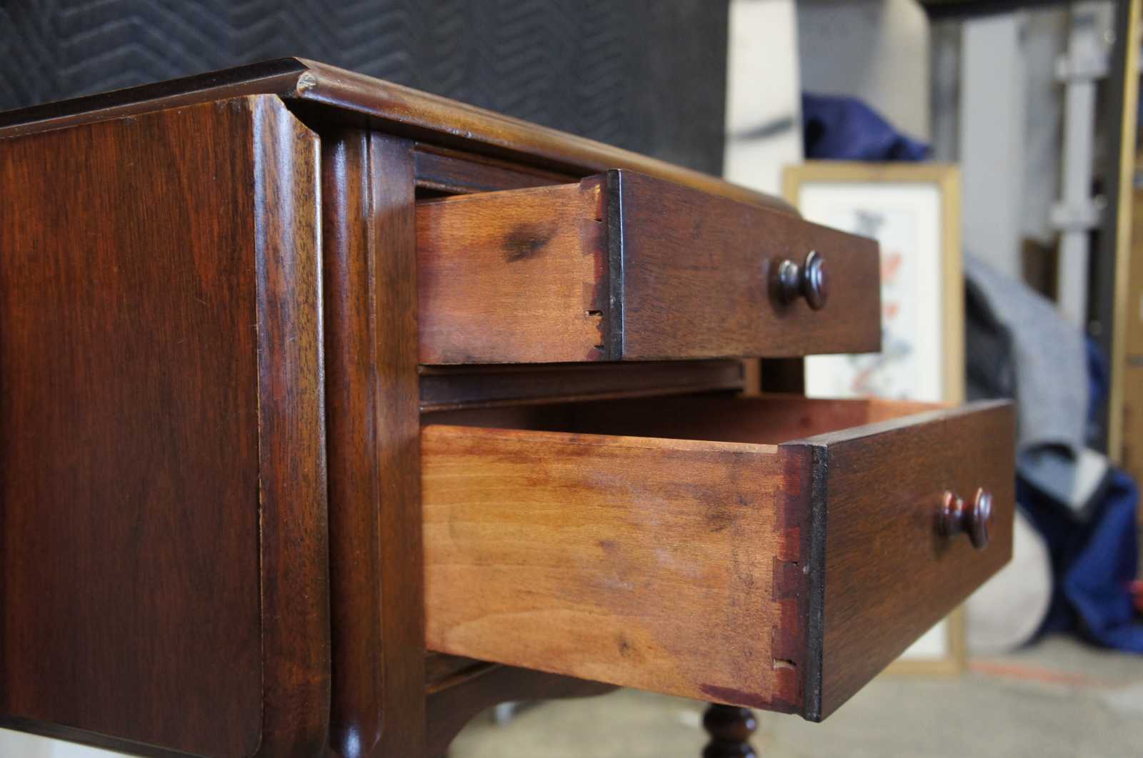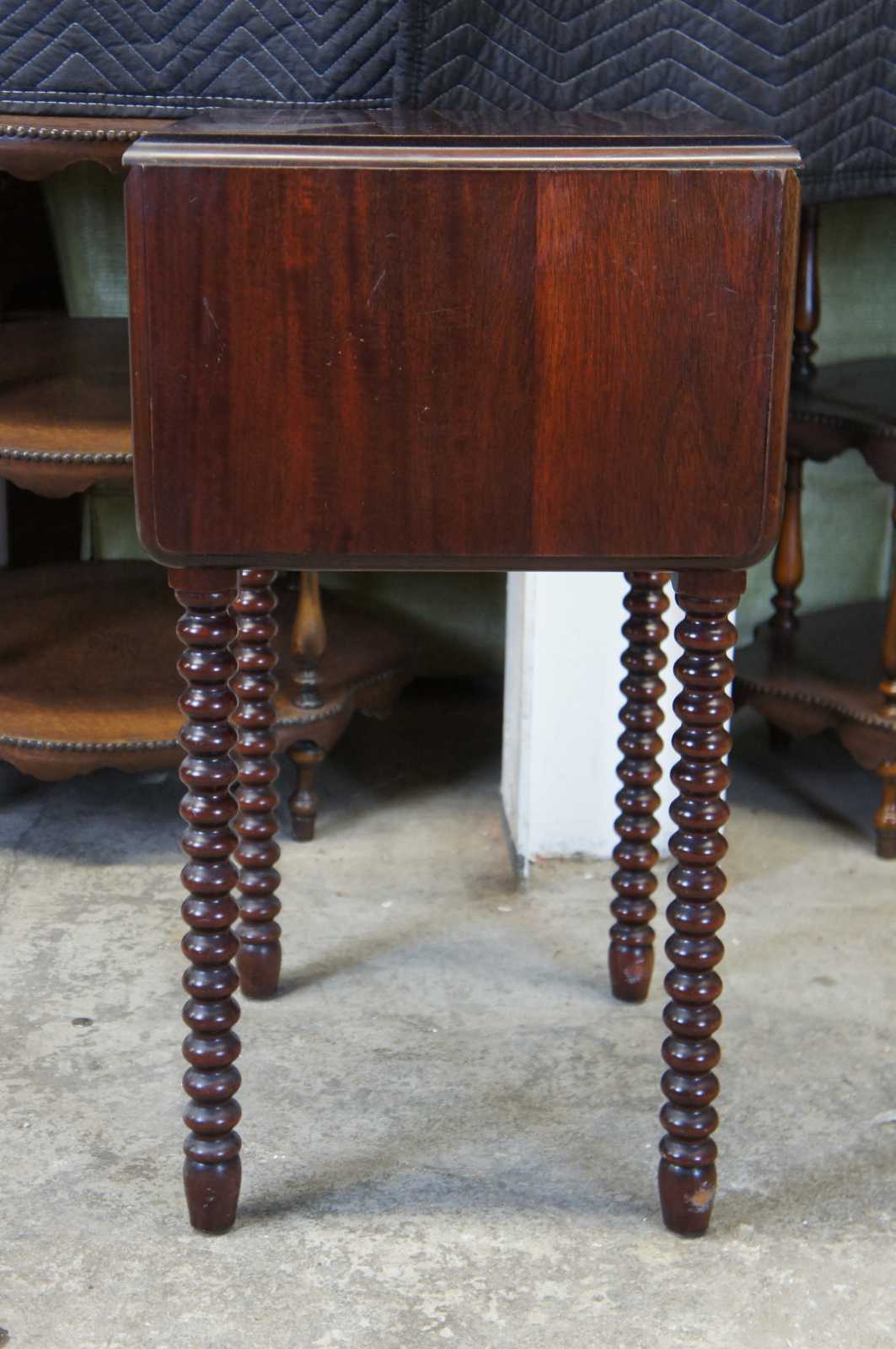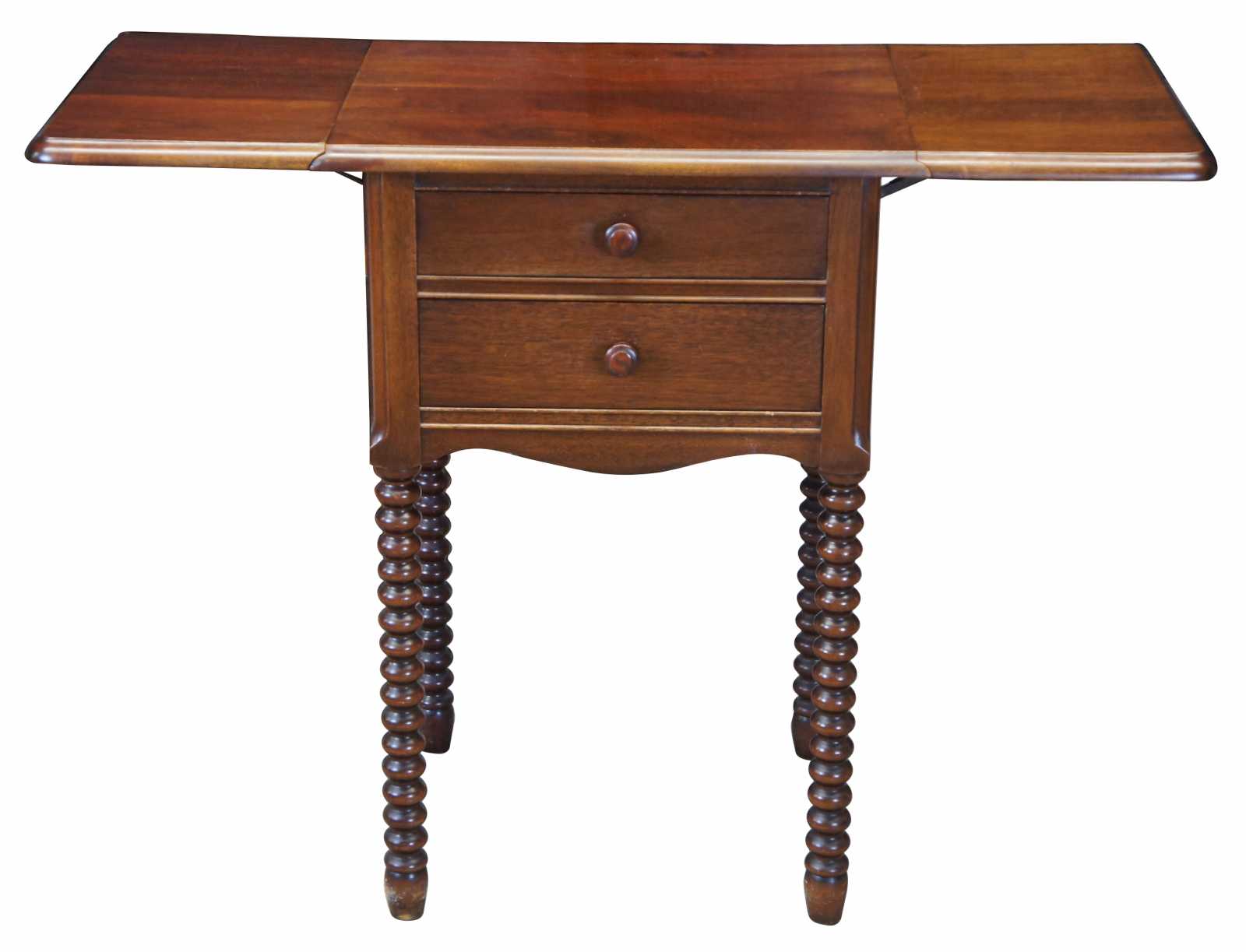 Mid 20th century Early American style dropleaf side table. Made from mahogany with a cherry stain. Features two drawers and long ribbed / spool legs.