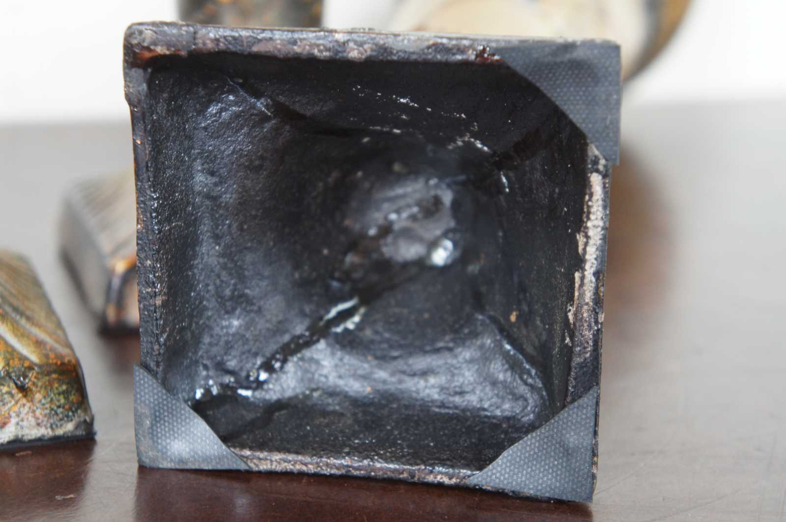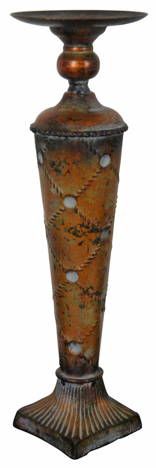 Artistically distressed, painted tin candle pedestal stands with iron column base, shaped like torches with a criss cross rope design, painted coppery-orange.