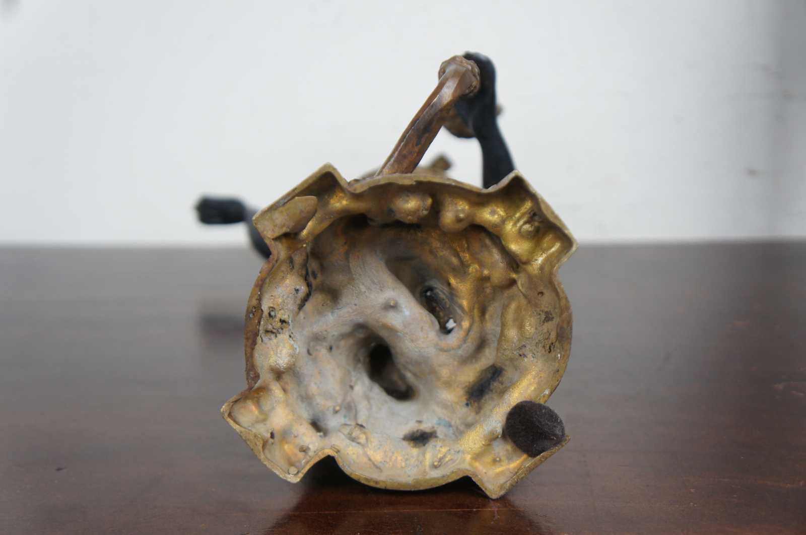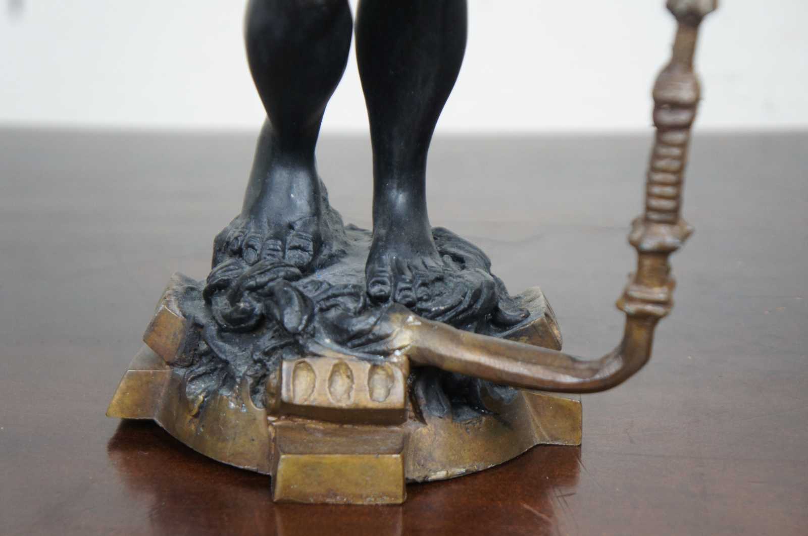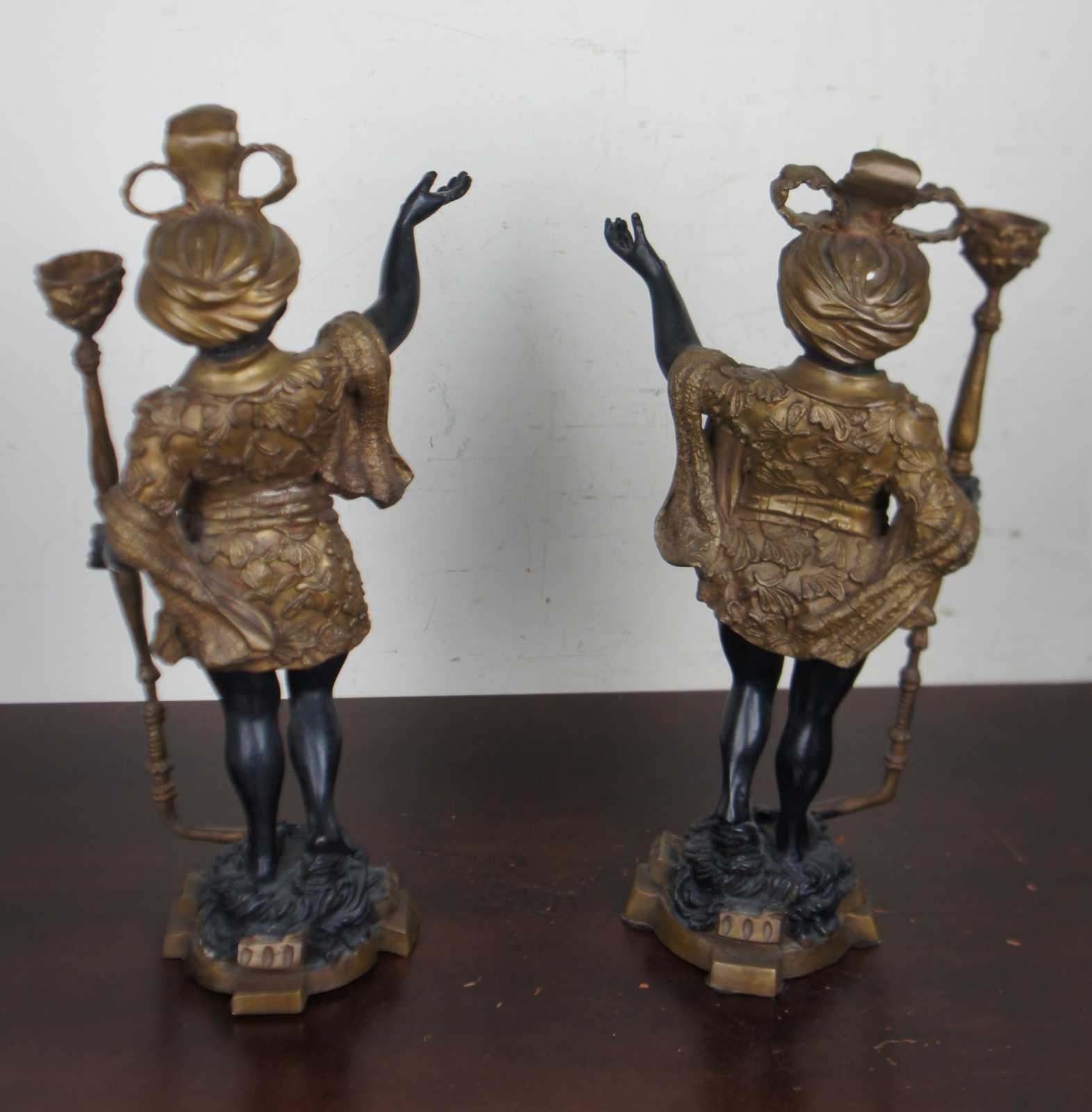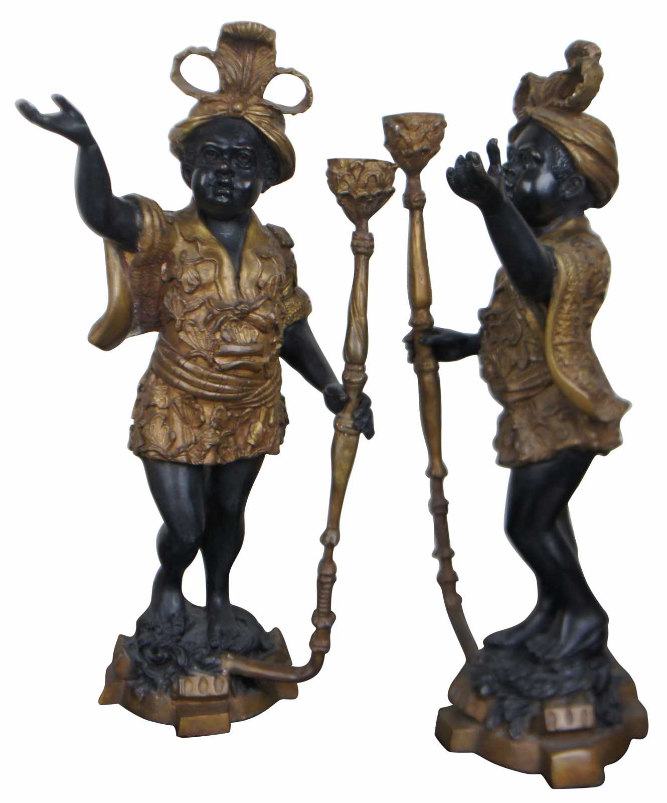 Pair of black and gold heavy cast bronze sculptures in the shape of Nubian boys in feathered turbans and baroque attire, holding candle holder staffs or torchieres (torch).