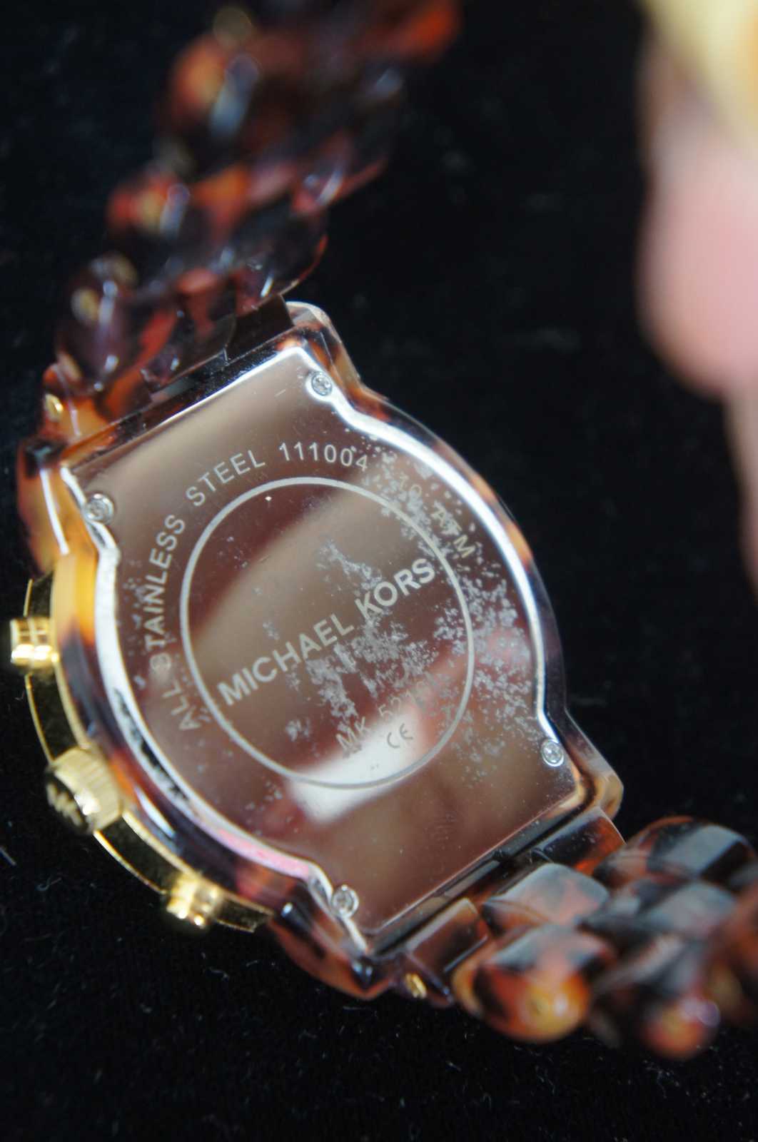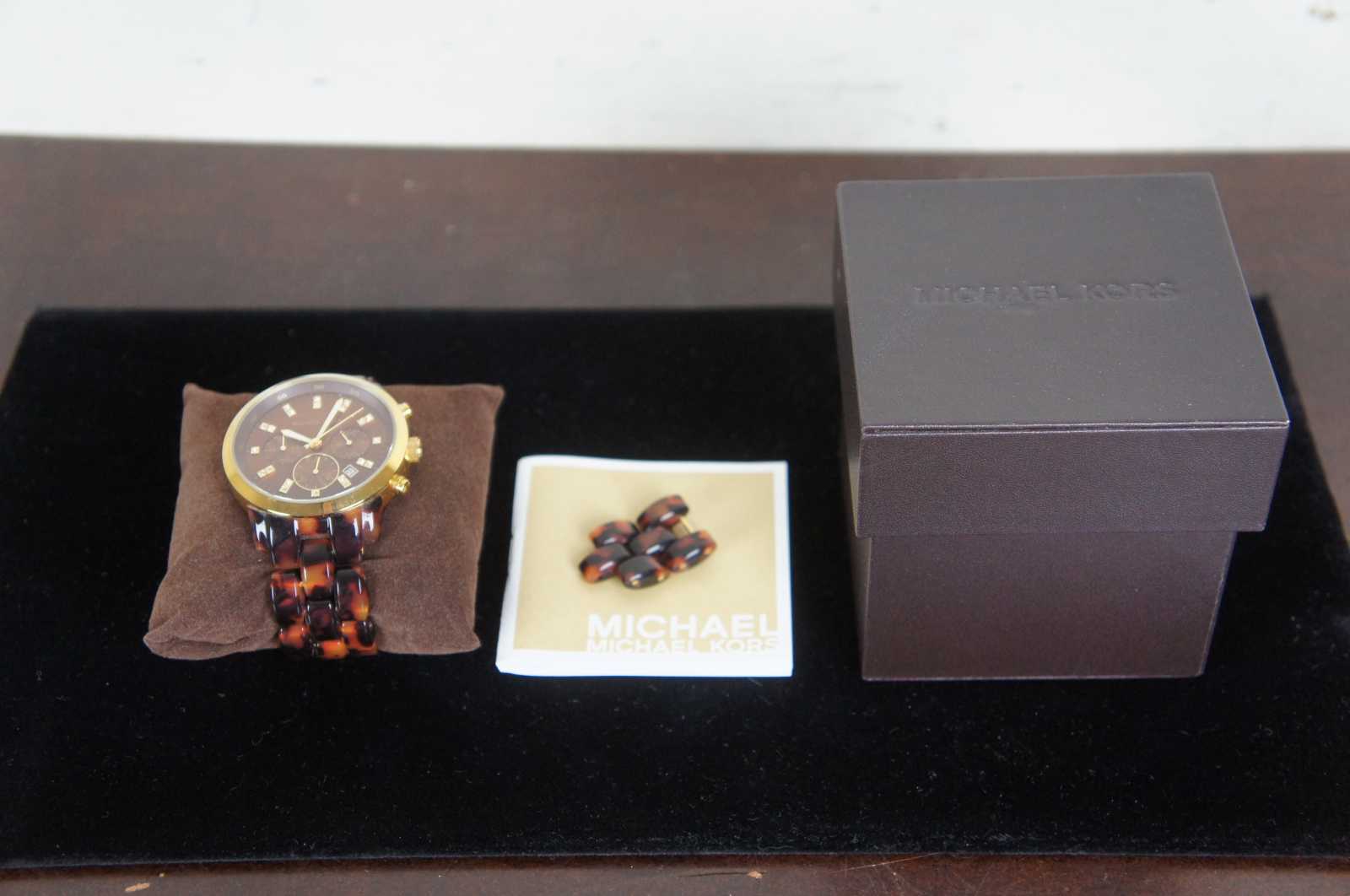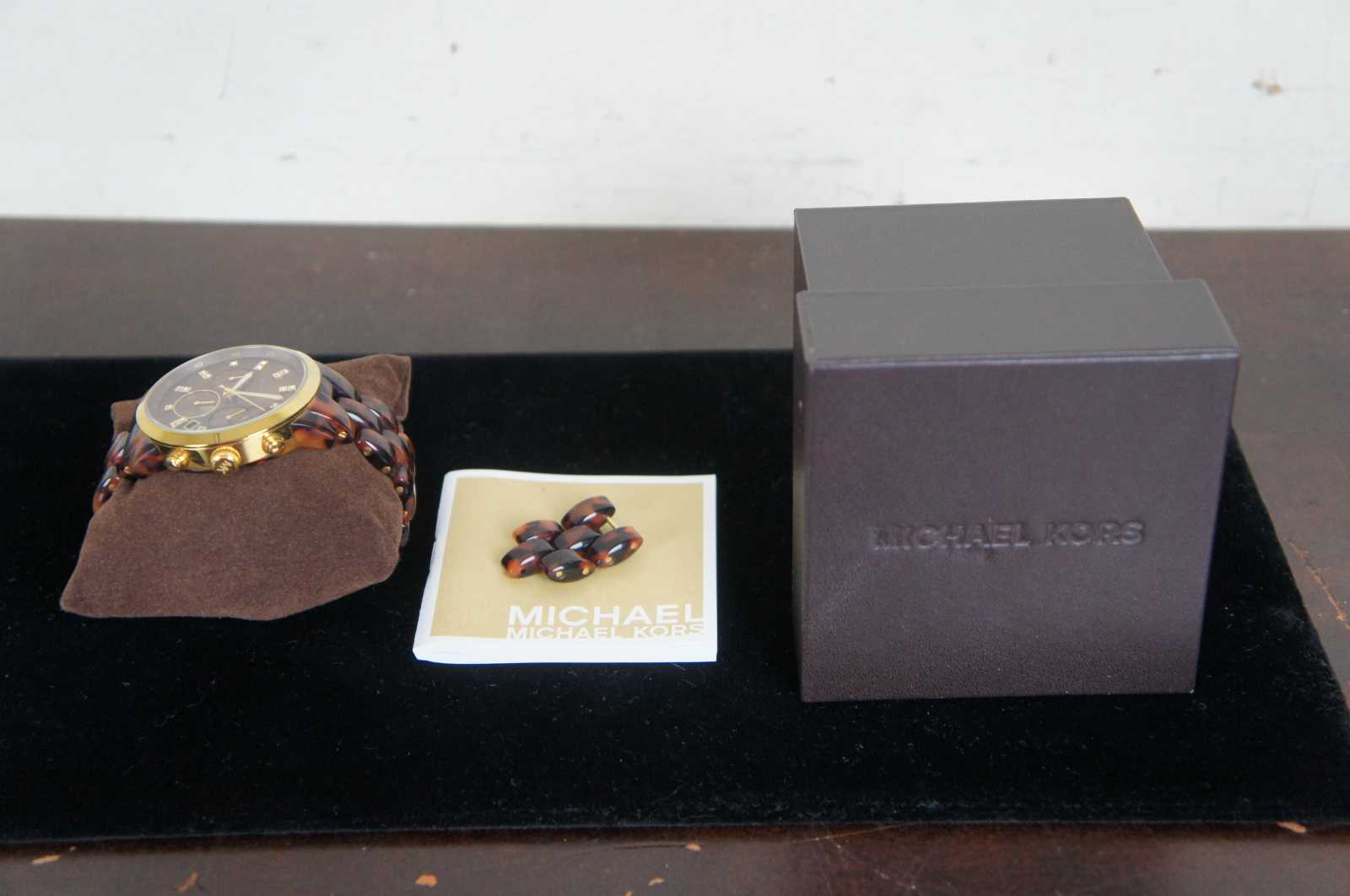 Michael Kors Jet Set faux tortoise shell banded chronograph wrist watch with Swarovski crystals at the hour markers.