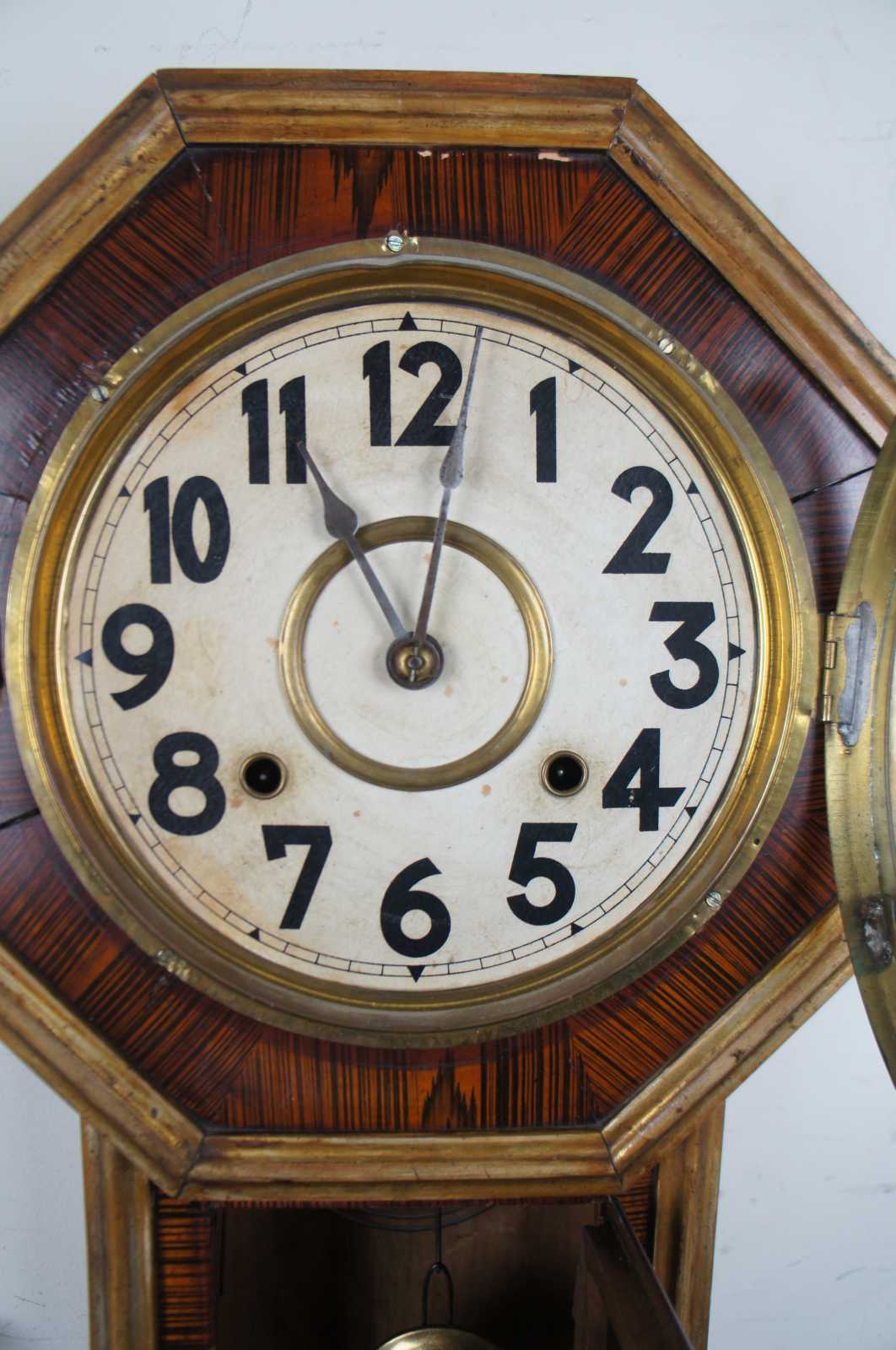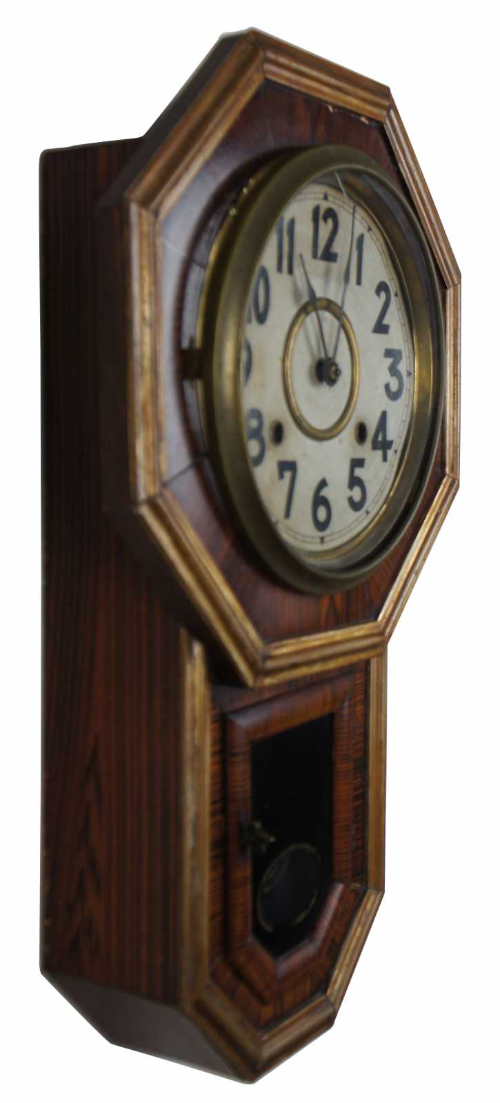 Antique short drop schoolhouse style octagonal wood veneered artisan wall clock.
