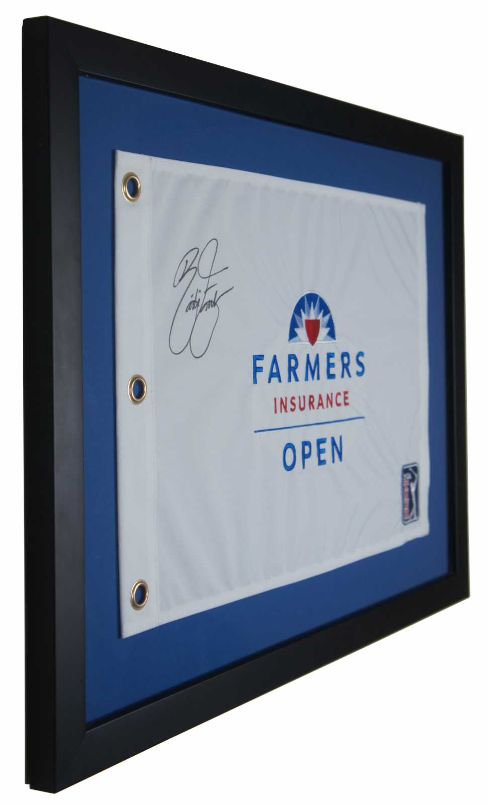 Framed flag from the PGA Tour Farmers Insurance Open, signed by professional golfer Rickie Fowler.