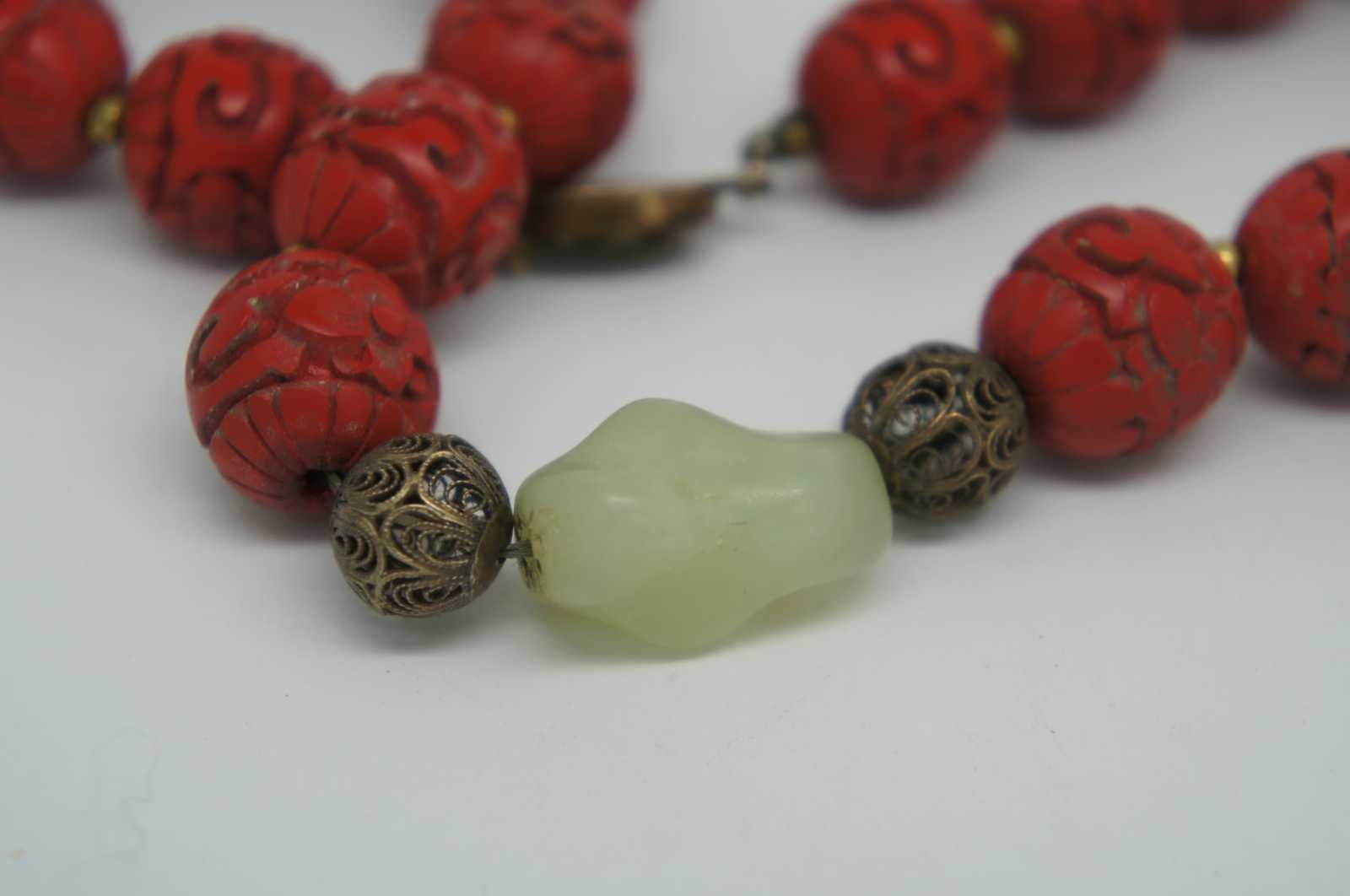 Vintage Chinese necklace of carved red cinnabar beads and a green jade accent bead with silver clasp.