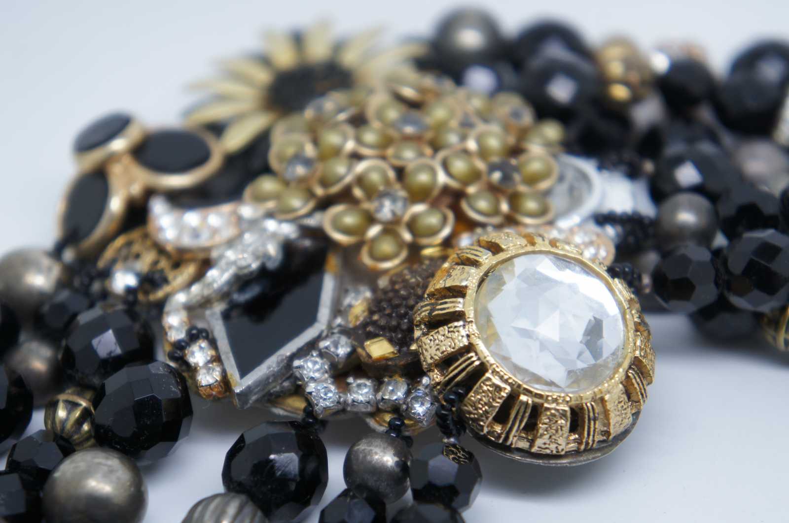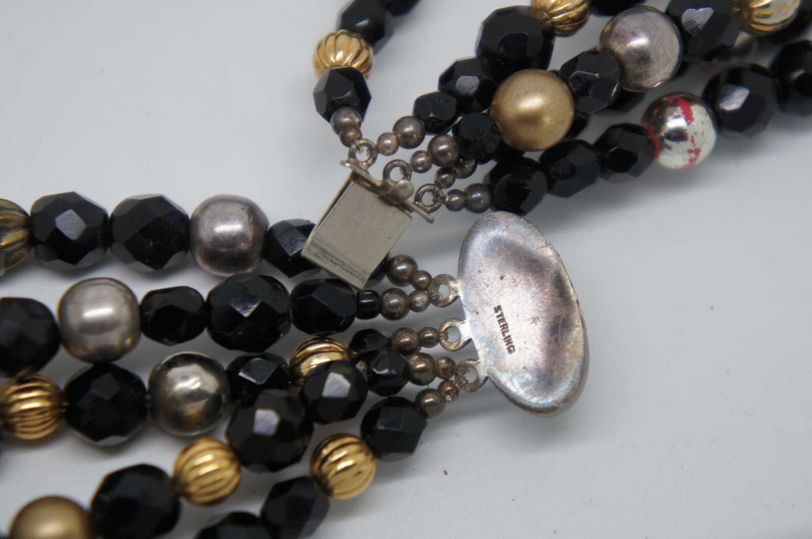 Glamorous, immense, vintage seven layered collar necklace of jet black, sterling silver, gold tone and rhinestone beads with a central collage cluster of jeweled flowers and rhinestones. Clasp marked sterling sivler on back.