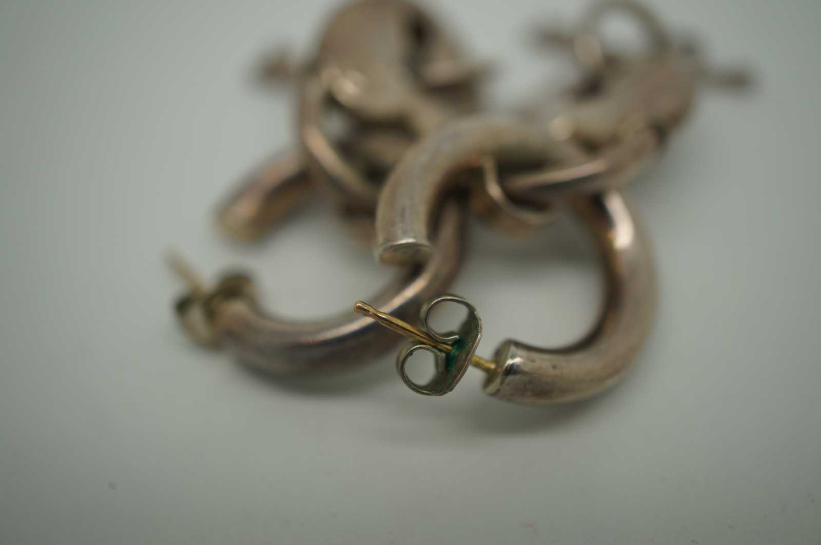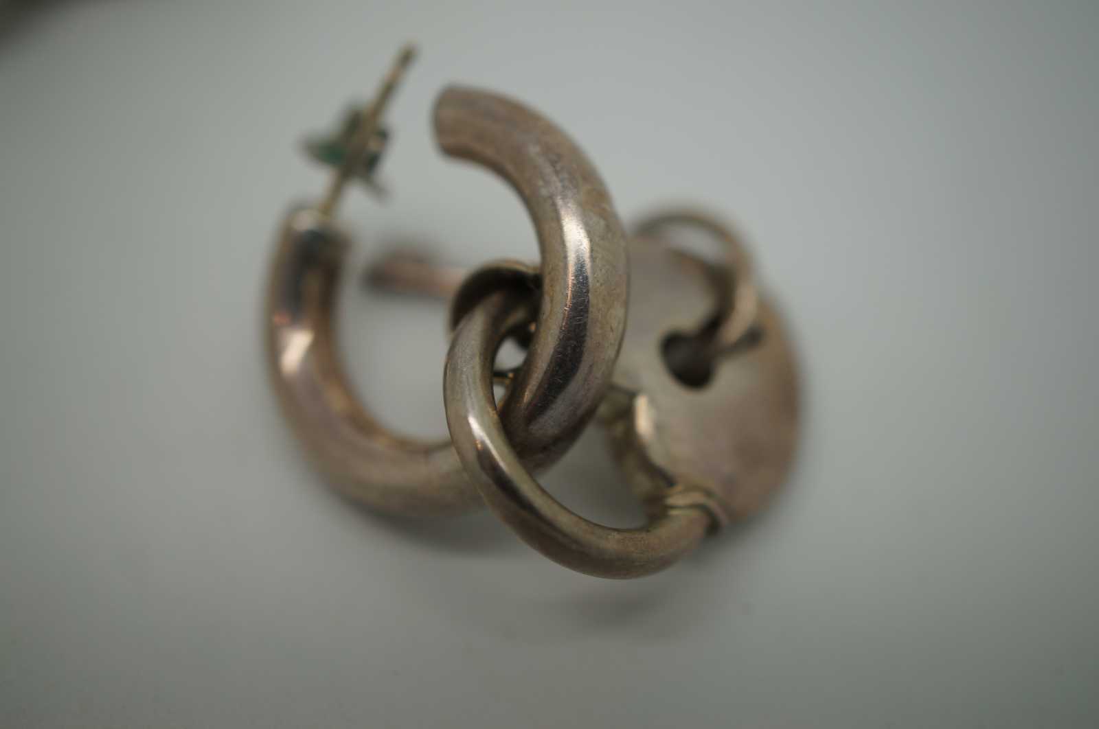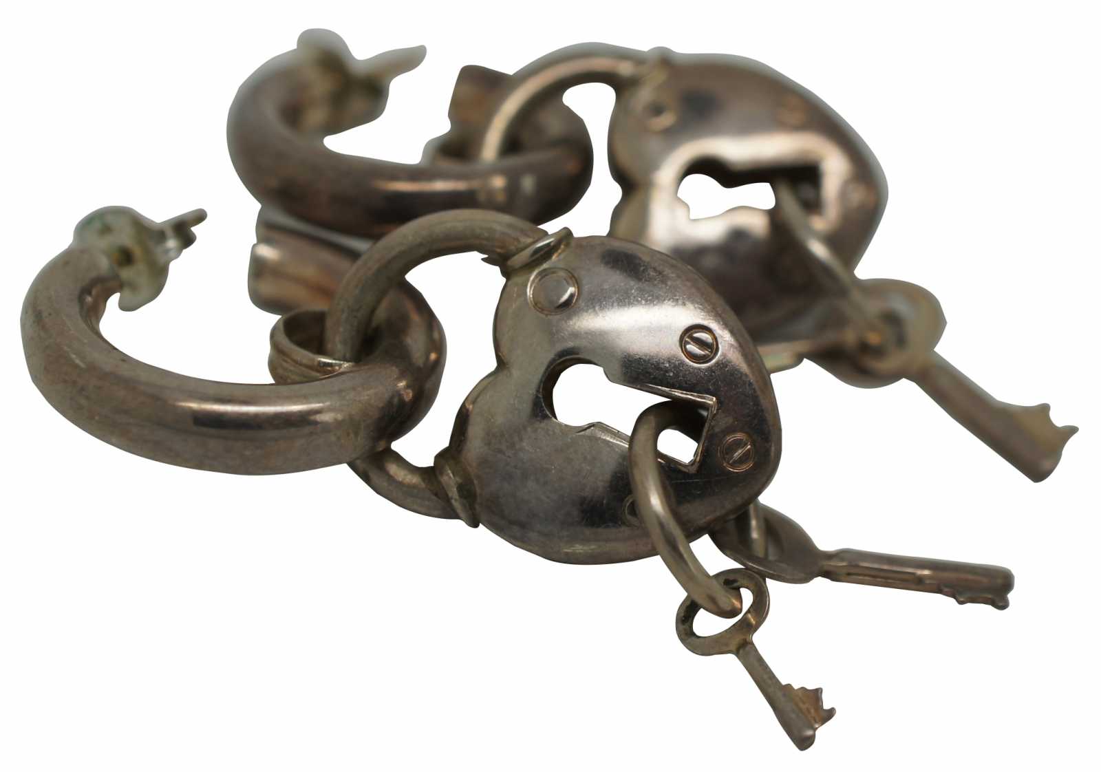 Vintage 800 silver hoop earrings with dangle heart shaped lock and key charms. Marked 800 silver and AIB in a diamond on backside.