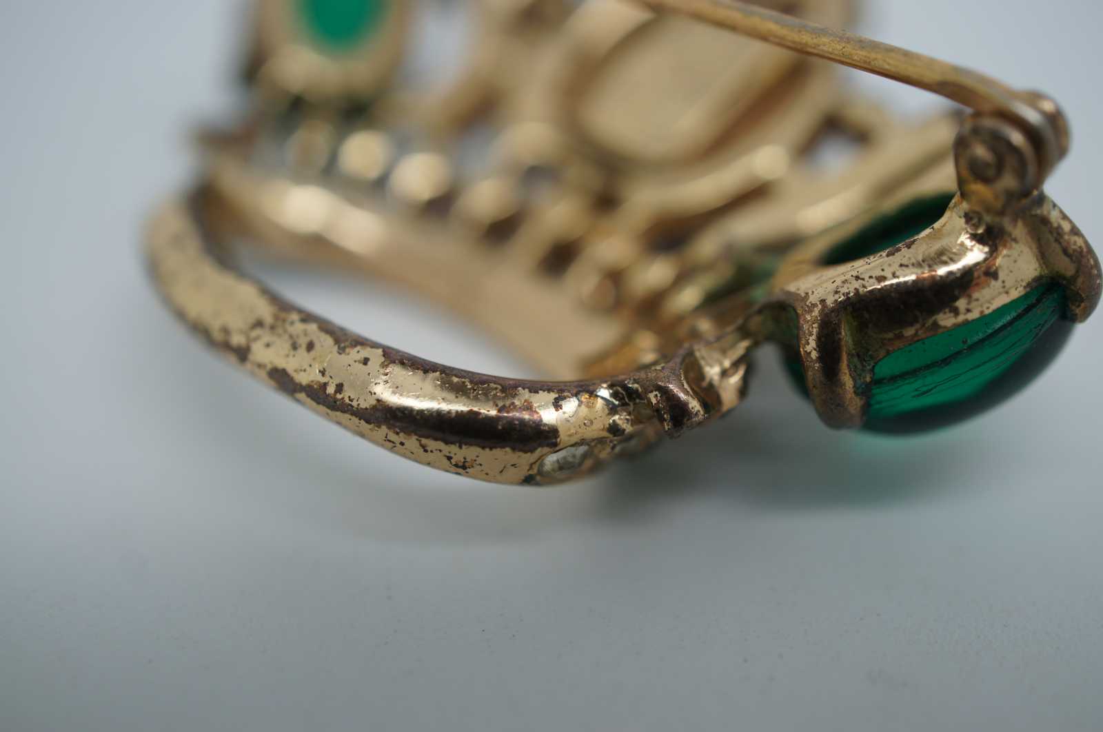 Vintage 1940’s crown shaped pin by Coro Craft, sterling silver with green, red, white and blue rhinestones. Pagasis horse symbol on back.