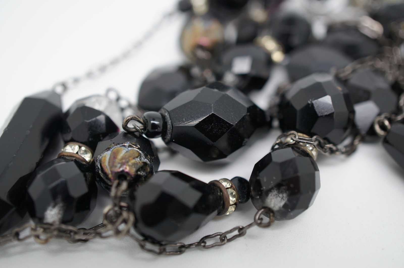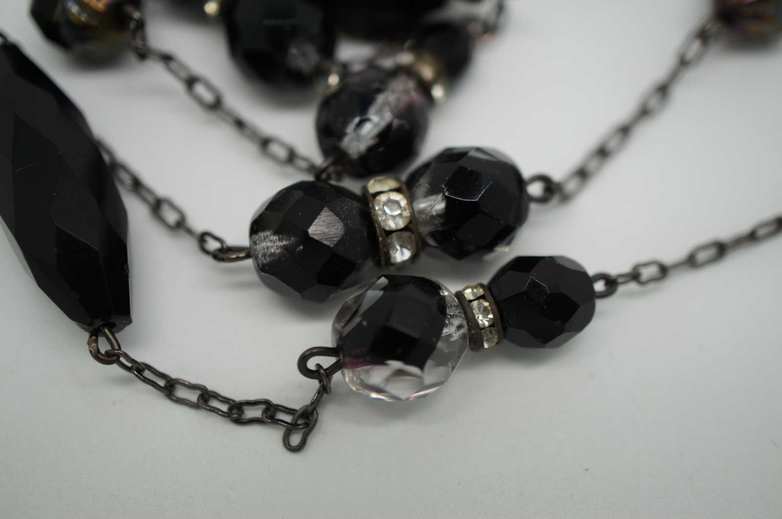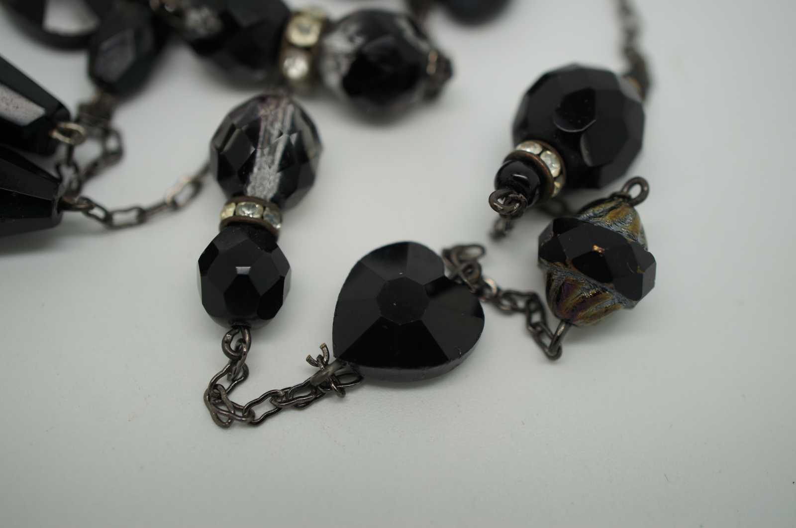 Vintage flapper style necklace of faceted jet black, glass and rhinestone beads.