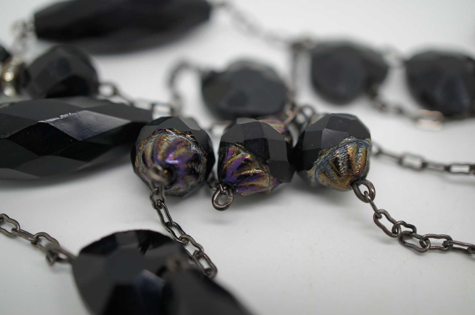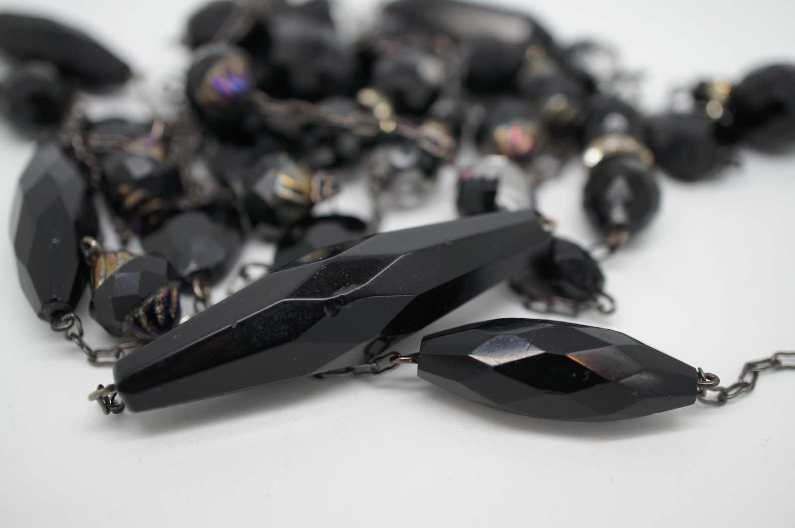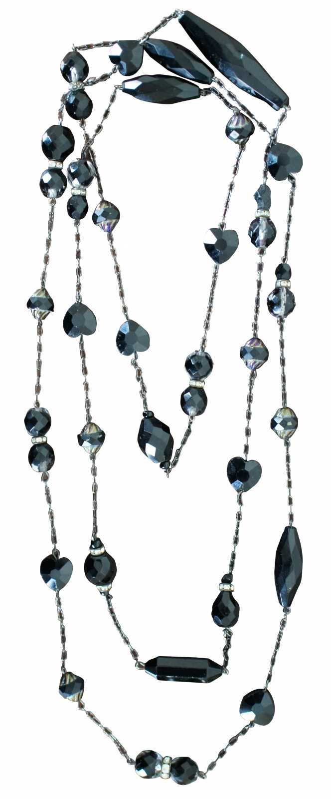 Vintage flapper style necklace of faceted jet black, glass and rhinestone beads.