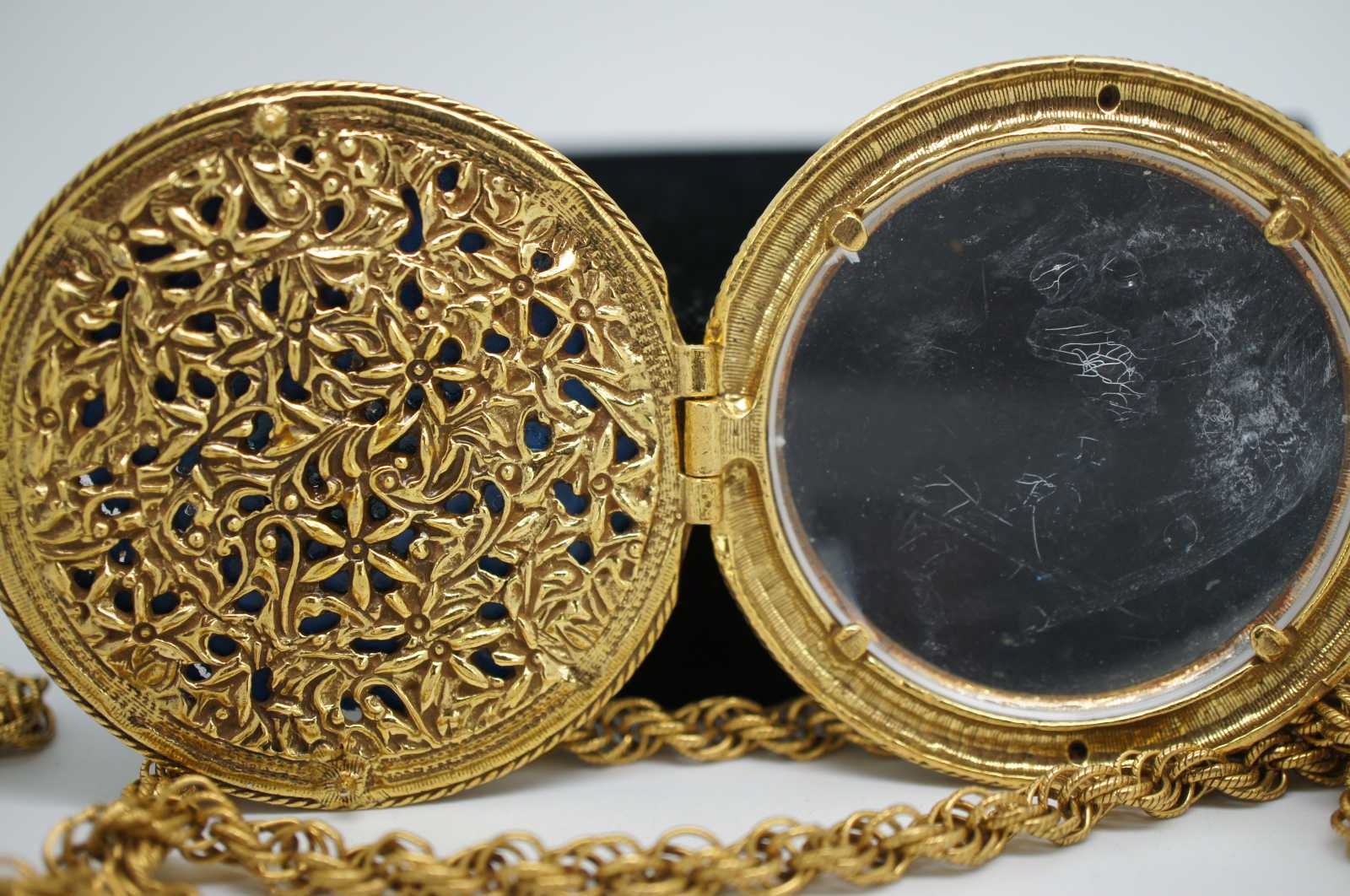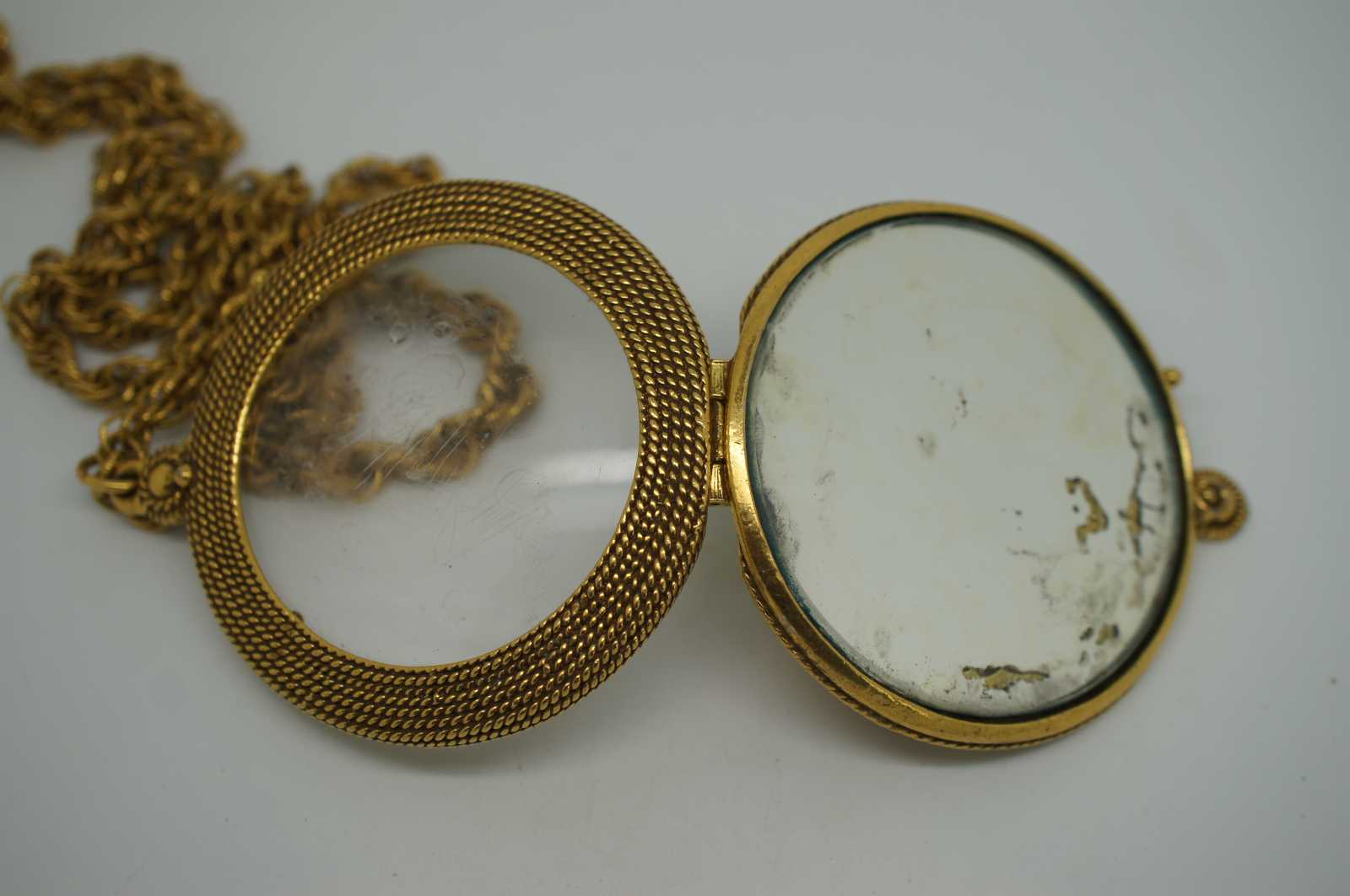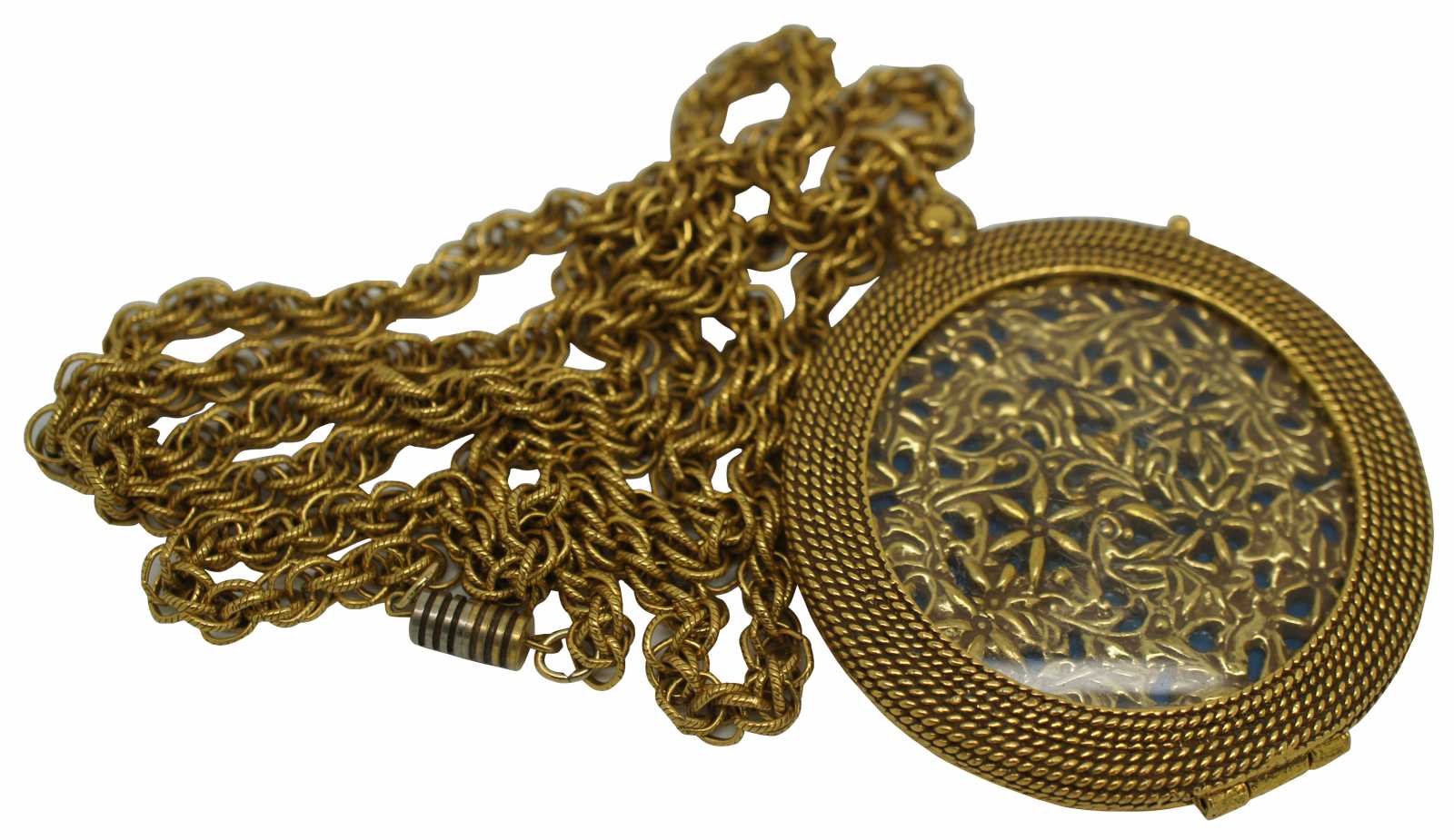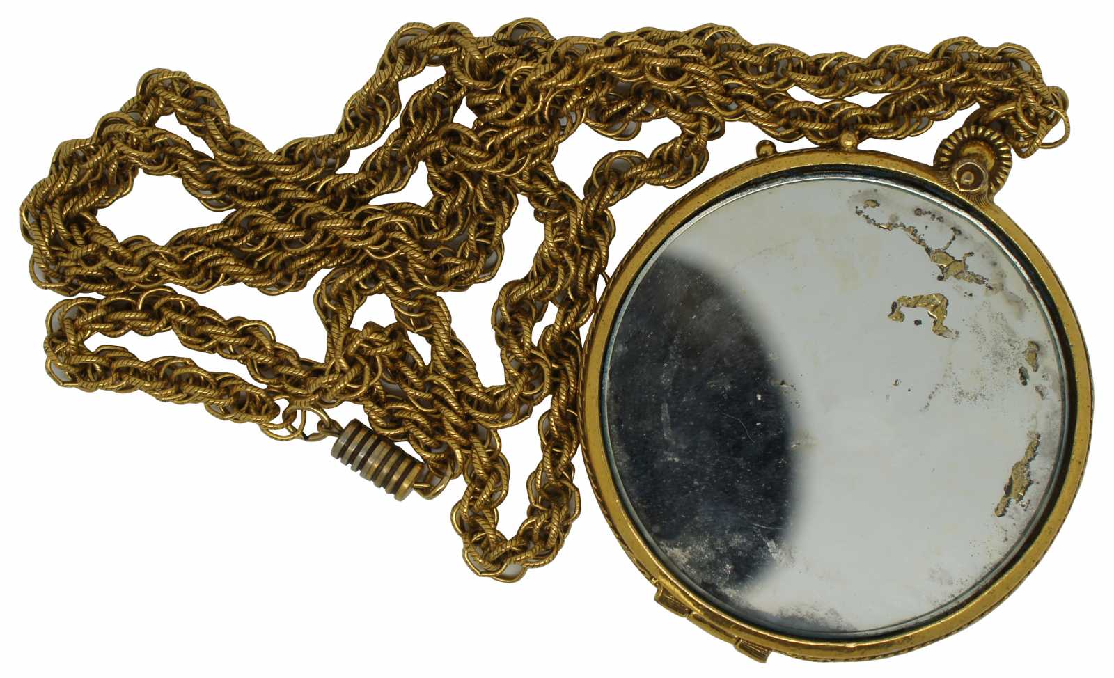 Vintage gold tone chatelaine pendant necklace with a mirror on one side and a flip out compact magnifying glass on the other.