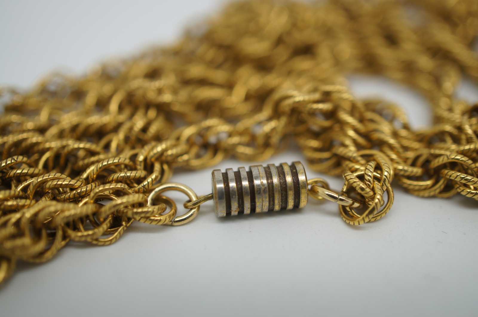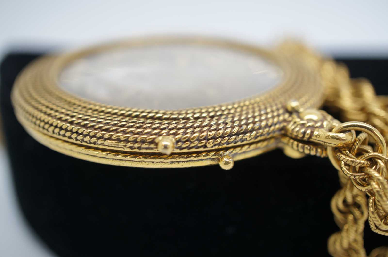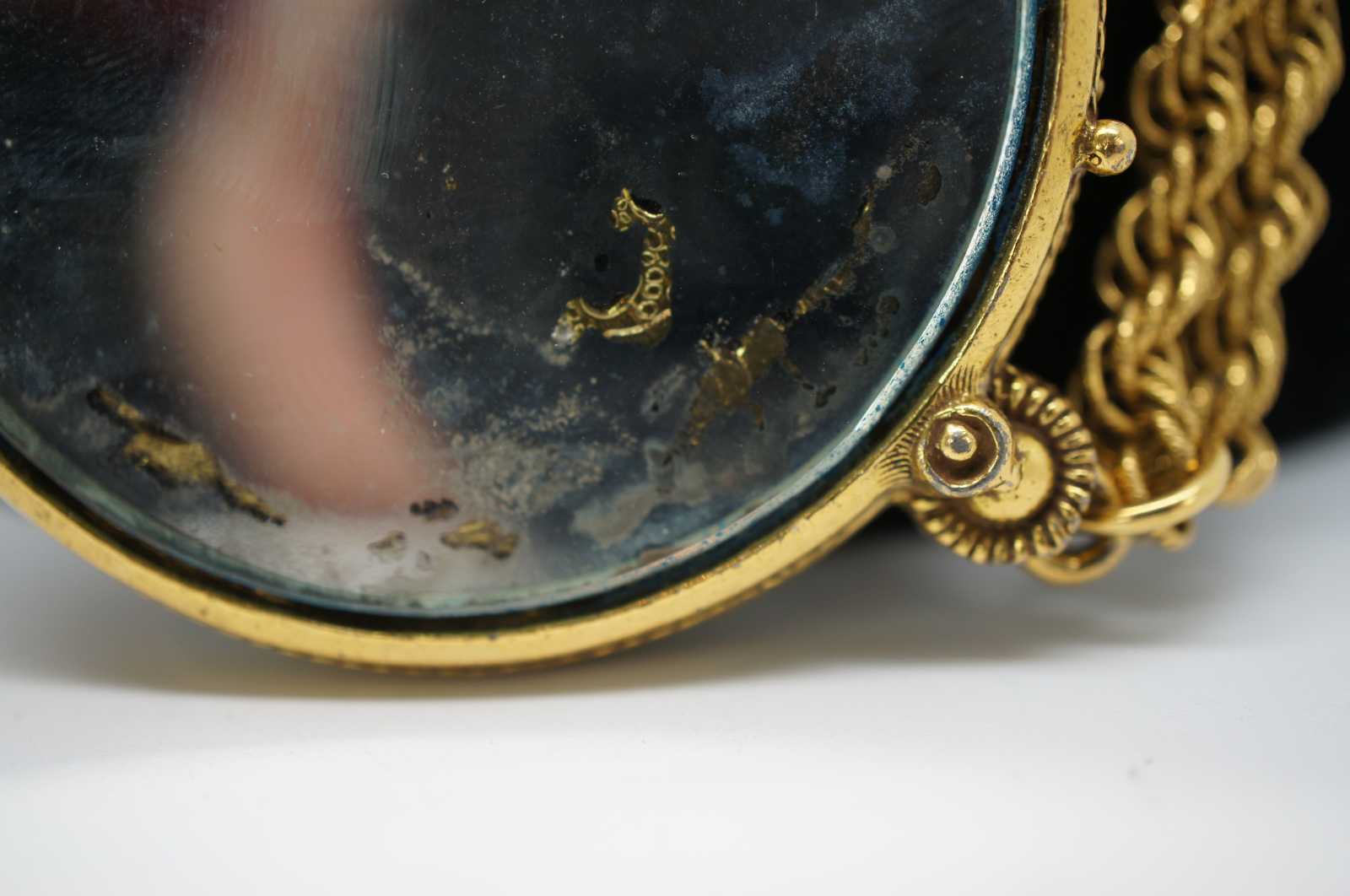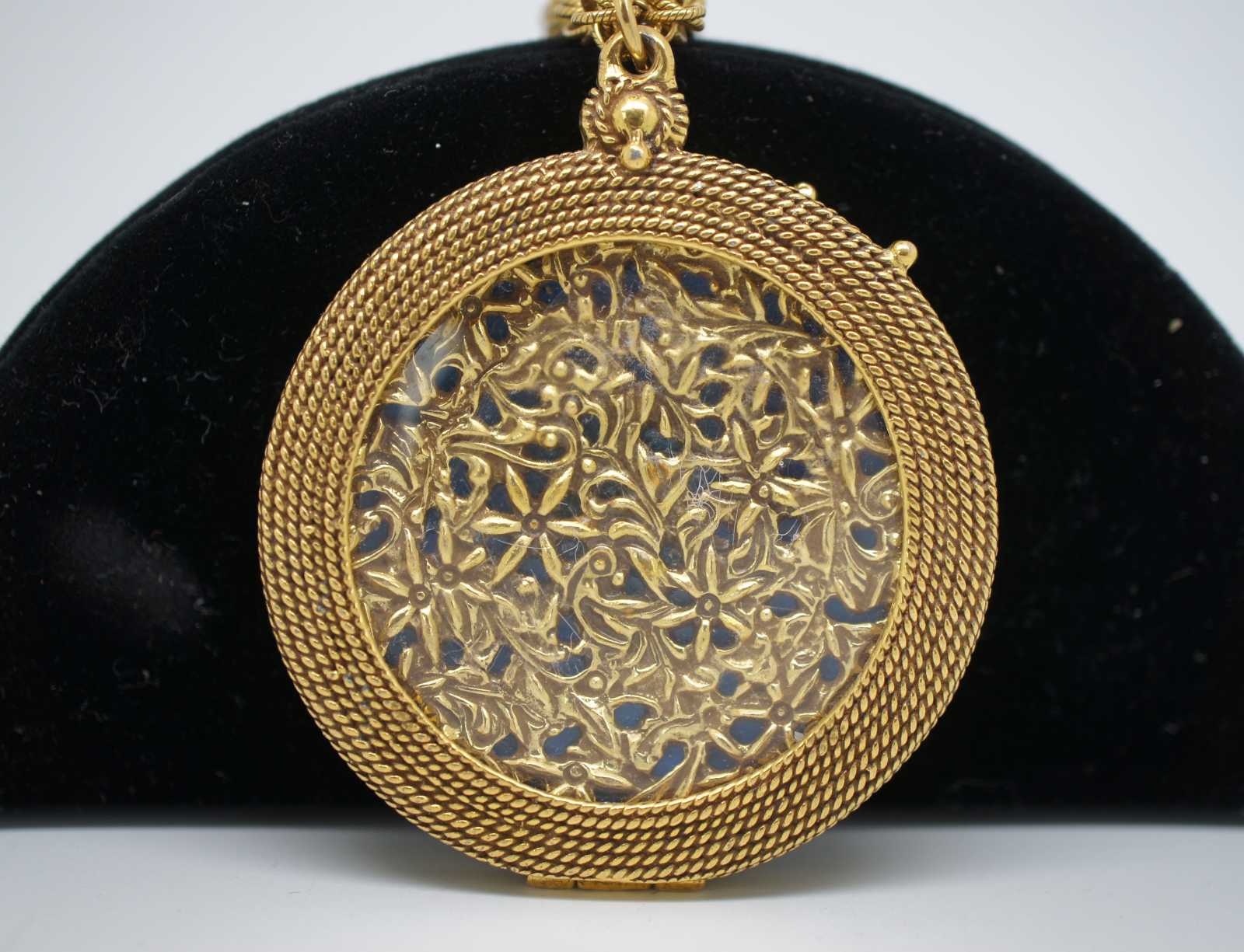 Vintage gold tone chatelaine pendant necklace with a mirror on one side and a flip out compact magnifying glass on the other.