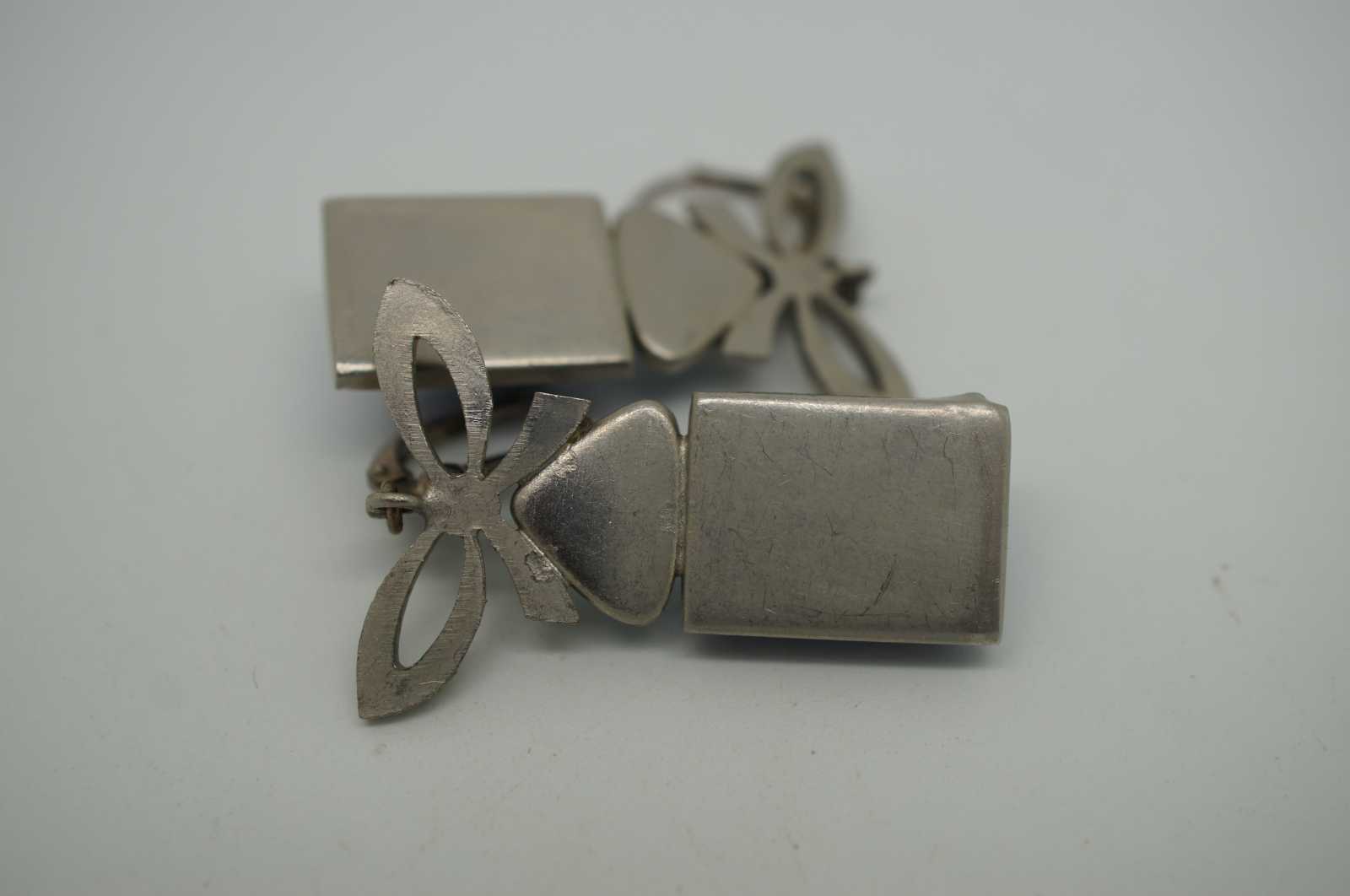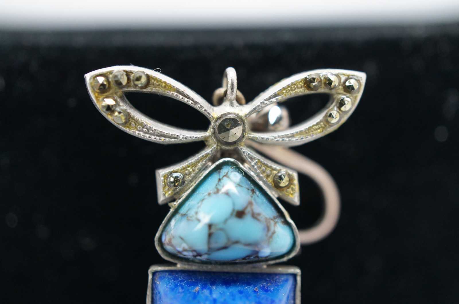 Two pairs of vintage southwestern earrings - one turquoise, white and bronze seed bead chandeliers and one lapis lazuli and turquoise stone dangles topped with bows with hematite accents.