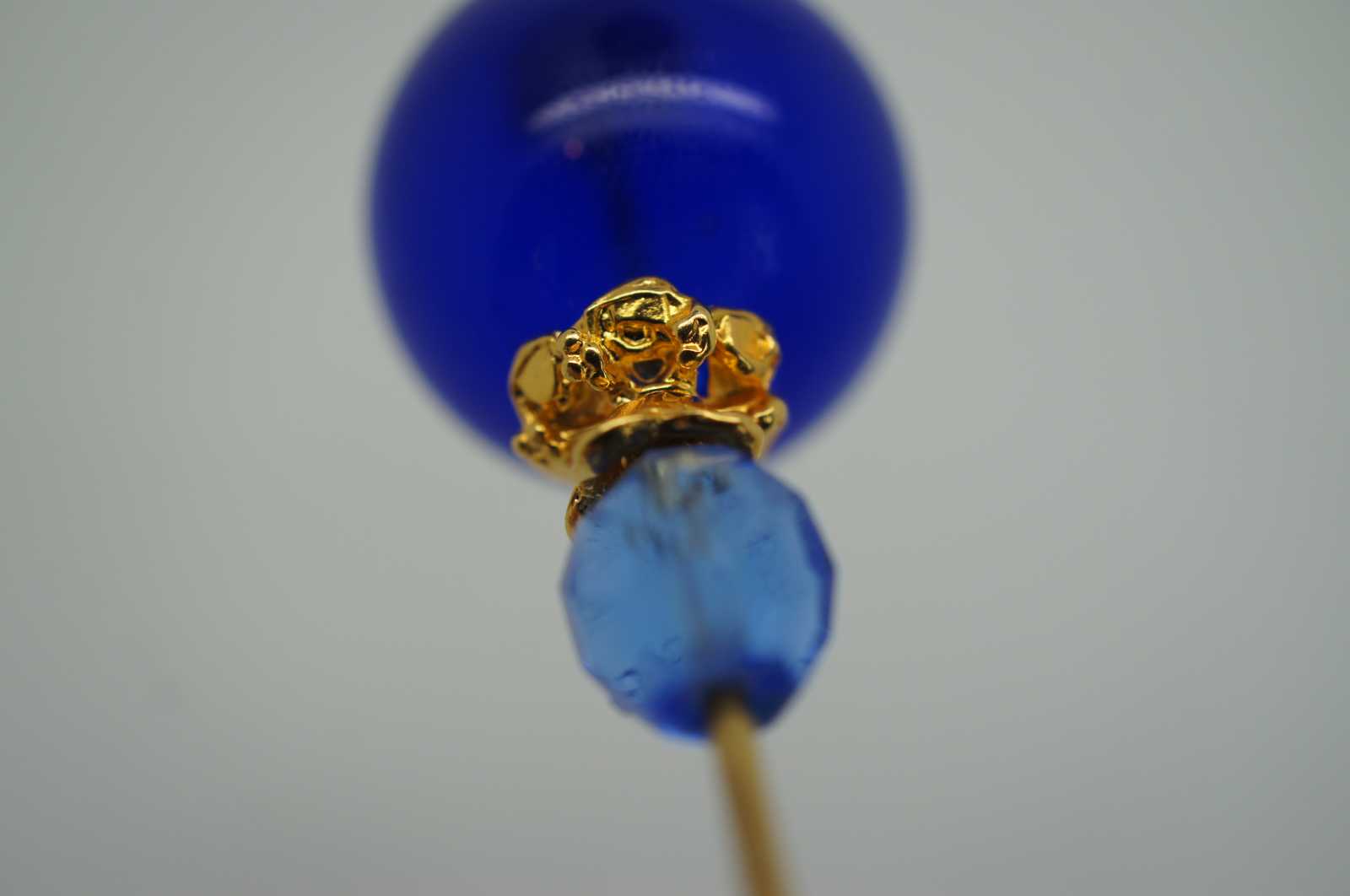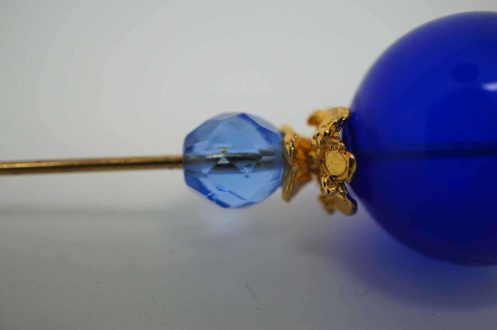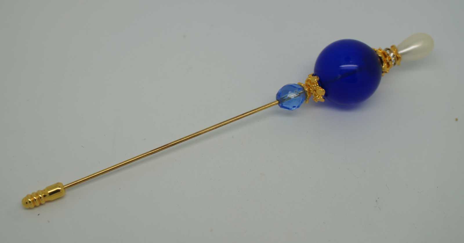 Handmade Murano, Italy glass bead hatpin with a gold tone stick, large blue glass orb above a faceted light blue bead and topped with a rhinestone ringed crown and oblong pearl.
