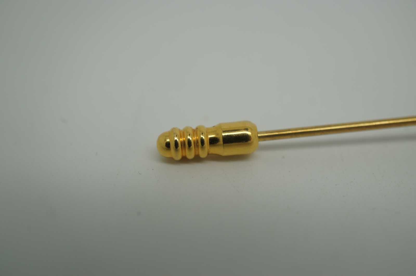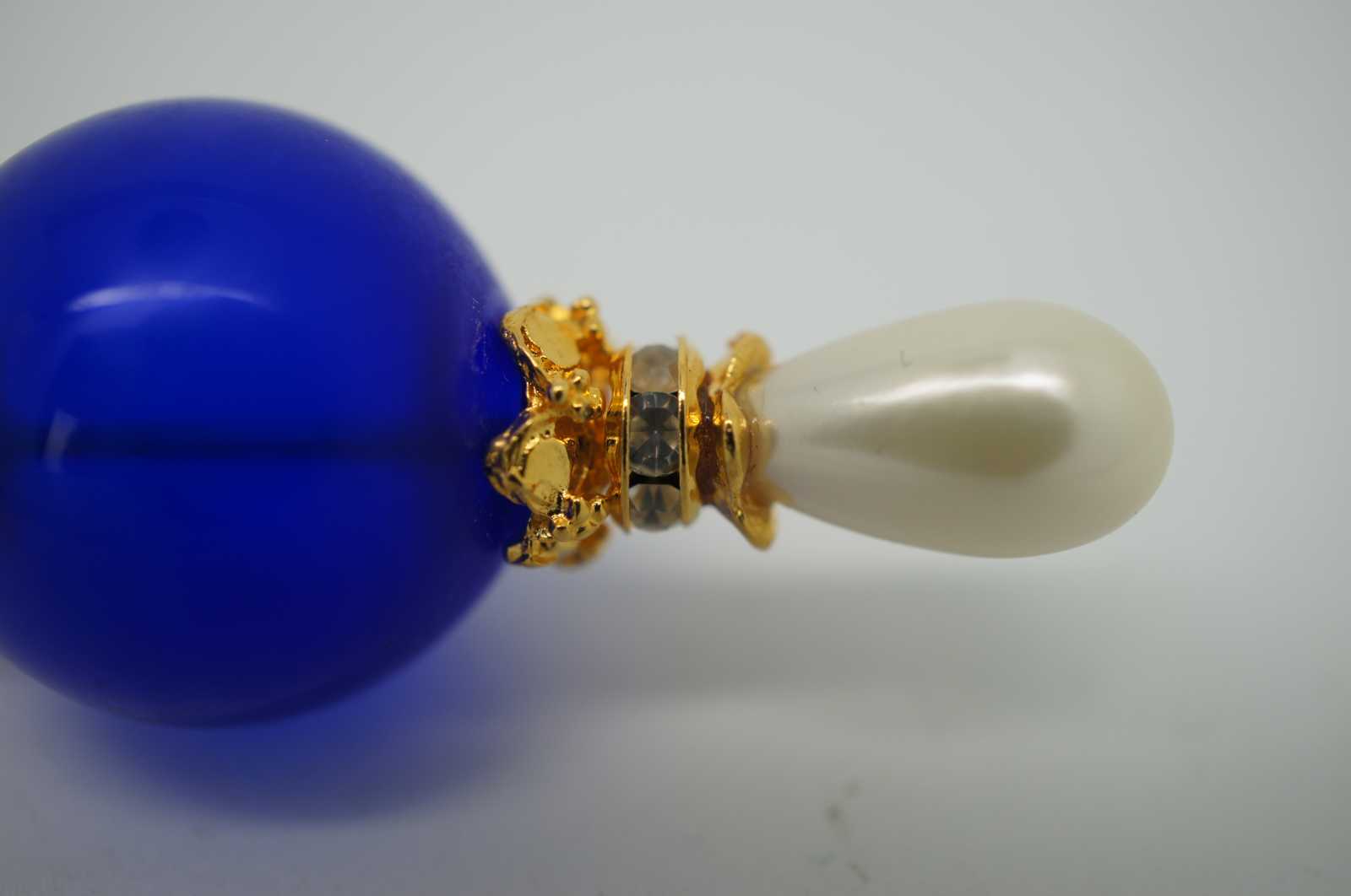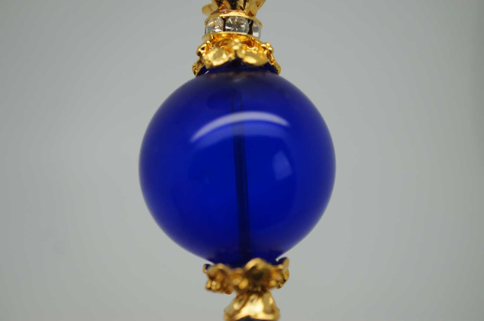 Handmade Murano, Italy glass bead hatpin with a gold tone stick, large blue glass orb above a faceted light blue bead and topped with a rhinestone ringed crown and oblong pearl.