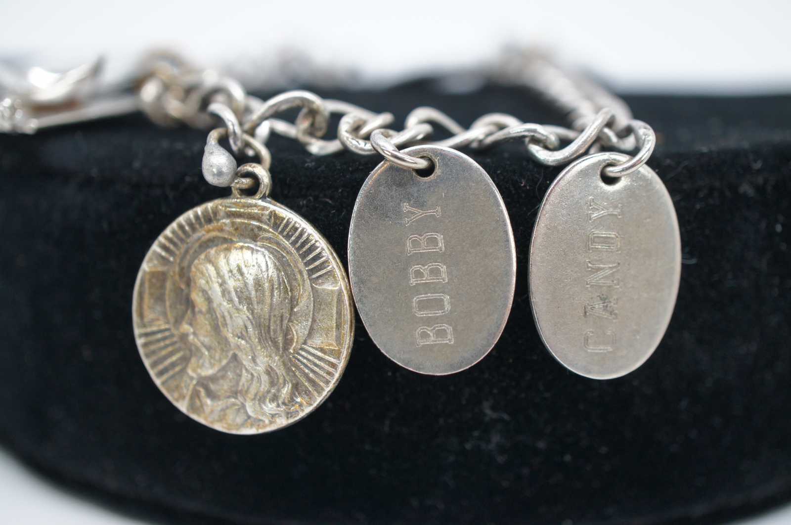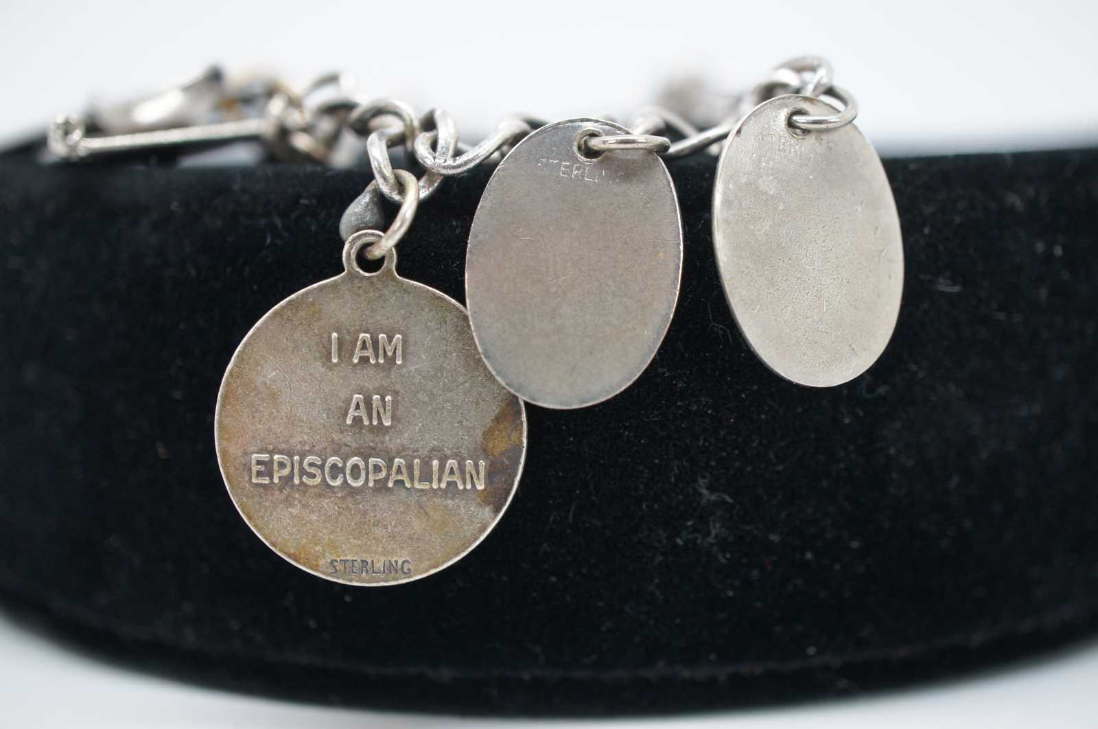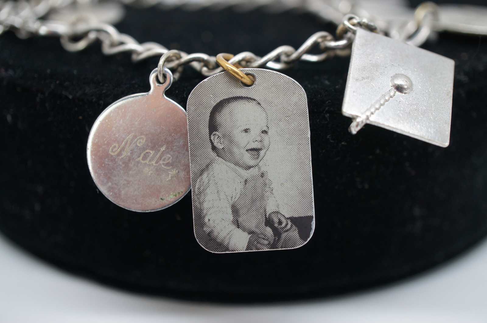 Vintage sterling silver family charm bracelet featuring an Episcopalian Christ medal, 5 engraved name/birthday charms, 3 photo charms, and one graduation hat.