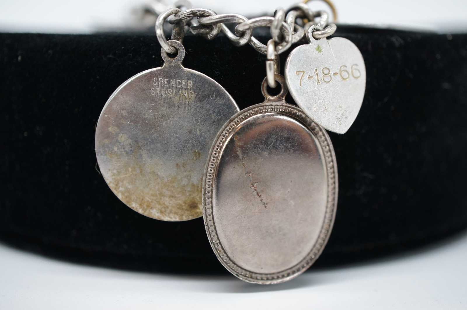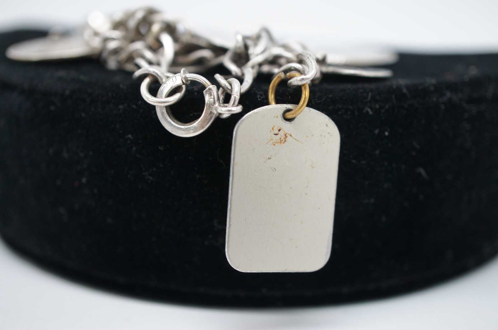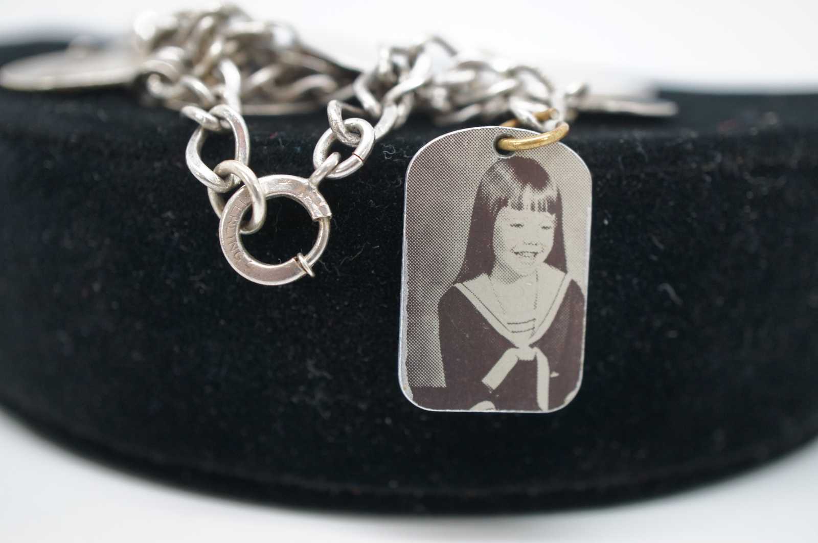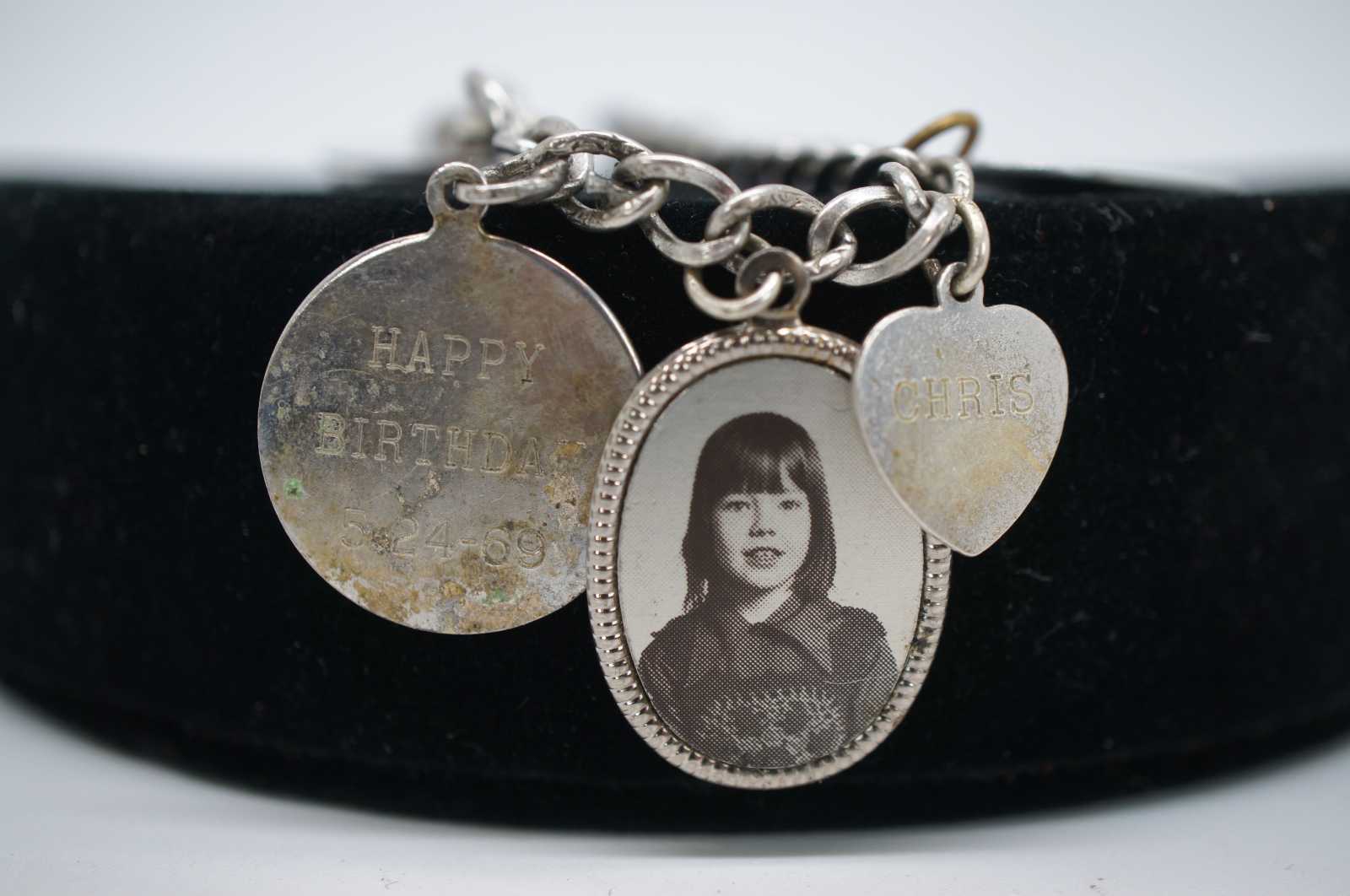 Vintage sterling silver family charm bracelet featuring an Episcopalian Christ medal, 5 engraved name/birthday charms, 3 photo charms, and one graduation hat.