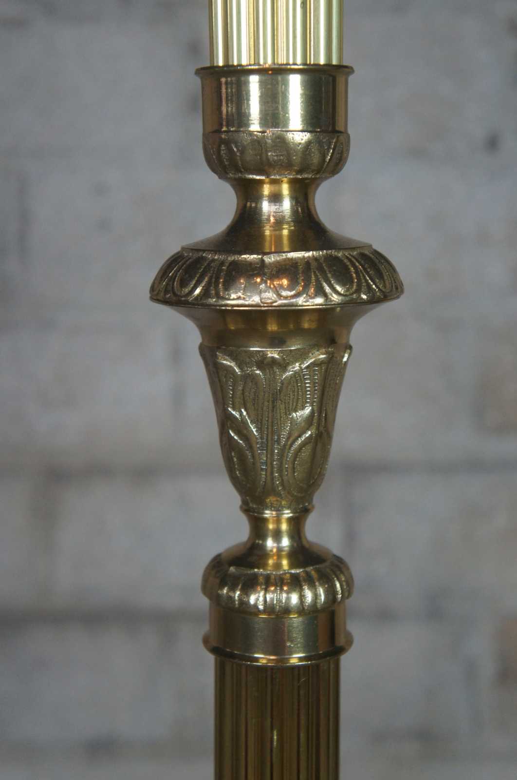 Mid 20th century Hollywood Regency style hall tree. Made from brass with figural lion head base leading to paw feet. Ornate revolving top has scalloped coat hangers.