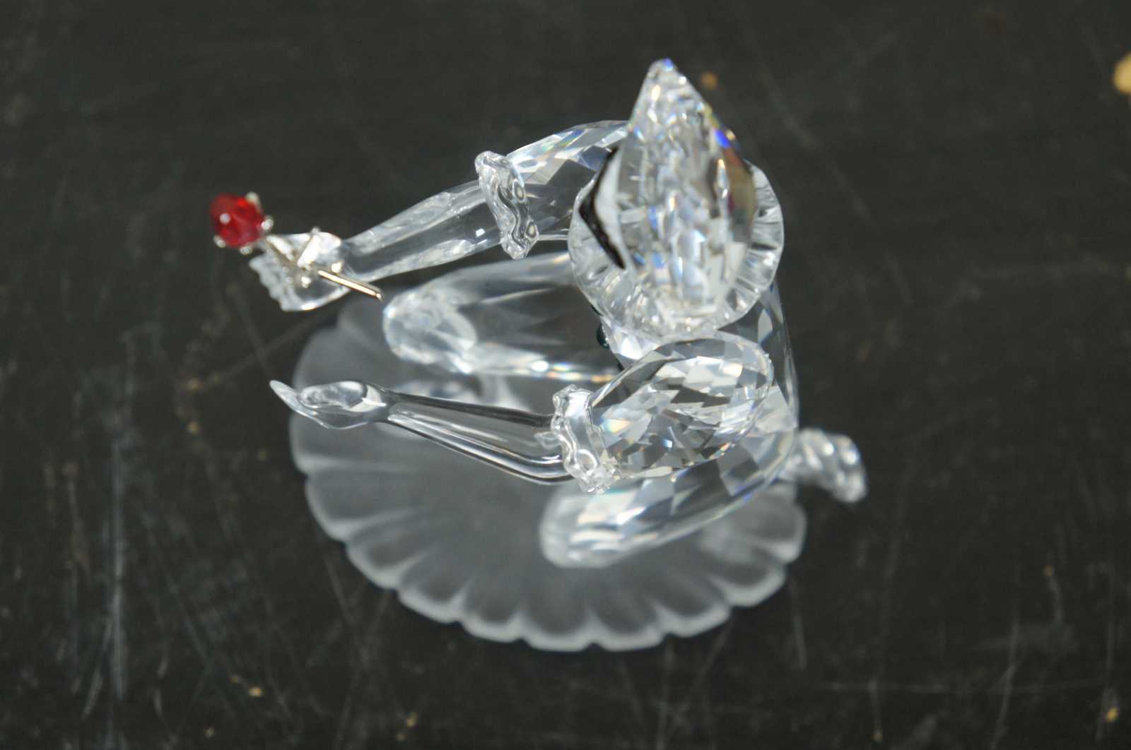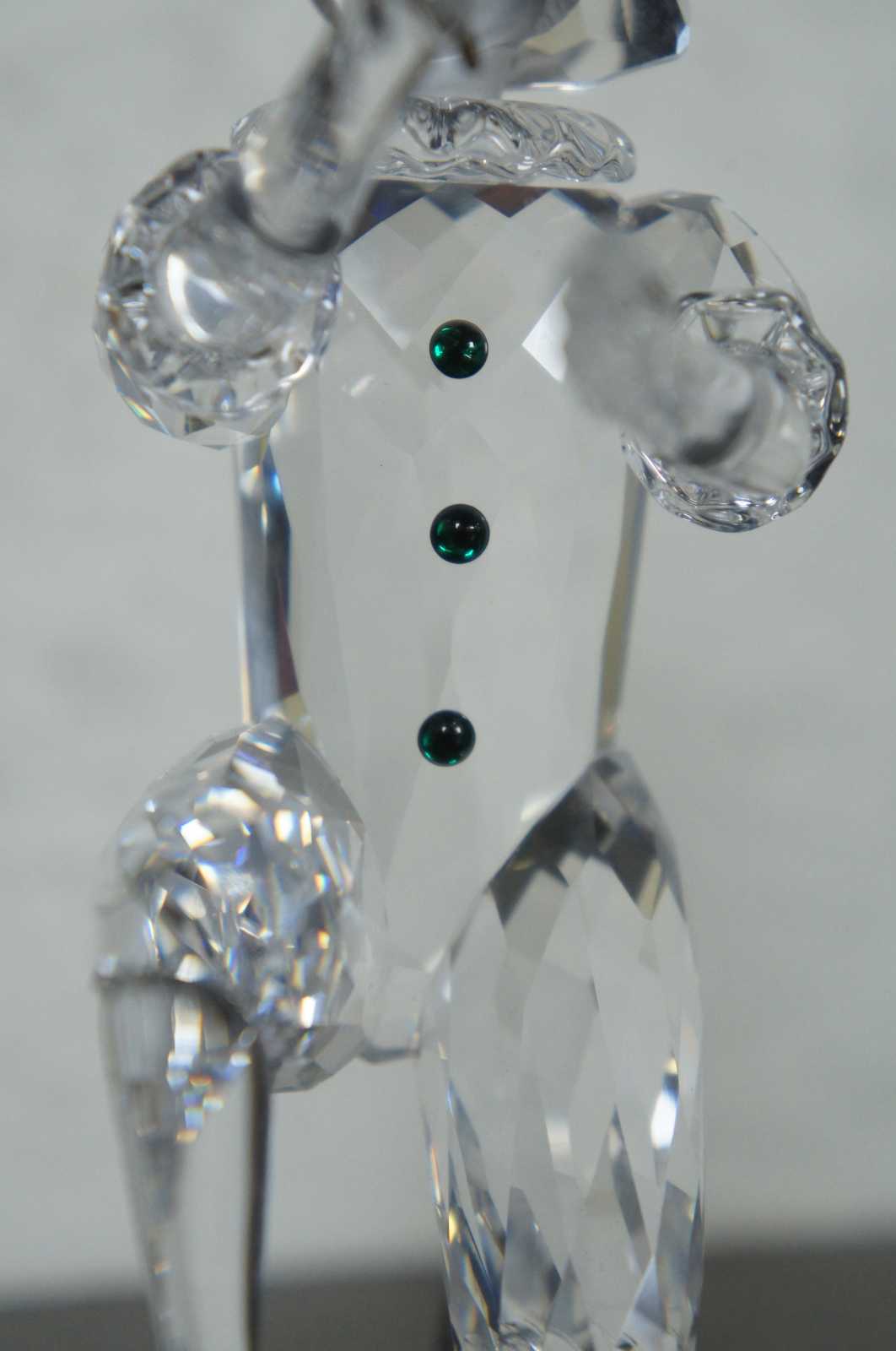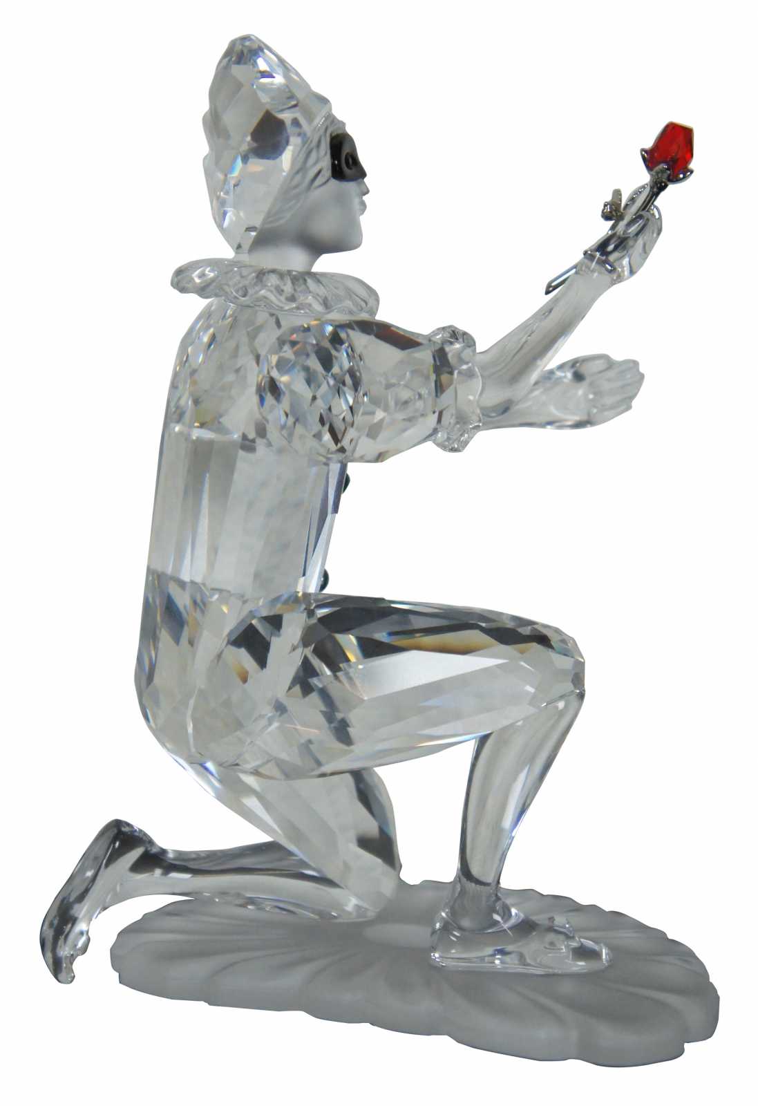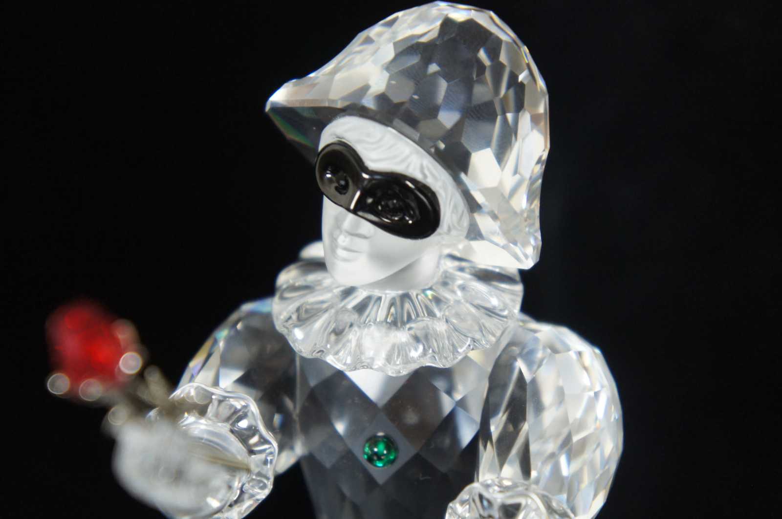 Swarovski SCS crystal 2001 “Masquerade” Harlequin figurine. The kneeling Commedia del arte figure features a black mask, green buttons and hols out a red rose with a silver stem. Includes box.