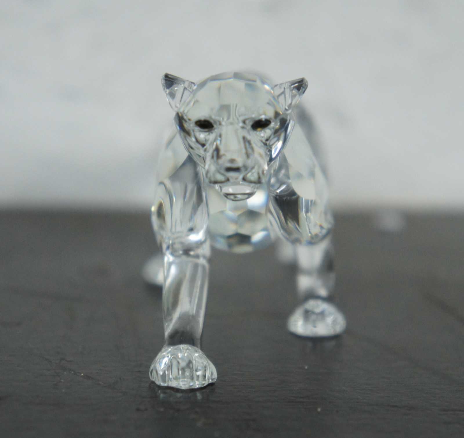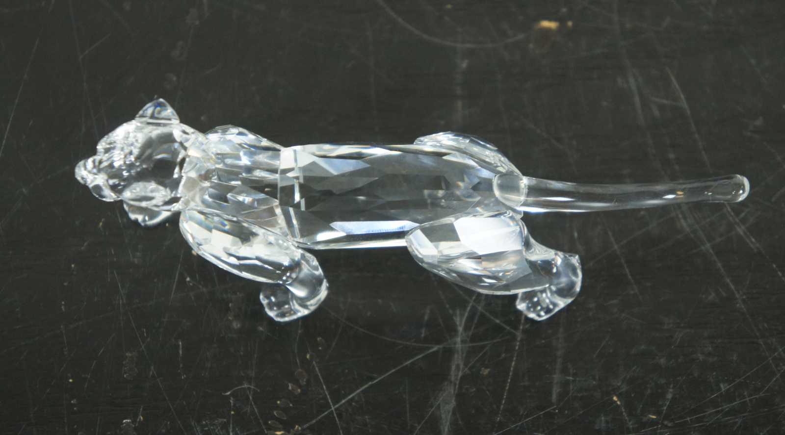 Swarovski crystal figurine in the shape of a stalking panther or similar jungle cat with yellow-green eyes.