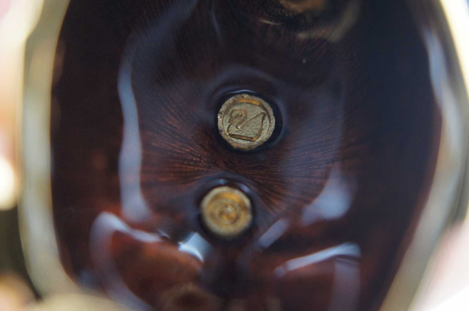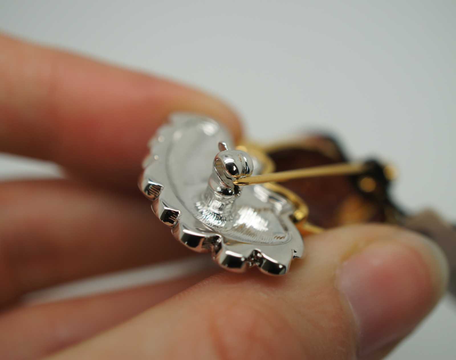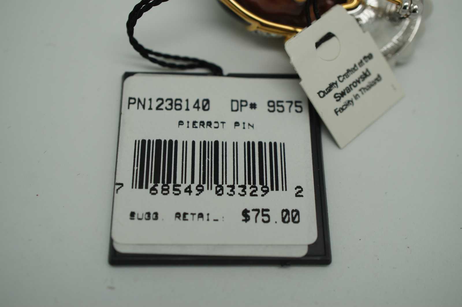 Swarovski crystal brooch featuring the head of the Commedia del Arte character Pierrot with a white crystal encrusted face, golden tear and lips, blue eyes, silver ruff and black enameled cap.
