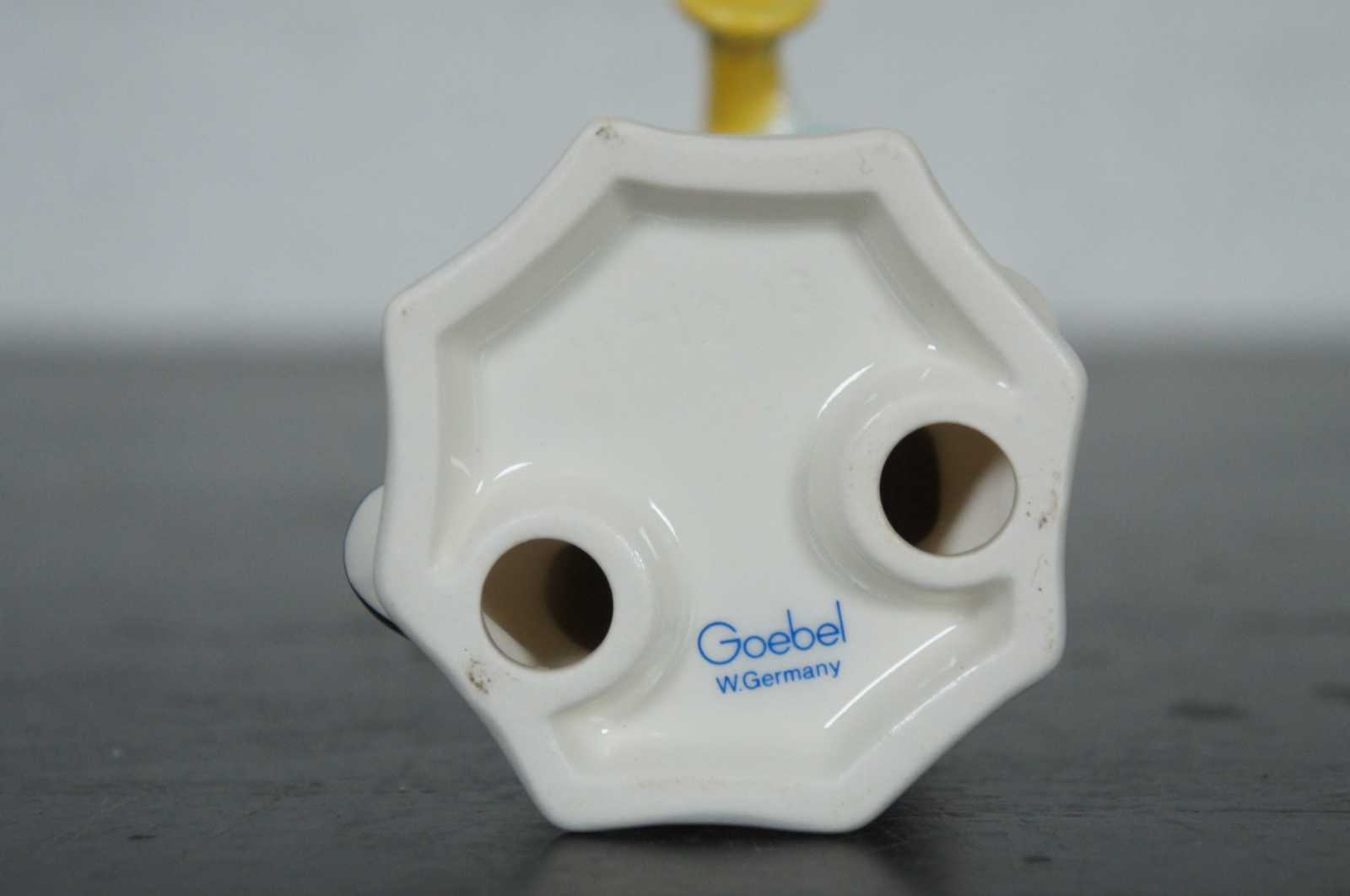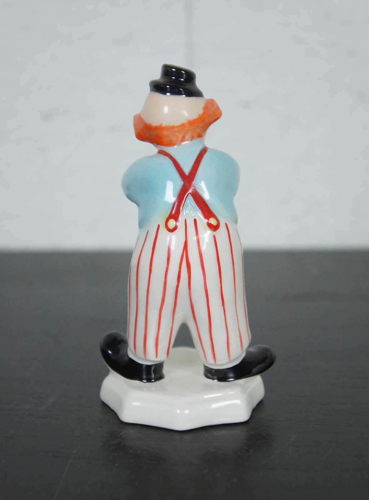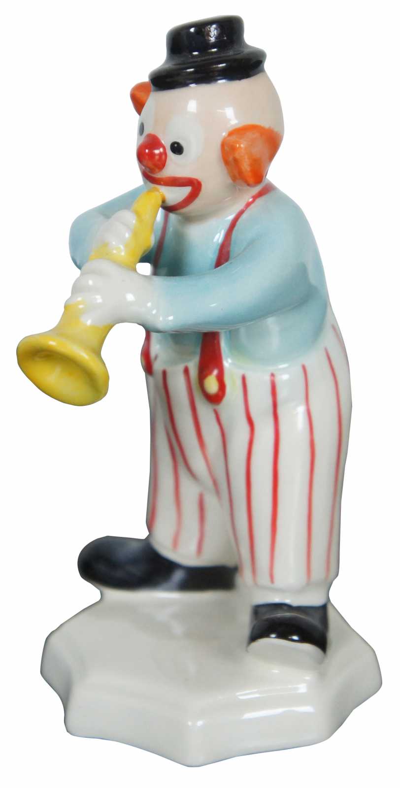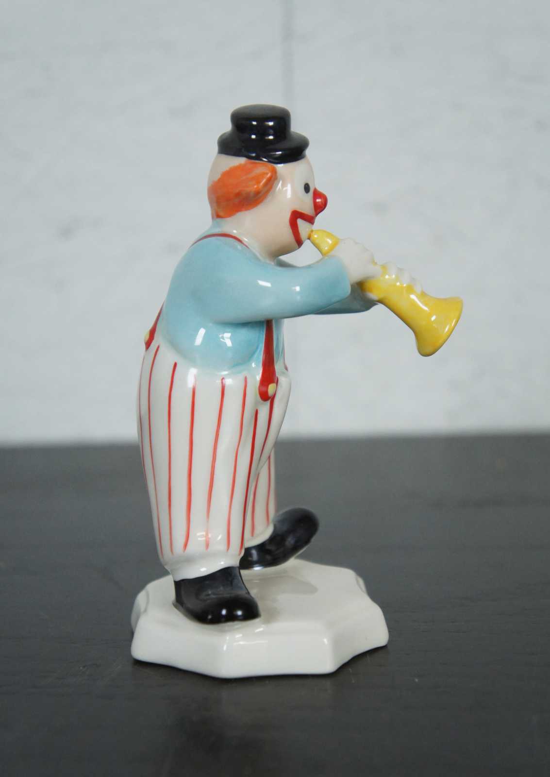 3 Available – Vintage Goebel porcelain red headed clown figurine in a blue shirt, black hat, and striped pants, playing a horn or trumpet.