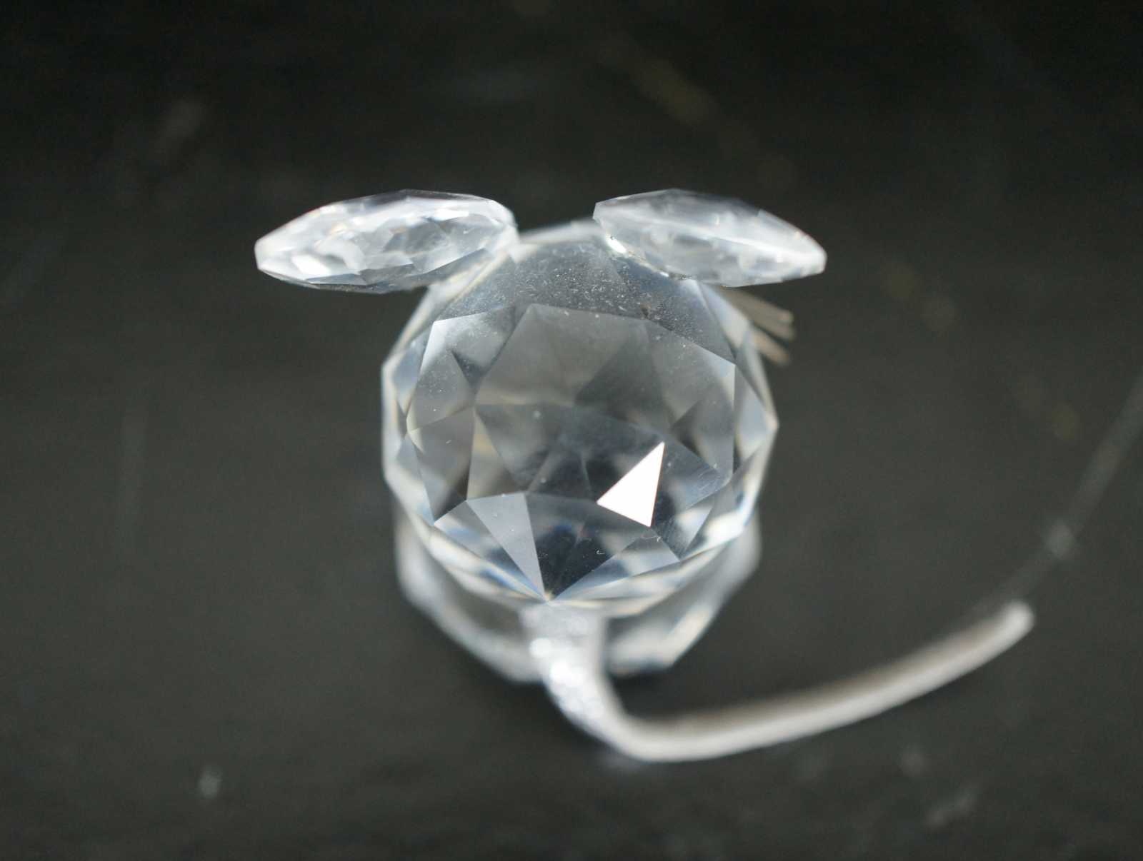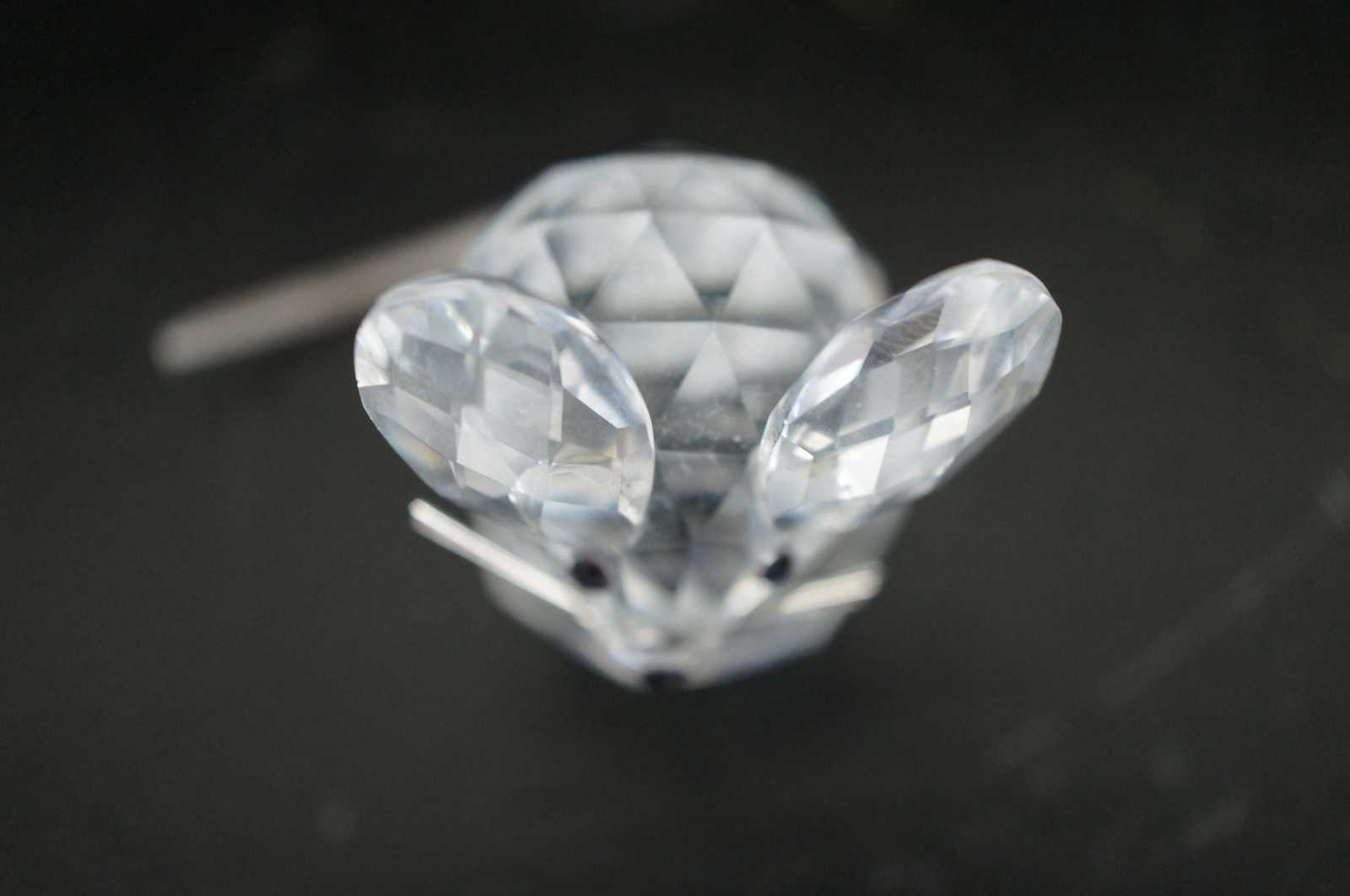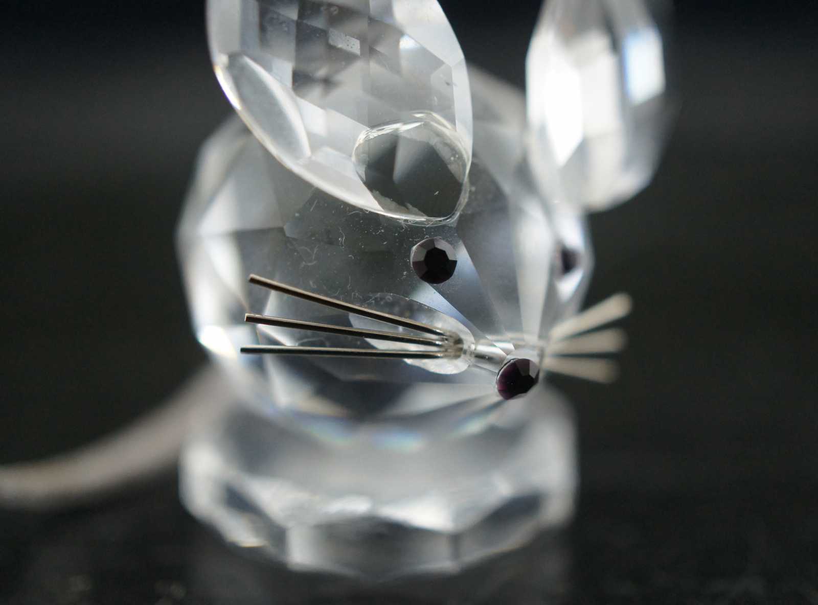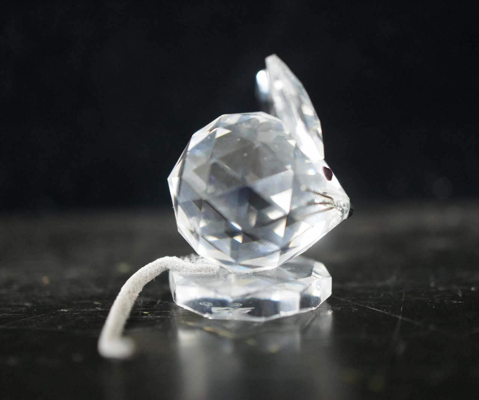 2 Available – Swarovski crystal figurine of a mouse on a small platform with silver whiskers and a shiny leather tail.