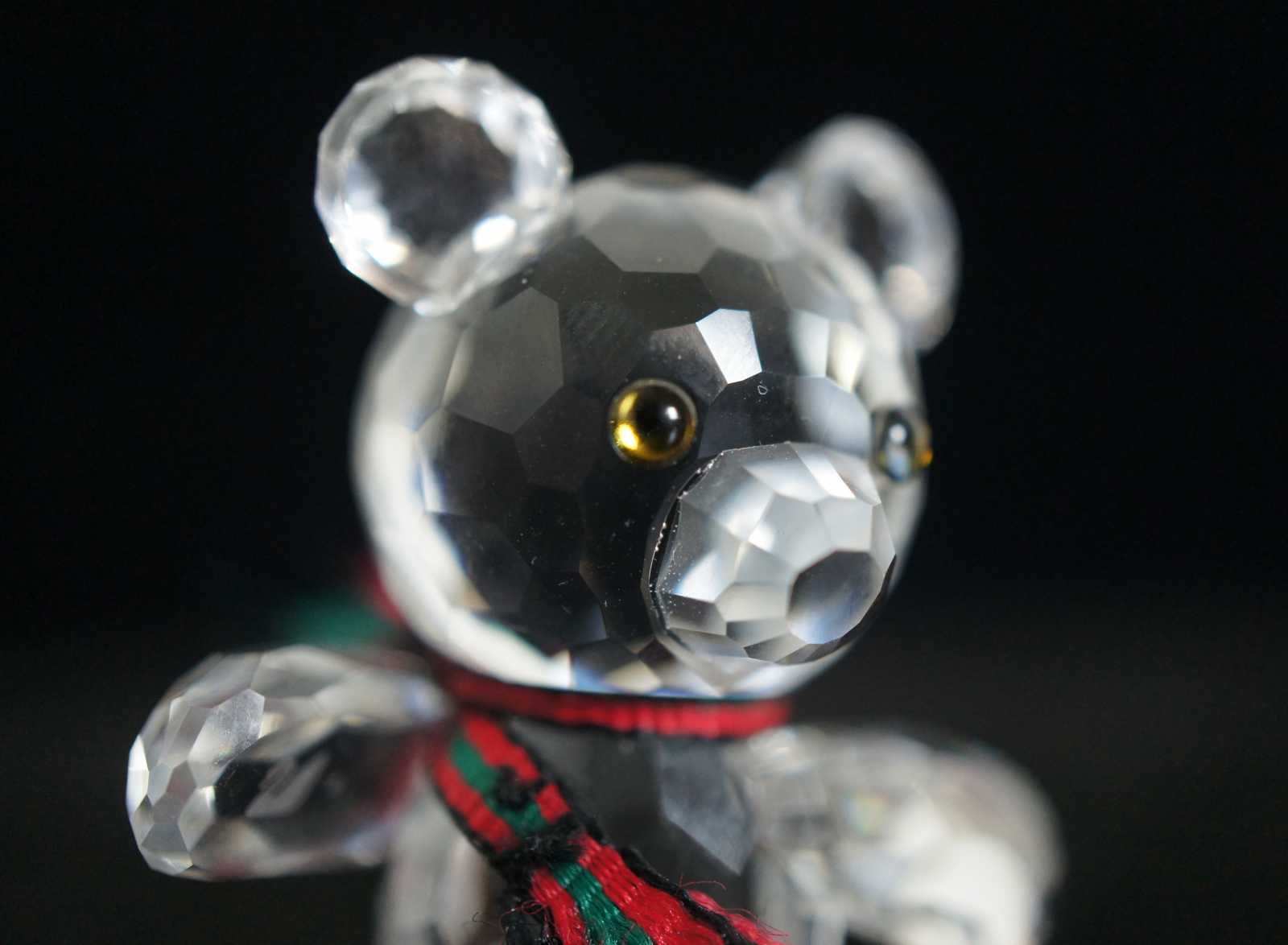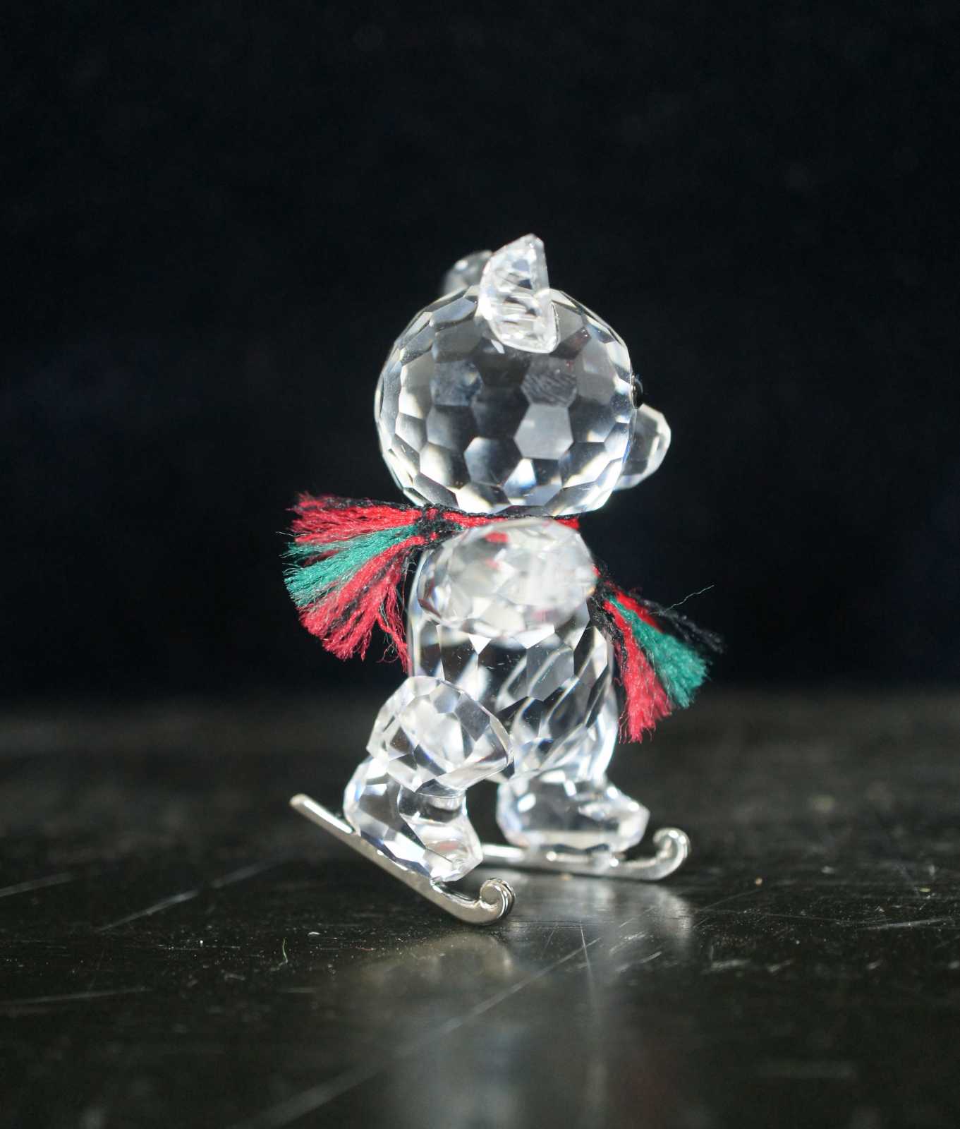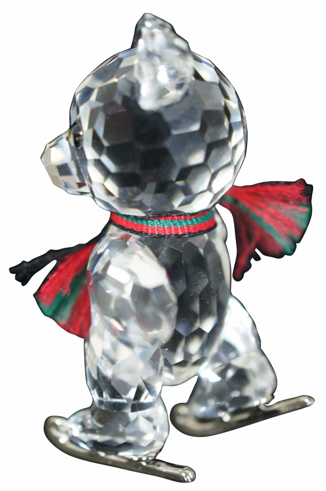 Swarovski crystal Kris bear figurine with silver ice skates and a red and green scarf.