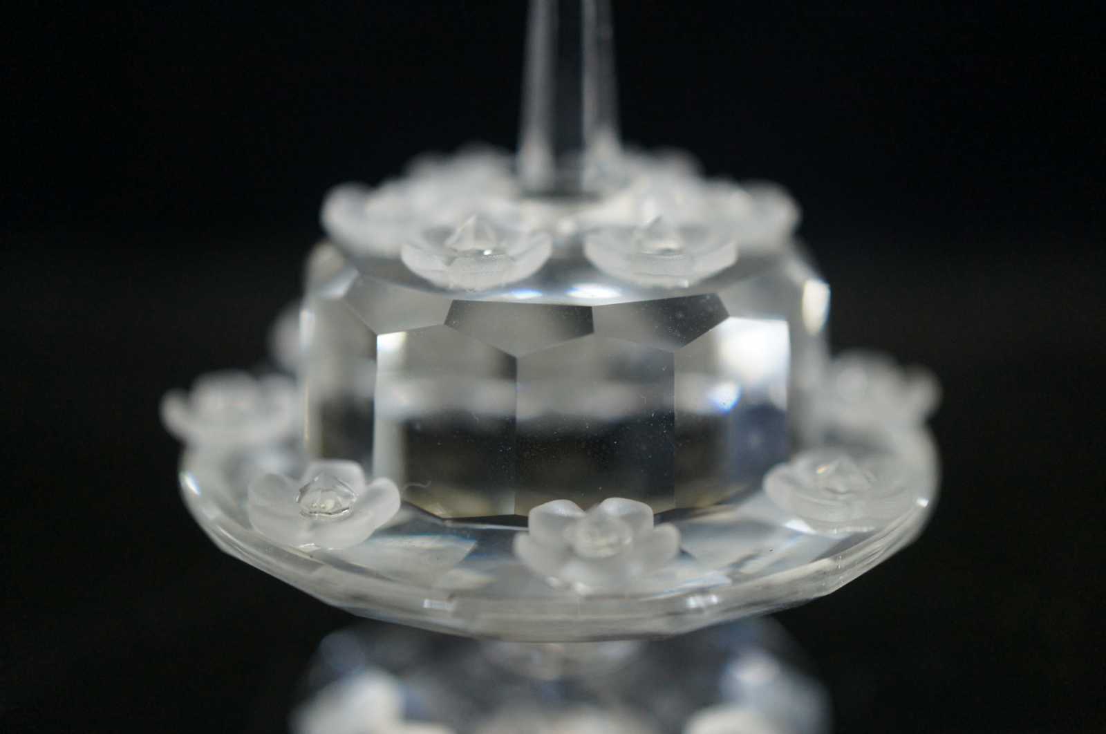 Swarovski SCS 1987-1992 crystal birthday cake figurine featuring flowers on the cake stand and single tier cake with a single candle on top.