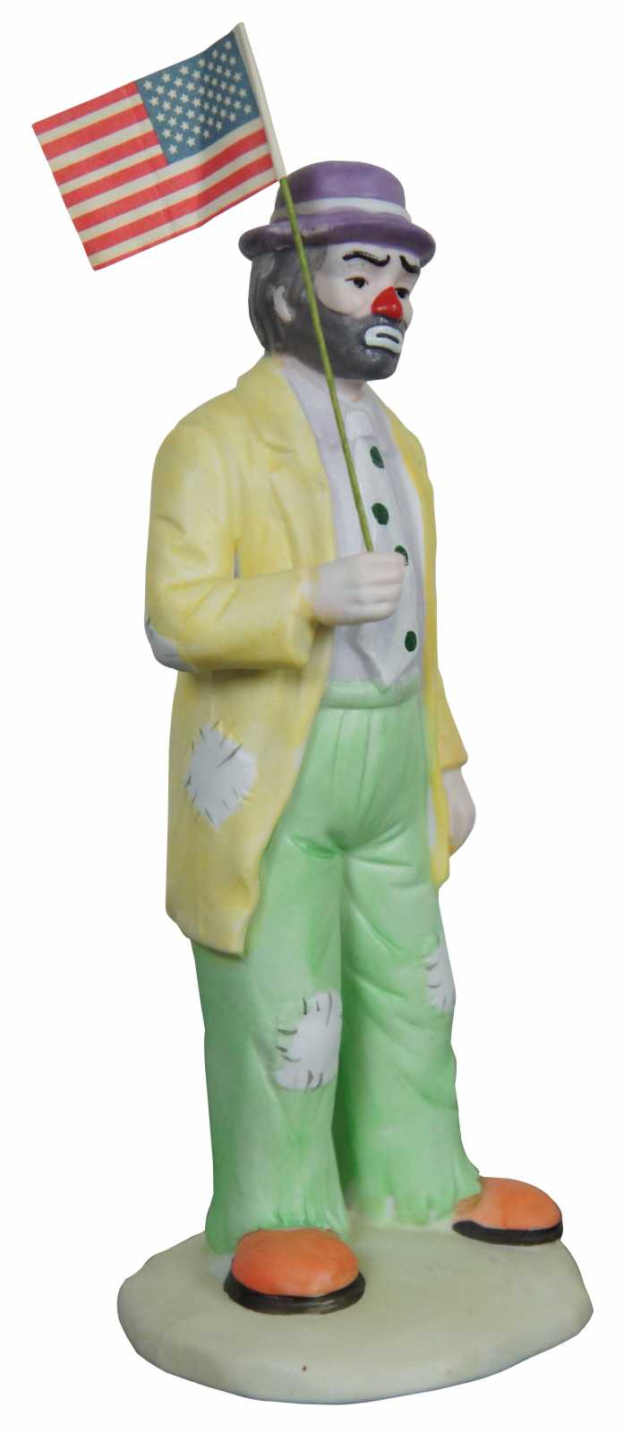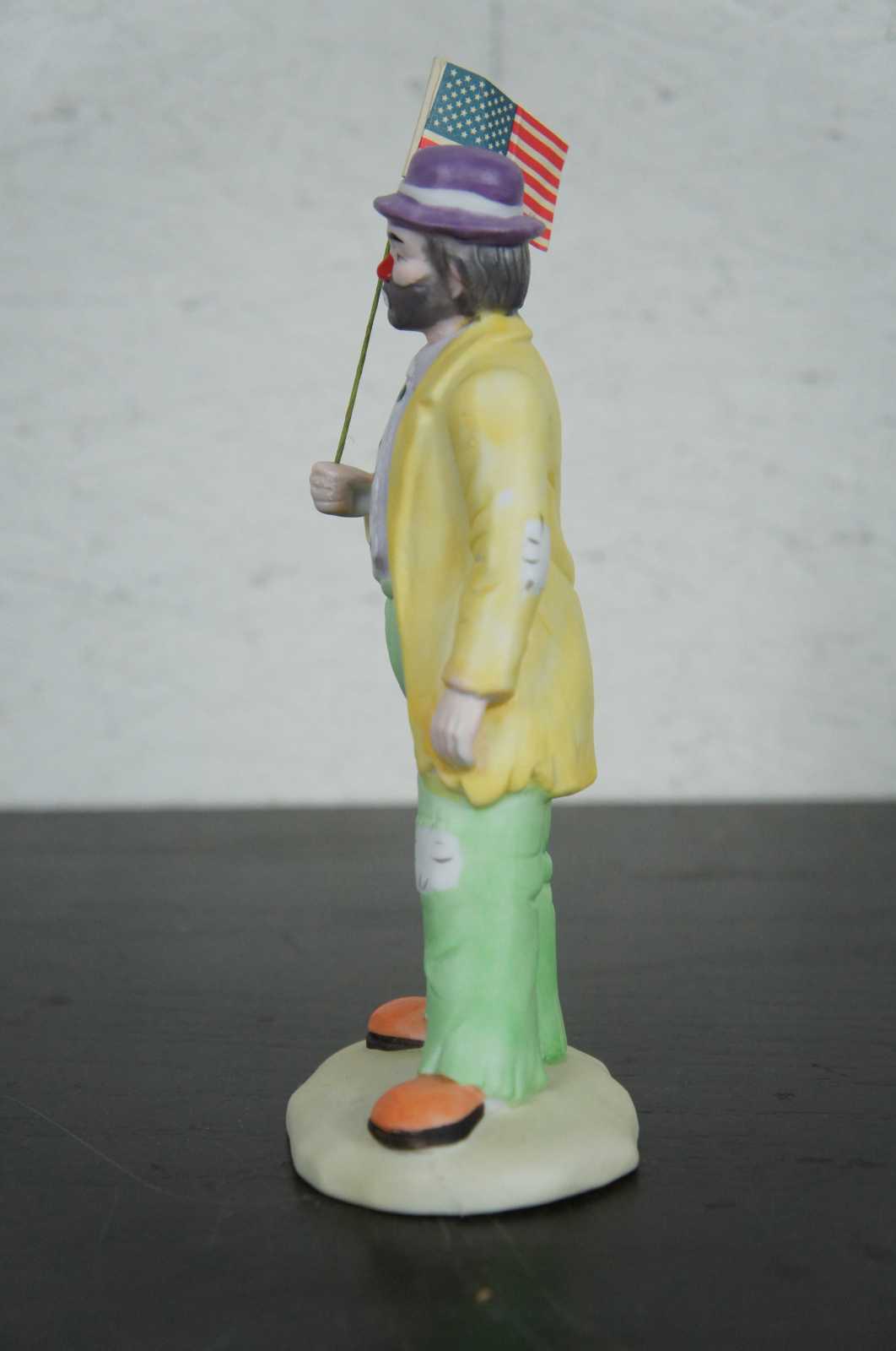 Vintage Flambro porcelain figurine by Emmett Kelly Jr of a hobo clown holding an American flag.
