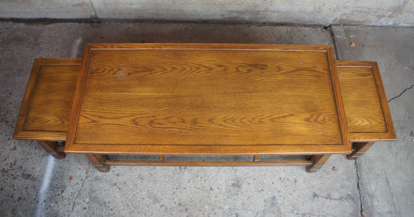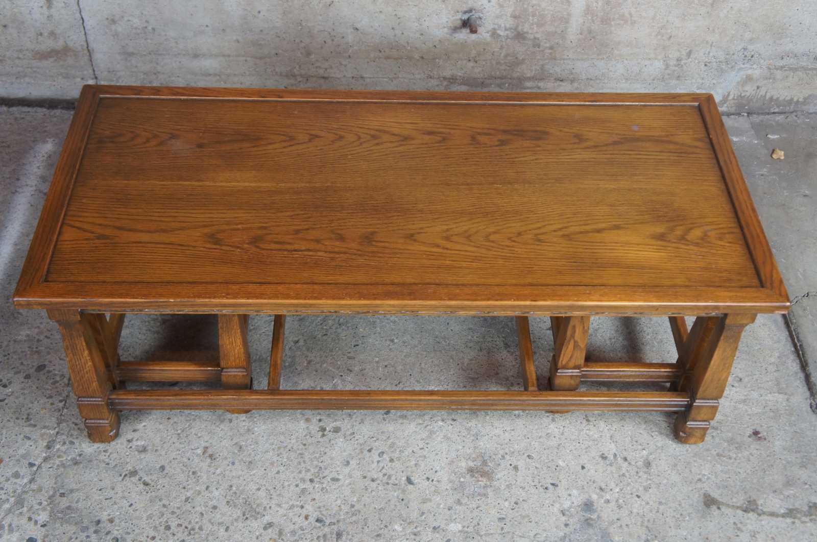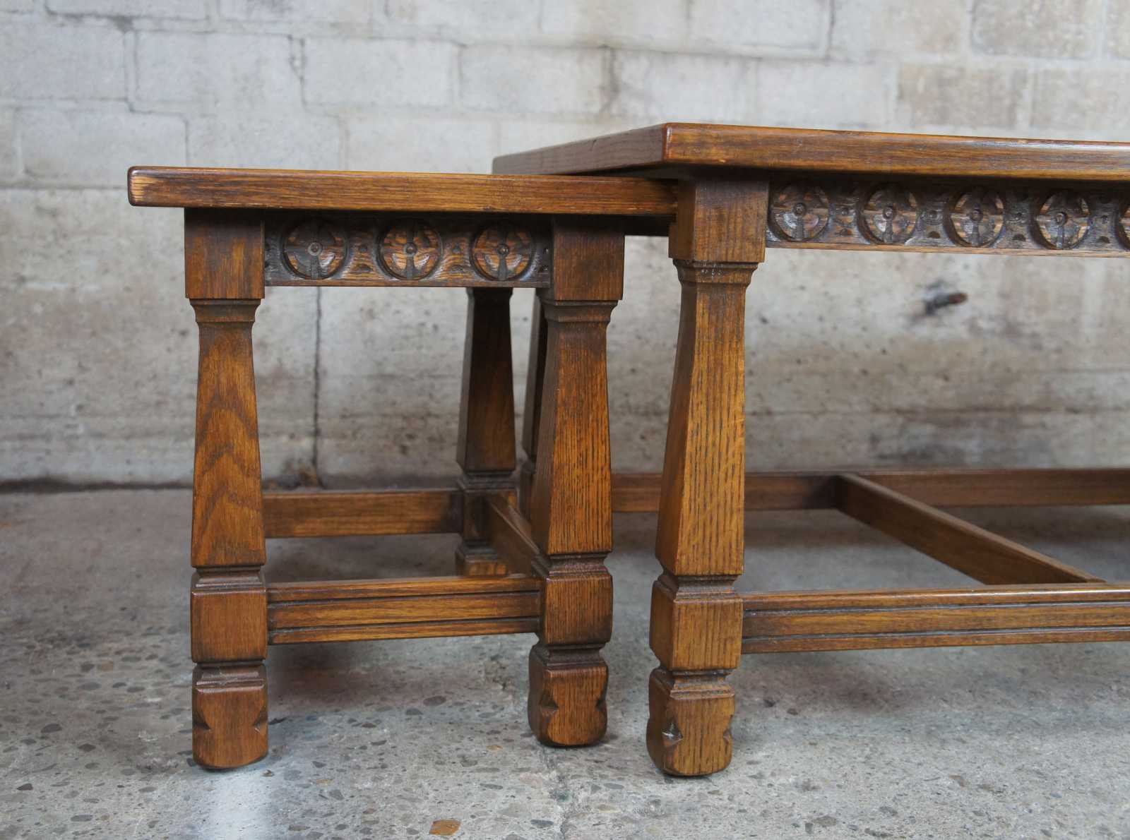 Romweber Viking Oak Nesting Coffee Table, Circa 1960s. Made from solid oak with a carved apron over square tapered legs connected by jointed stretchers.