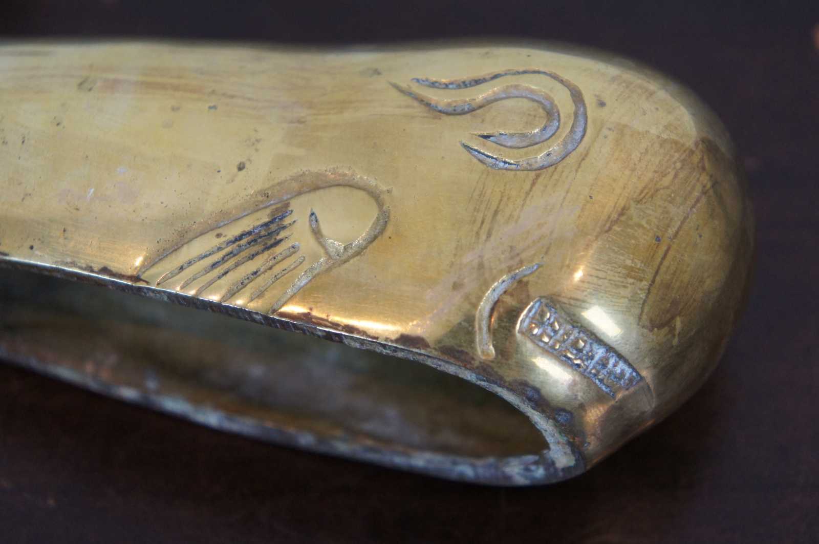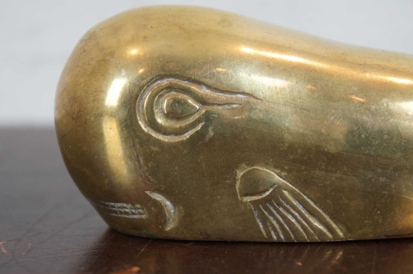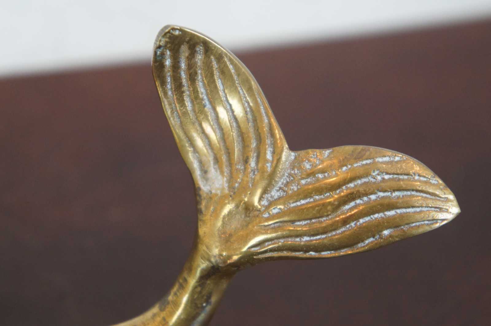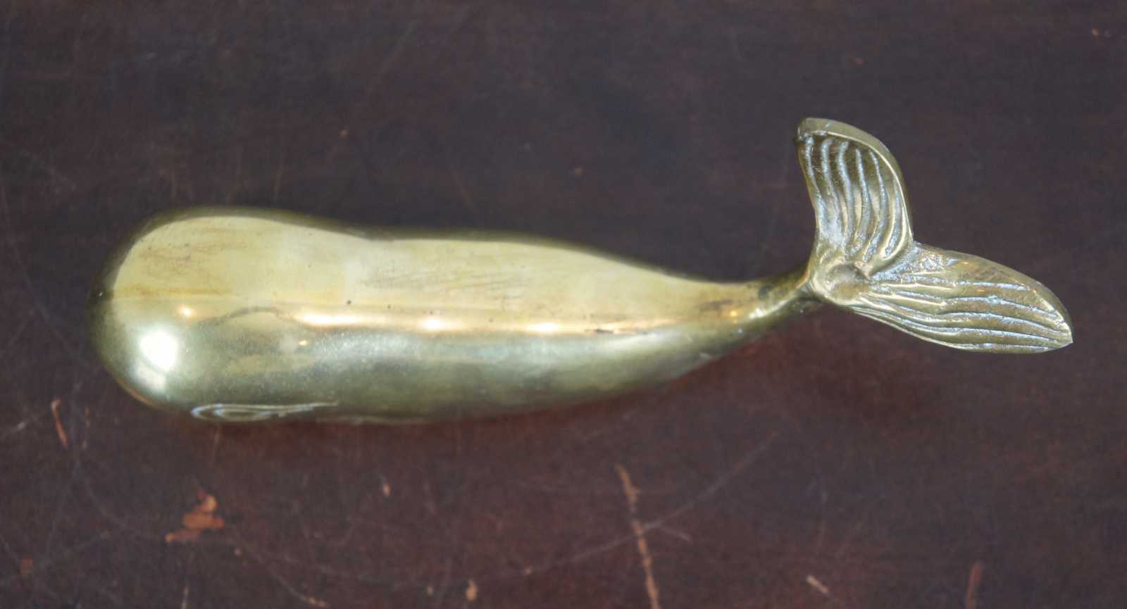 Vintage brass paperweight in the shape of a whale by Penco of New Bradford, Massachusetts.