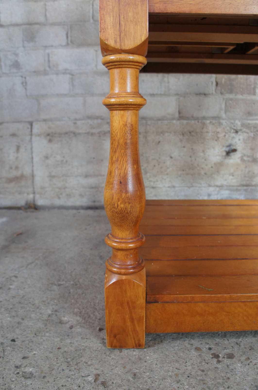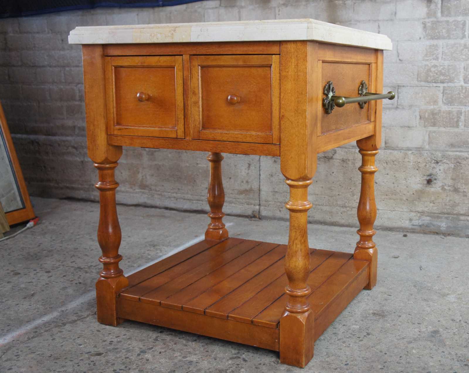Four drawer kitchen island made of birch. Features old world styling with tessellated stone top. Features four drawers and two towel bars.