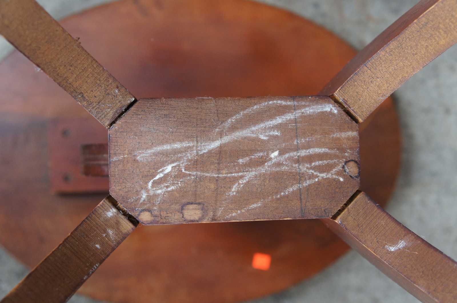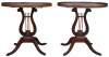 Circa 1940s Duncan Phyfe side tables. Made from mahogany with an oval top featuring an inset table surface with gallery over a harp shape center leading to four legs with brass capped feet.
