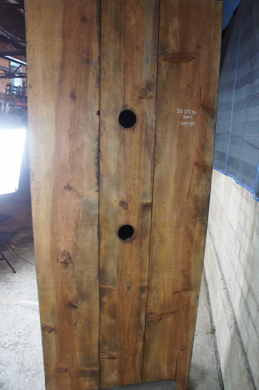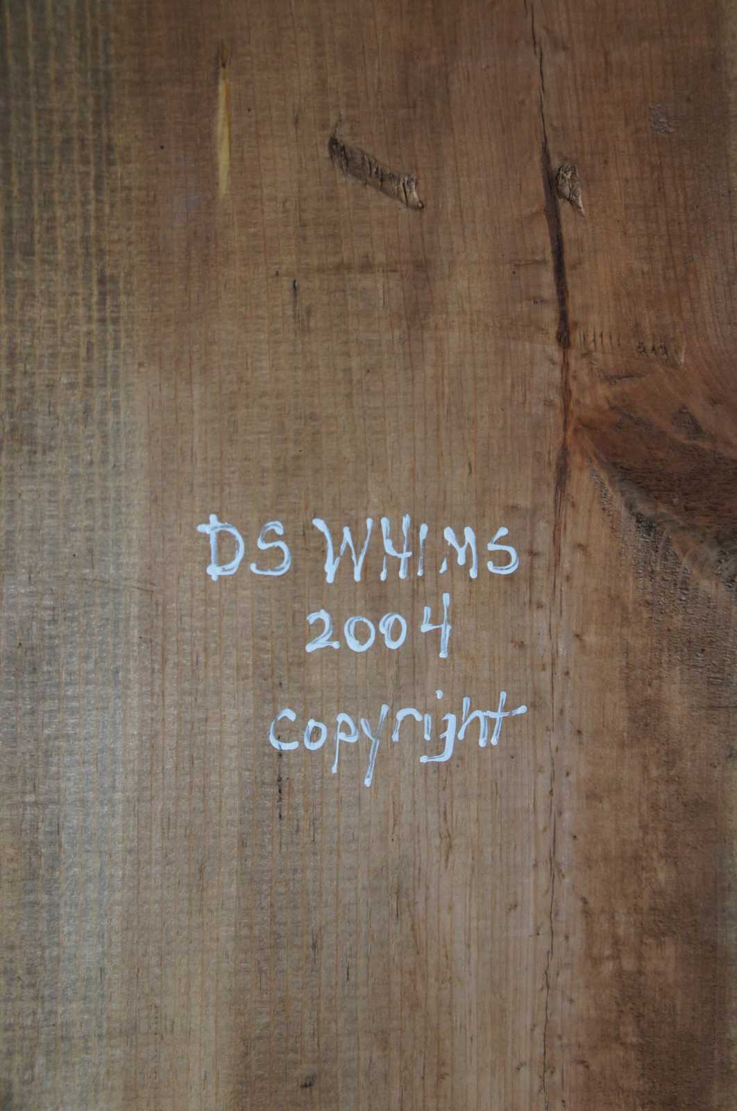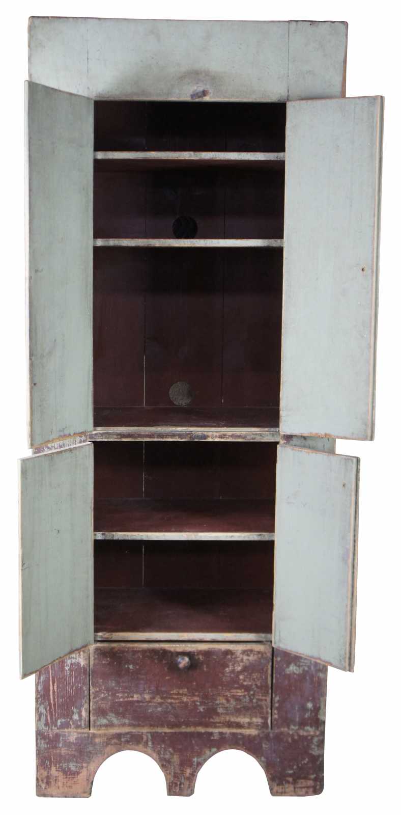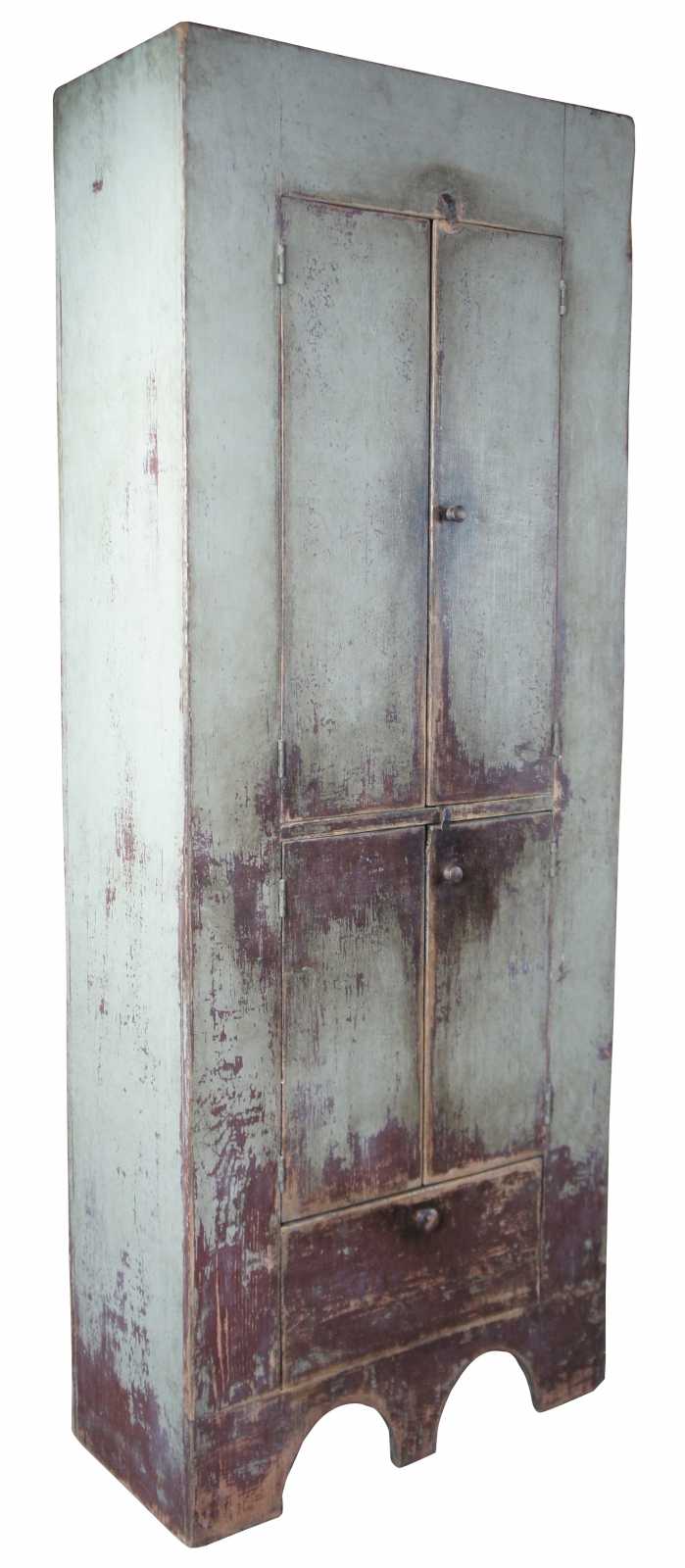 Early American style pine painted cupboard or cabient by DS whims circa 2004. Cabinet features split doors that open to three upper shelves, in addition to the two lower shelves and drawer. Signed along the back.