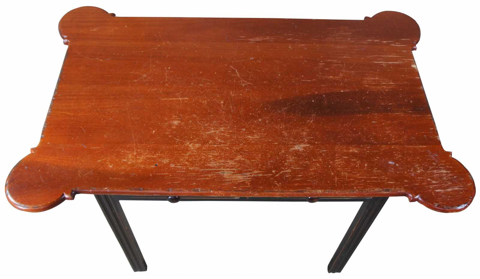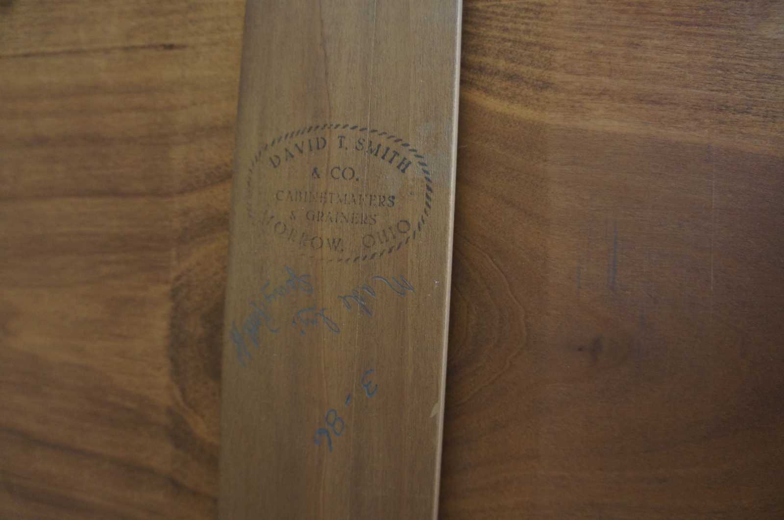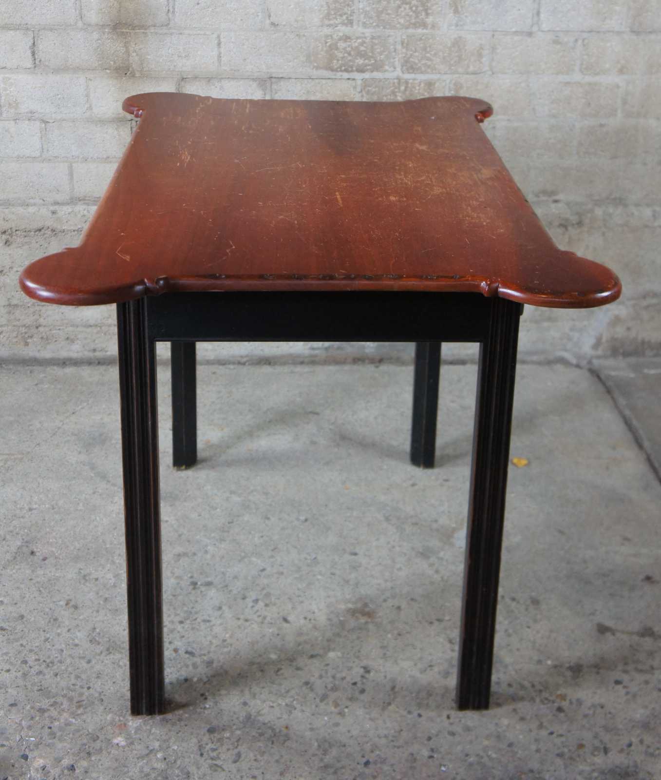 Late 20th century porringer top table by David T Smith. Features a parcel ebonized base in traditional fasion with fluted legs. Includes two dovetailed drawers marked on the underside. Circa 1986.