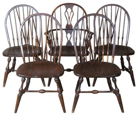 Circa 1970s Cushman Colonial Stone House Collection Windsor dining chairs. The Stone House Collection was by General Interiors for HT Cushman Manufacturing Company.