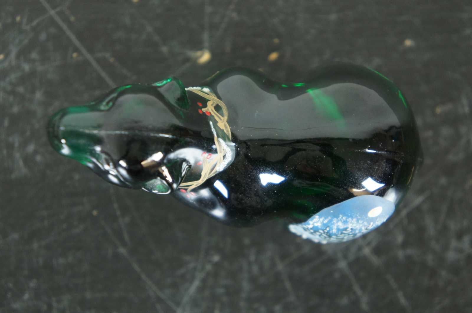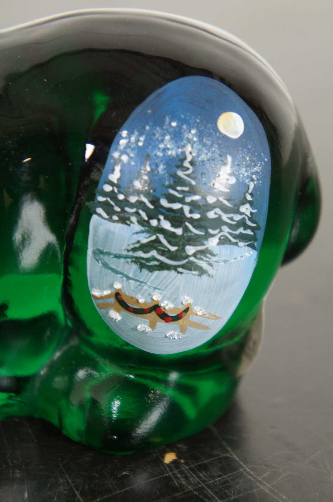 Fenton glass Vermont Skies hand painted Christmas polar bear figurine with gold holly wreath collar and pine forest / winter landscape on rump.