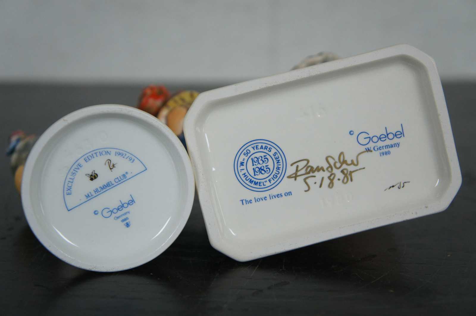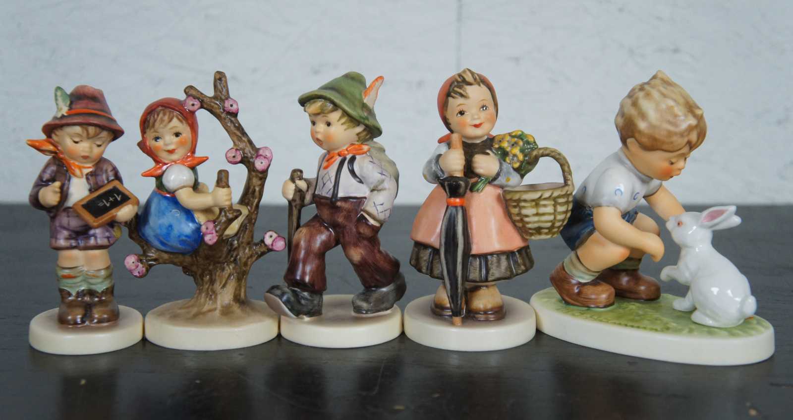 33 Goebel West Germany Hummel ceramic figurines. Lot includes: 50th Anniversary Jubilee #416 Signed, Valentine Joy #399 Exclusive Special Edition No. 4 Goebel Collectors Club 1979, Which Hand #258, My Wish is Small #463/0 Exclusive Edition 1992/93 MI Hummel Club, What Now #422 Exclusive Edition No. 7 1981, 2 Birthday Candle #440 Exclusive Special Edition No. 10 Goebel Collectors Club 1983, The Surprise #431 Exclusive Special Edition No. 12 1981, Sweet Music #186, Happy Traveler #79 1991 Final Issue, Final Issue 1990 Signs of Spring #203/1, Happy Birthday #176/0, Going to Grandma’s #52/0, Village Boy #51 2/0, Smiling Through #408/0 Exclusive Special Edition No. 9 Goebel Collectors Club 1983, On Holiday #350, MI Hummel Museum New Braunfels, Texas Plaque #756, 2 Millenium 2000 MI Hummel Plaque #900, Grandpa’s Boy #562 First Issue 1991, Private Conversation #615 Exclusive Edition 1999/2000 MI Hummel Club, One Plus One #556 First Issue 1993 Special Event, Apple Tree Girl #741 3/0, 2 Coffee Break #409 Exclusive Special Edition No. 8 1976, The Poet #3973/0 Exclusive Edition 1998/99 MI Hummel Club, ABC Stunde aka Honor Student #2087/8 MI Hummel Club Membership Year 2000/2001, Forever Yours #793 MI Hummel Club First Issue 1996/97, Chick Girl #57/0, Knit One, Purl One #432 Signed, Goodnight Angel #357, Joyous News #238A (angel with mandolin), Joyous News (angel with accordion) #238B.