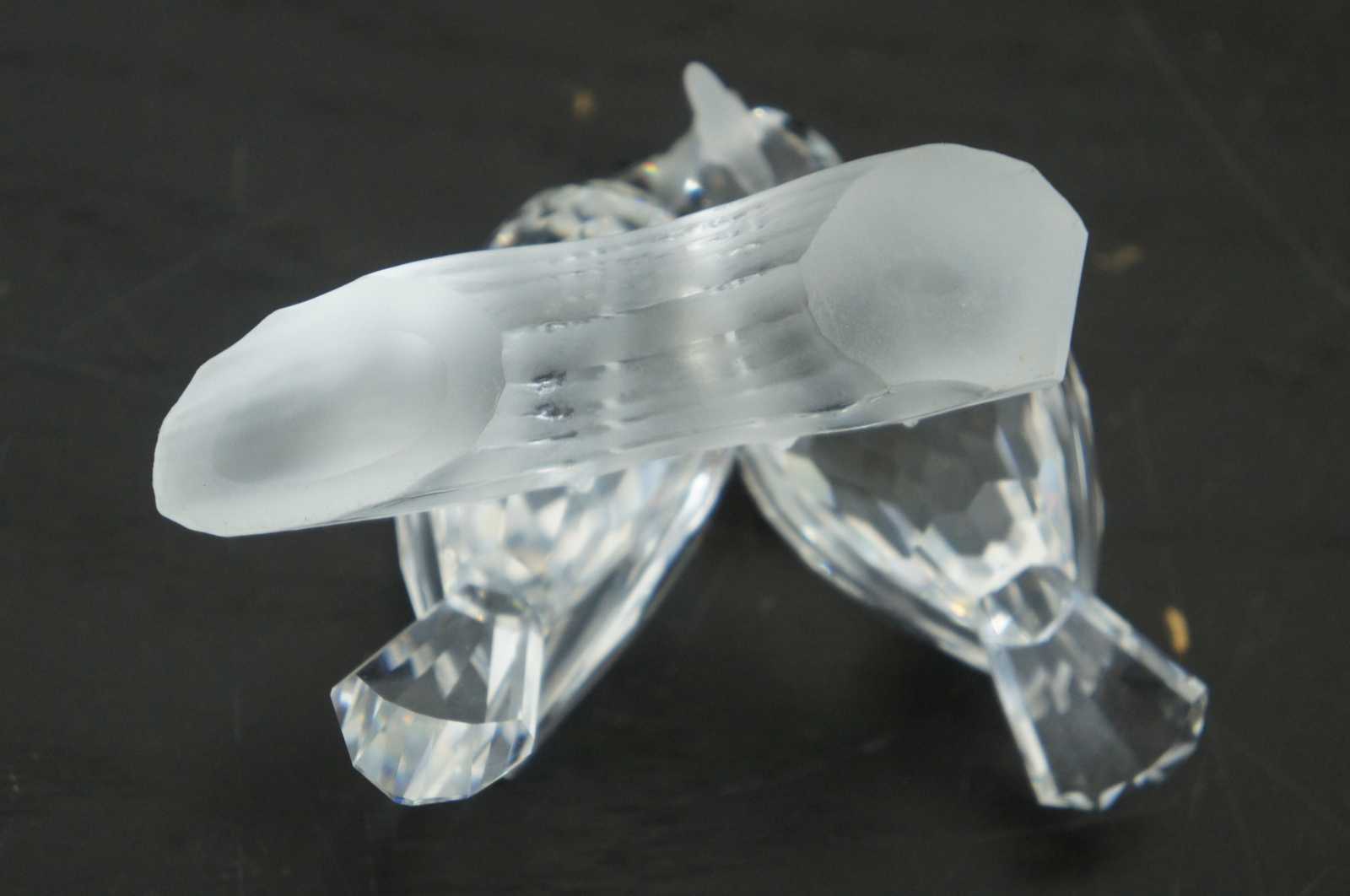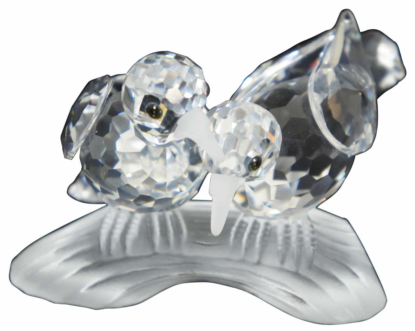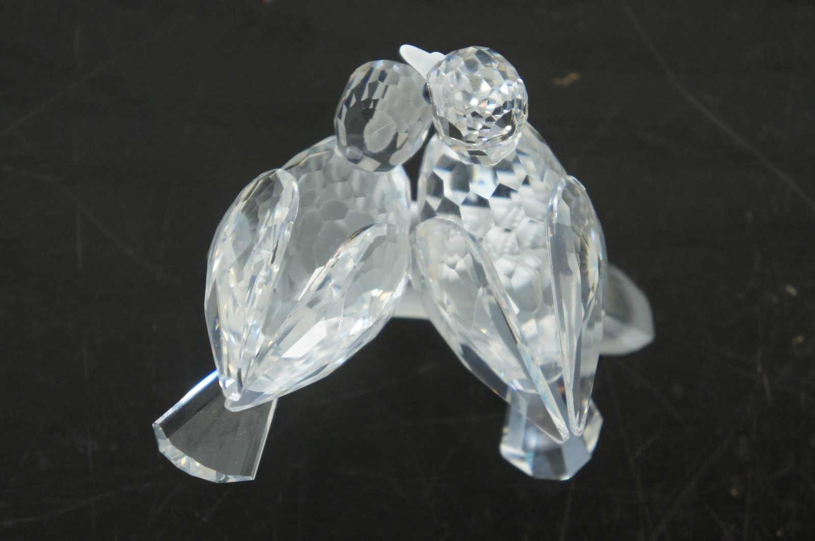 Swarovski crystal 1989 figurine of a pair of turtledoves on a tree branch.